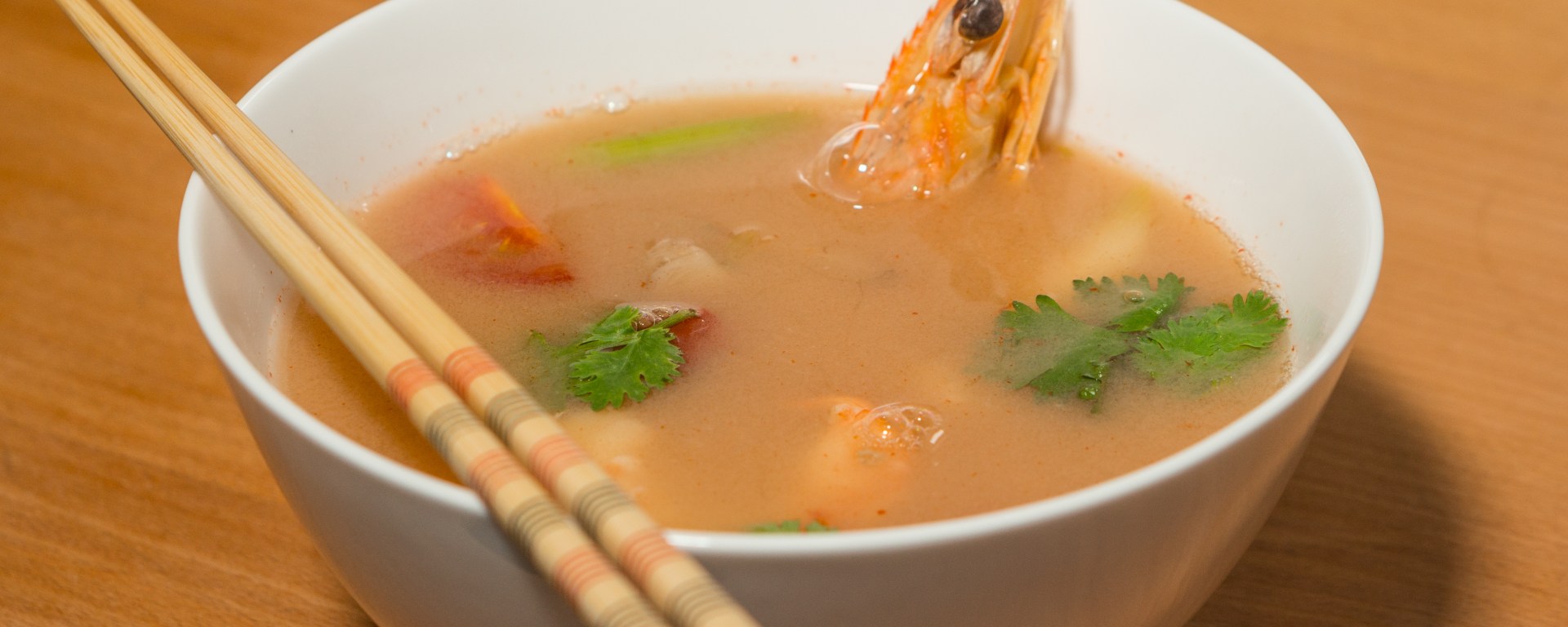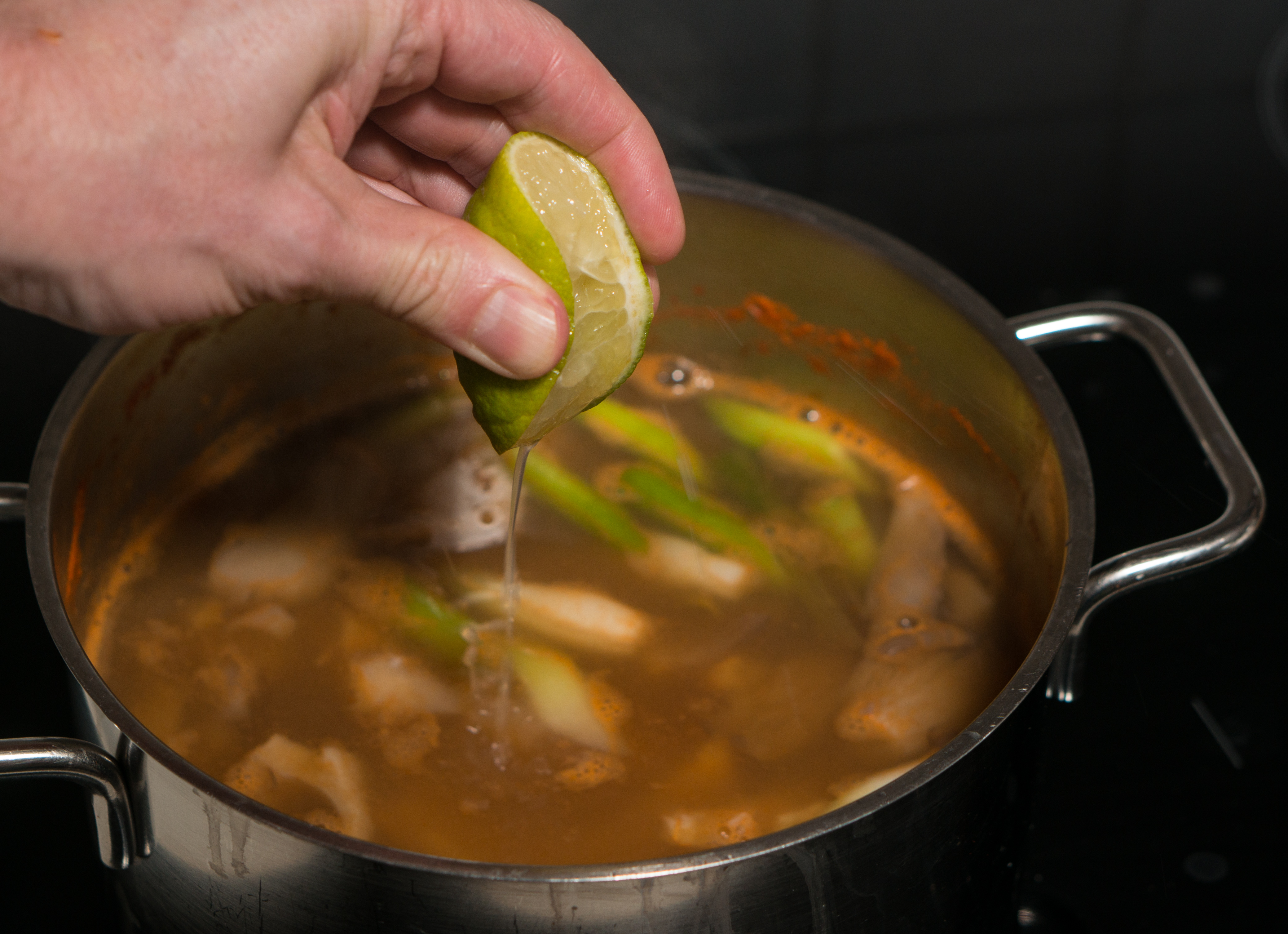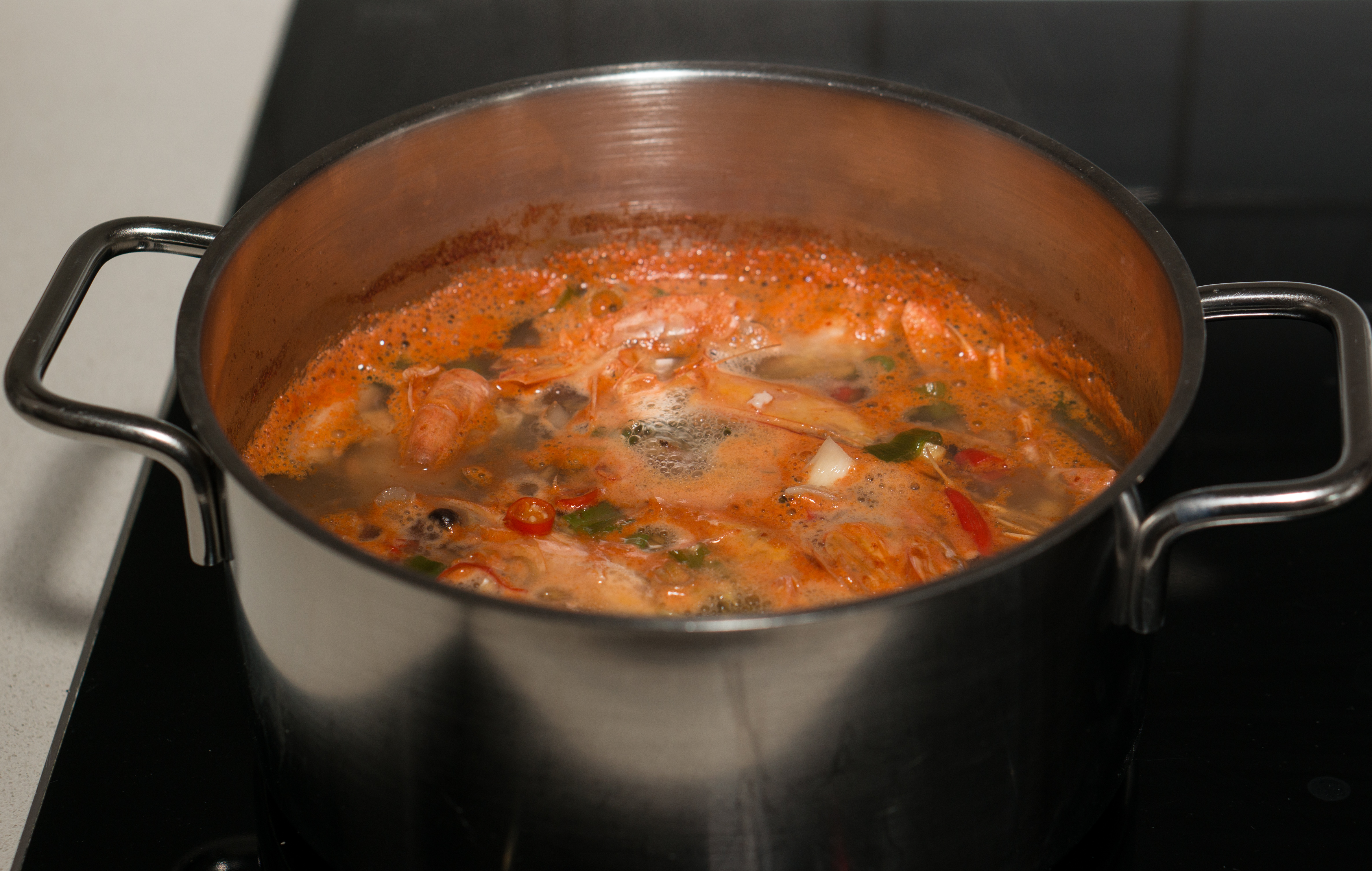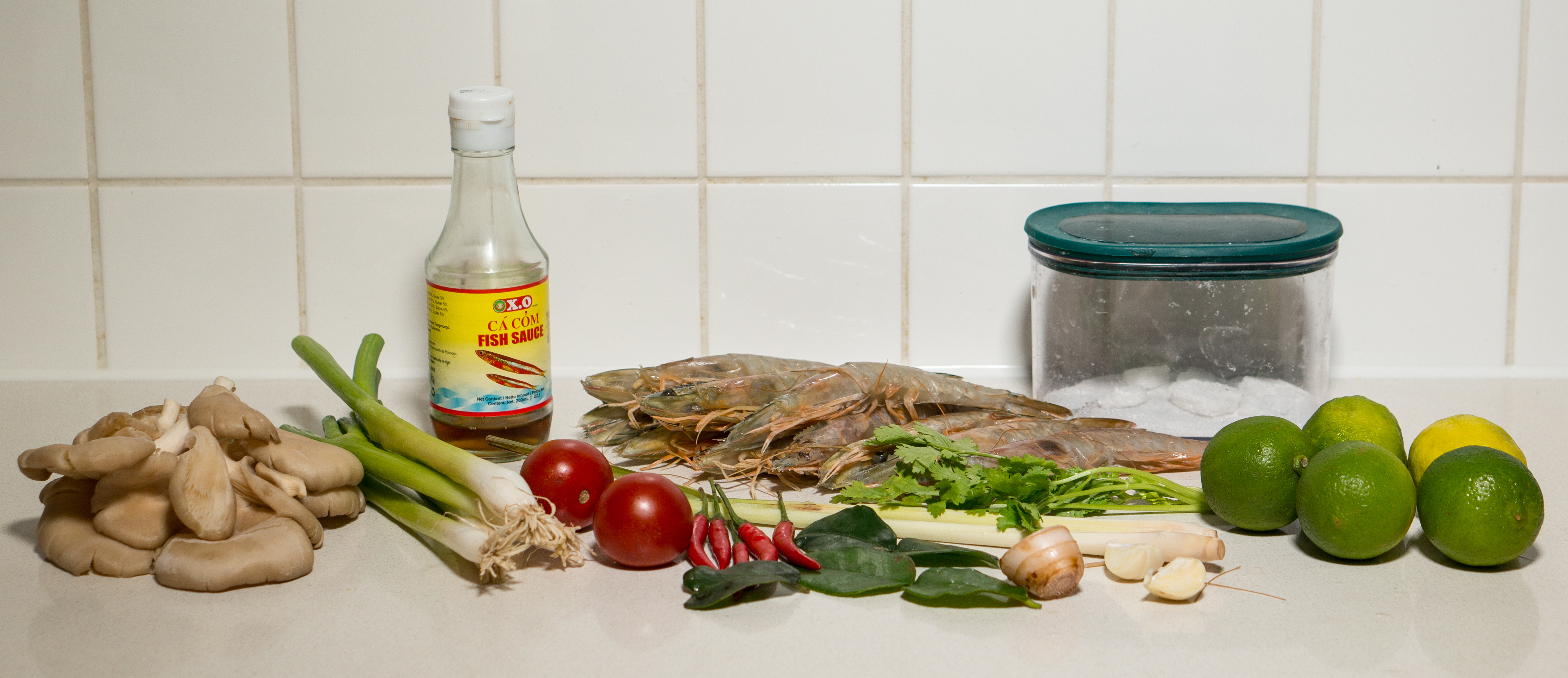 My friend Melvin is great at cooking Asian dishes, and recently he made tom yum goong for us. This is a sour (from lime) and spicy (from chillis) Thai soup with shrimp. We liked it a lot, so I wanted to try making it, too. You can decide on how spicy you’d like it by adjusting the number of chilli peppers. Using the shrimp heads and shells gives the stock a great shrimp flavor. I opted to serve it with only the pieces you are going to eat, and remove the stock ingredients before serving. Here is my version.