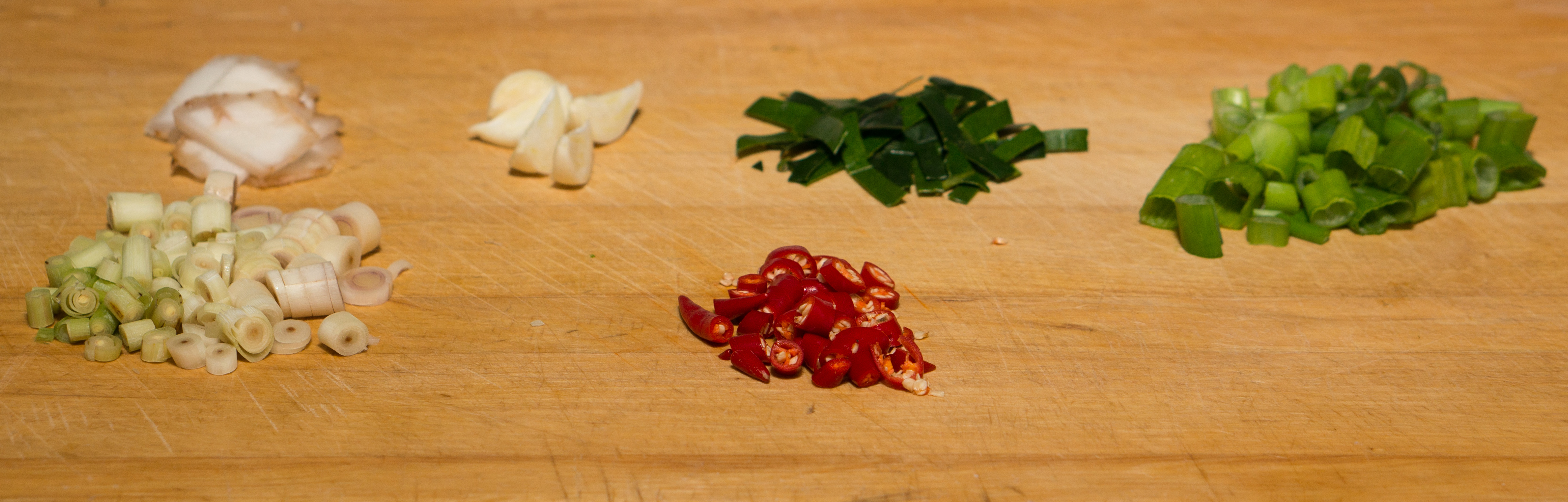 Slice the galangal, lemon grass, garlic, lime leaves, chillis, and green part of the scallions (reserve the white part).