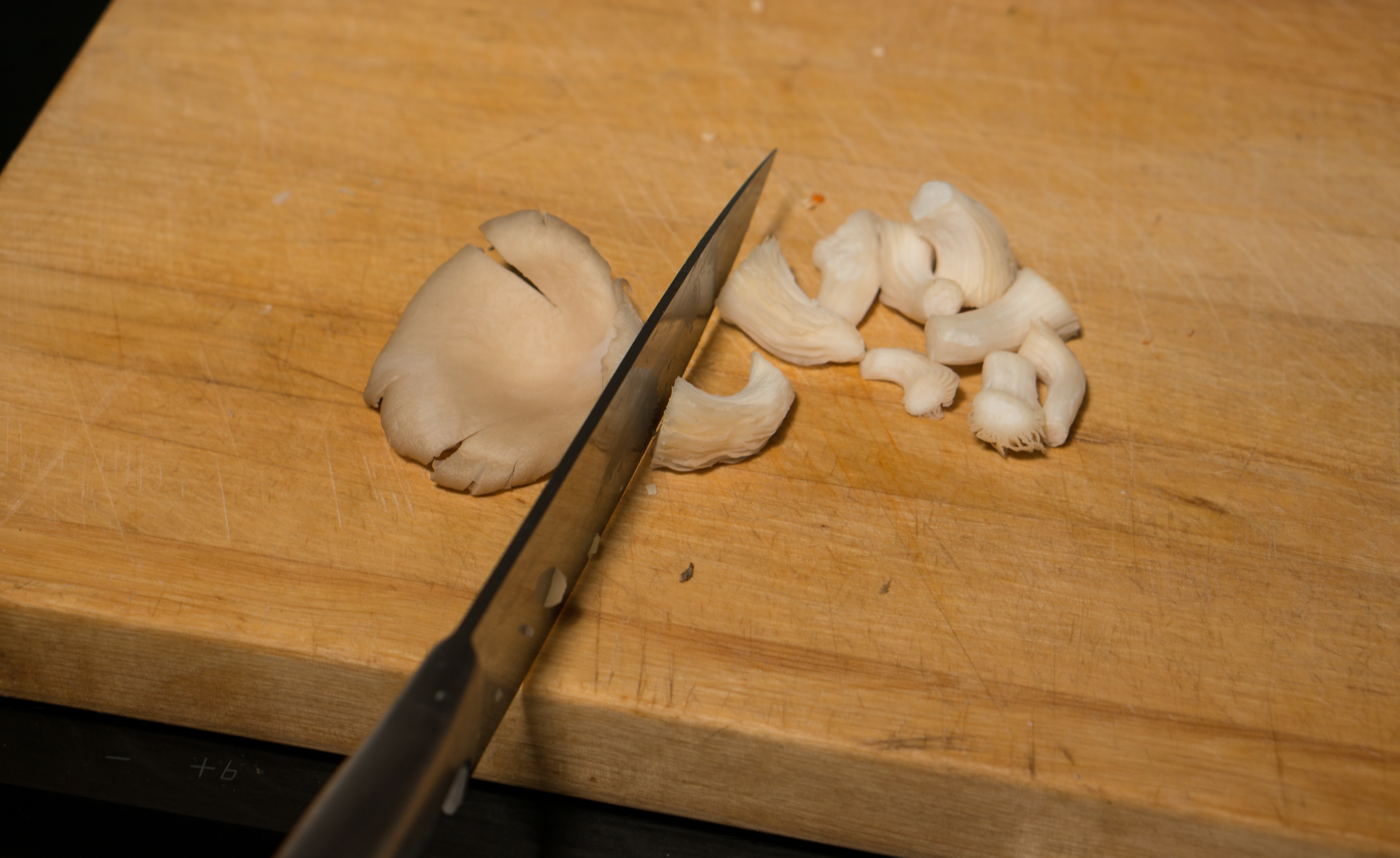 Remove the stems from the mushrooms. Slice the mushrooms themselves into bite size pieces if they are large, and reserve.