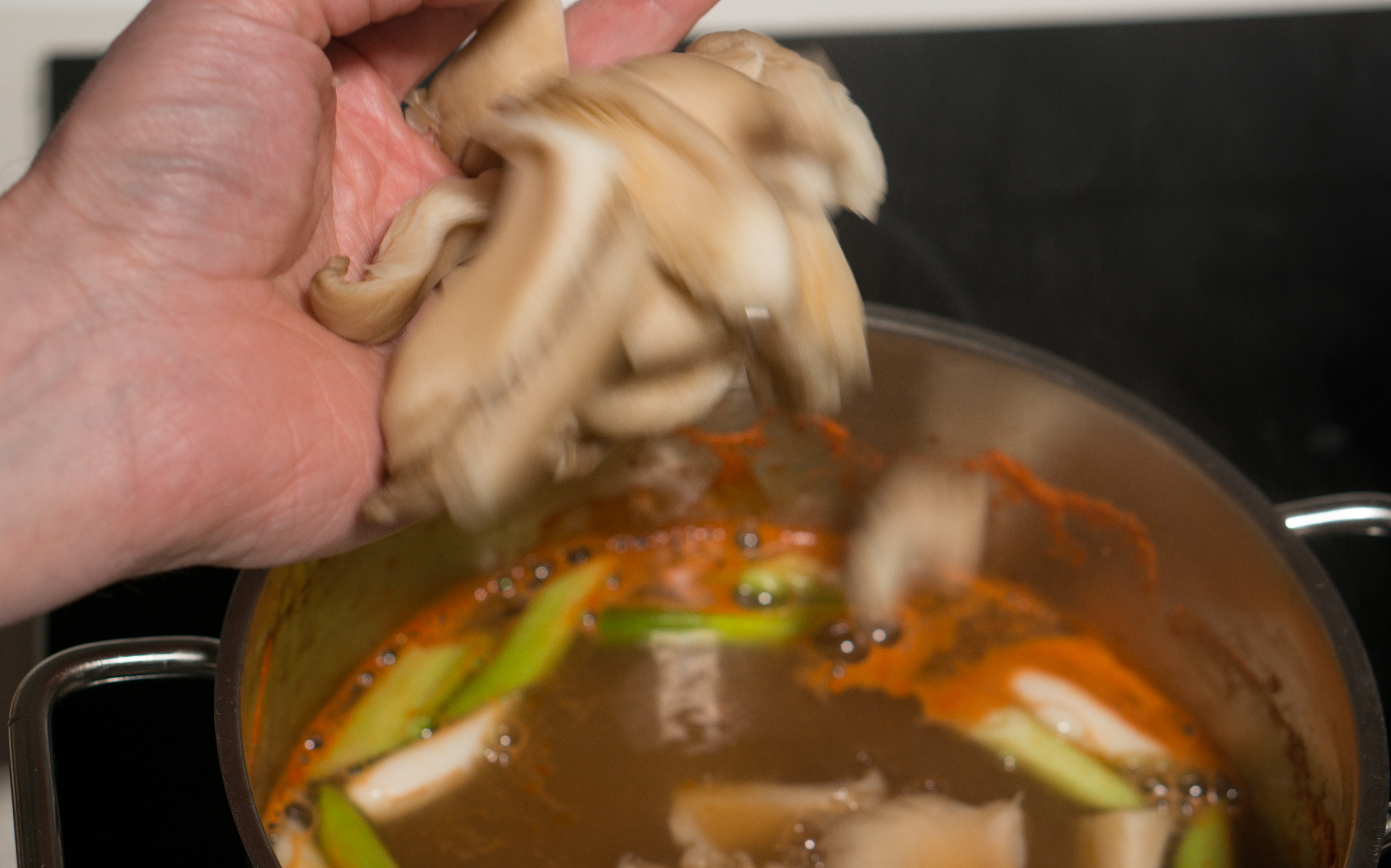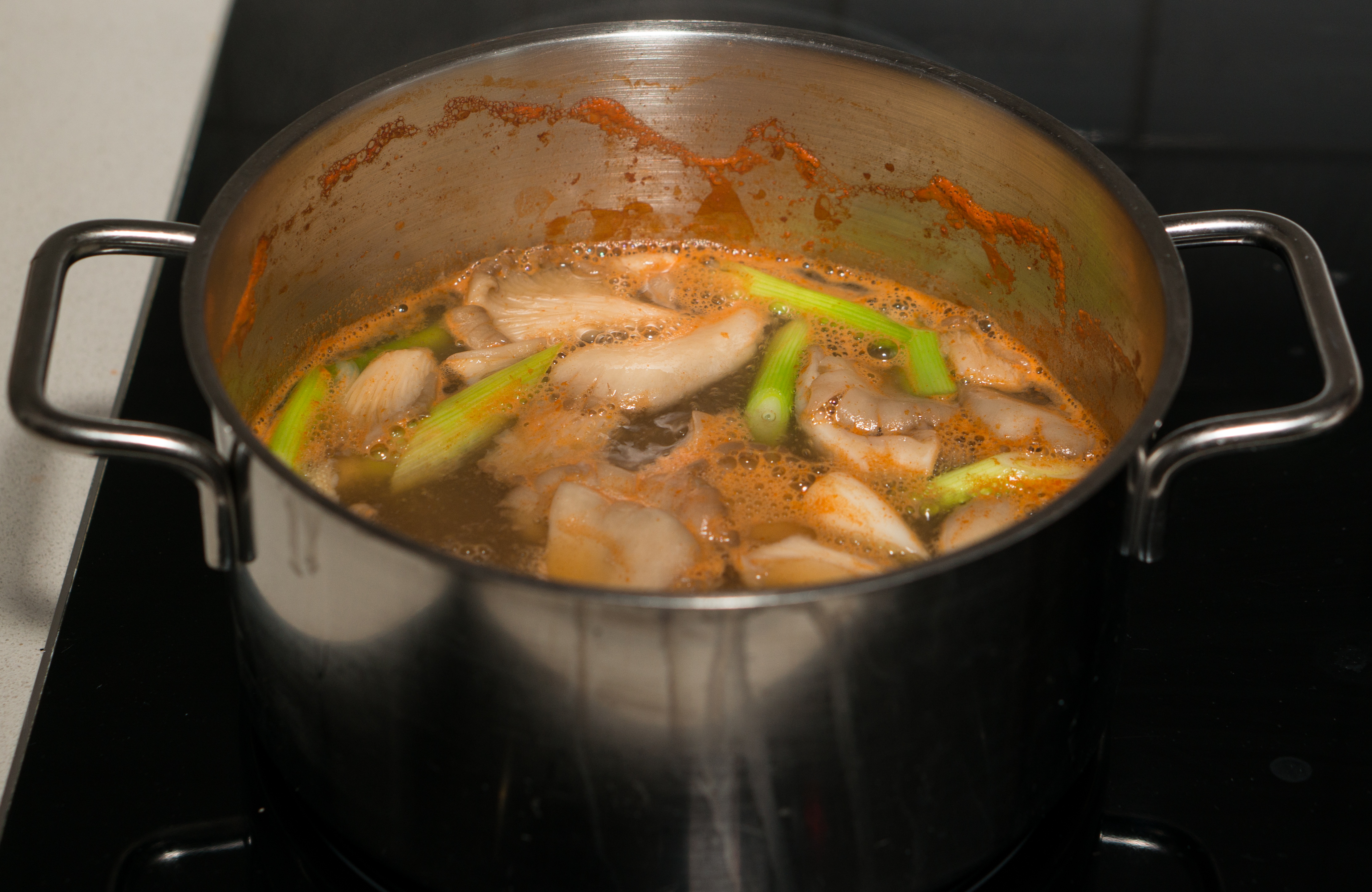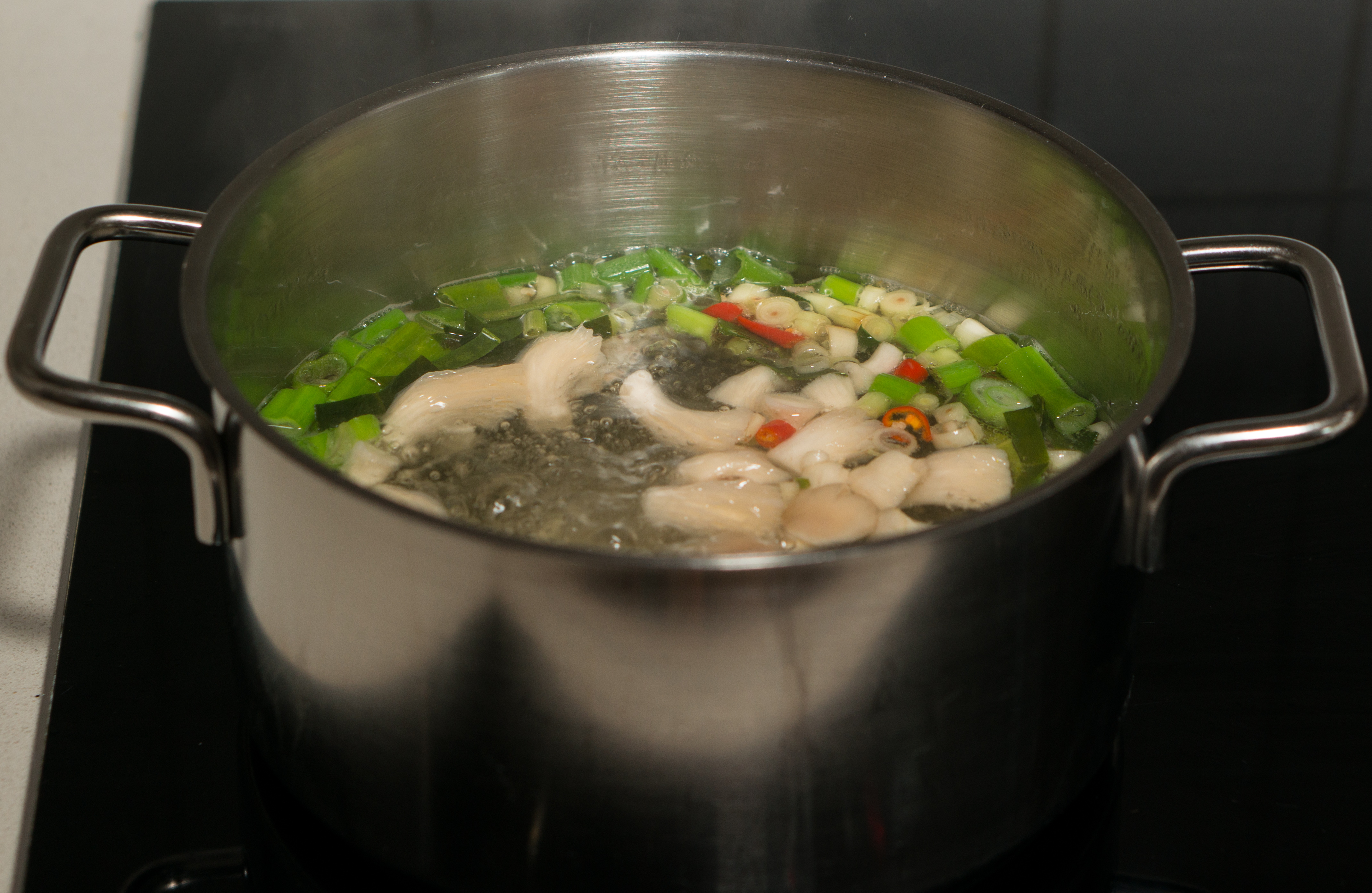 Put the aromatics and the mushroom stems in a pot with 1 litre (4 cups) of water, and bring to a boil.