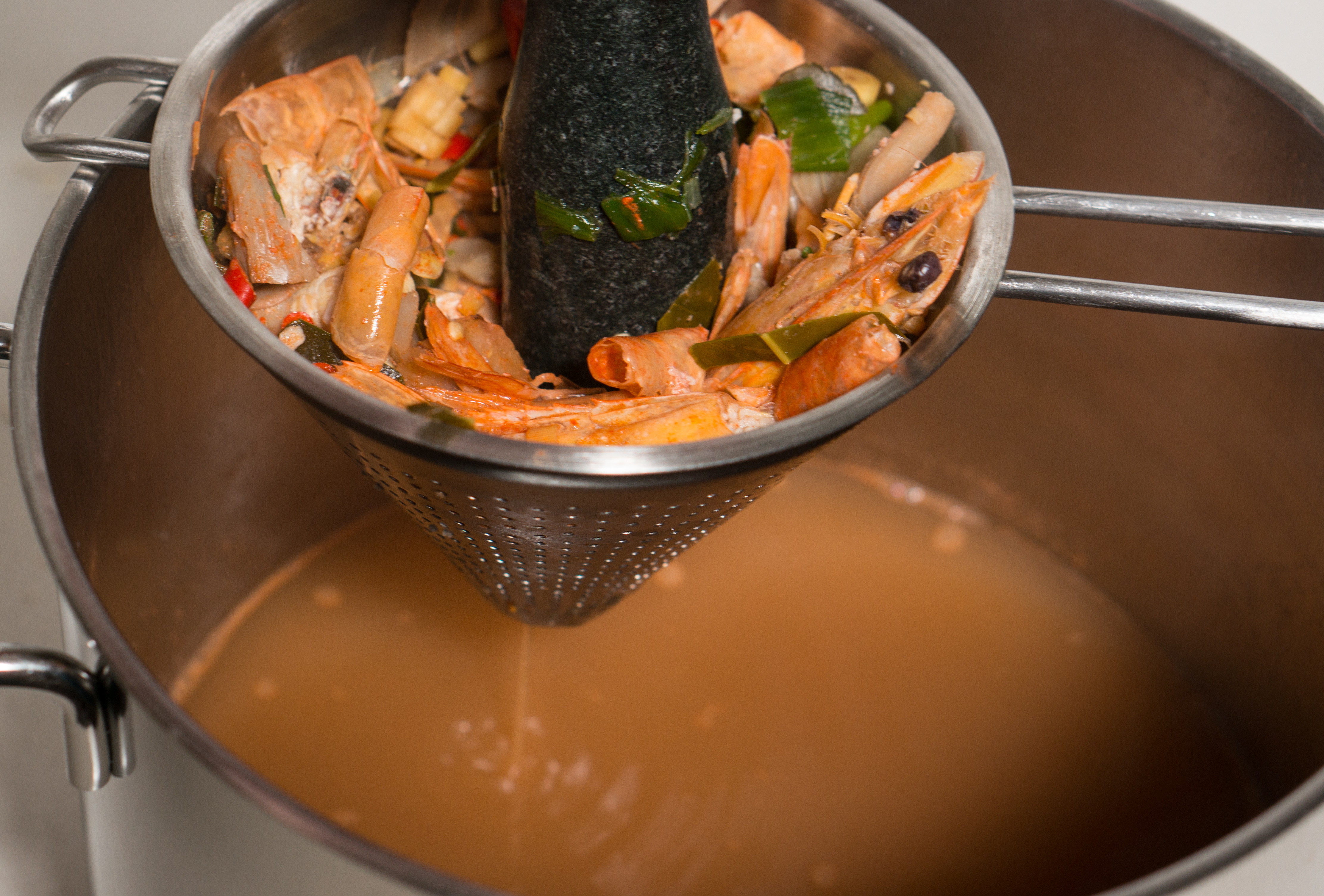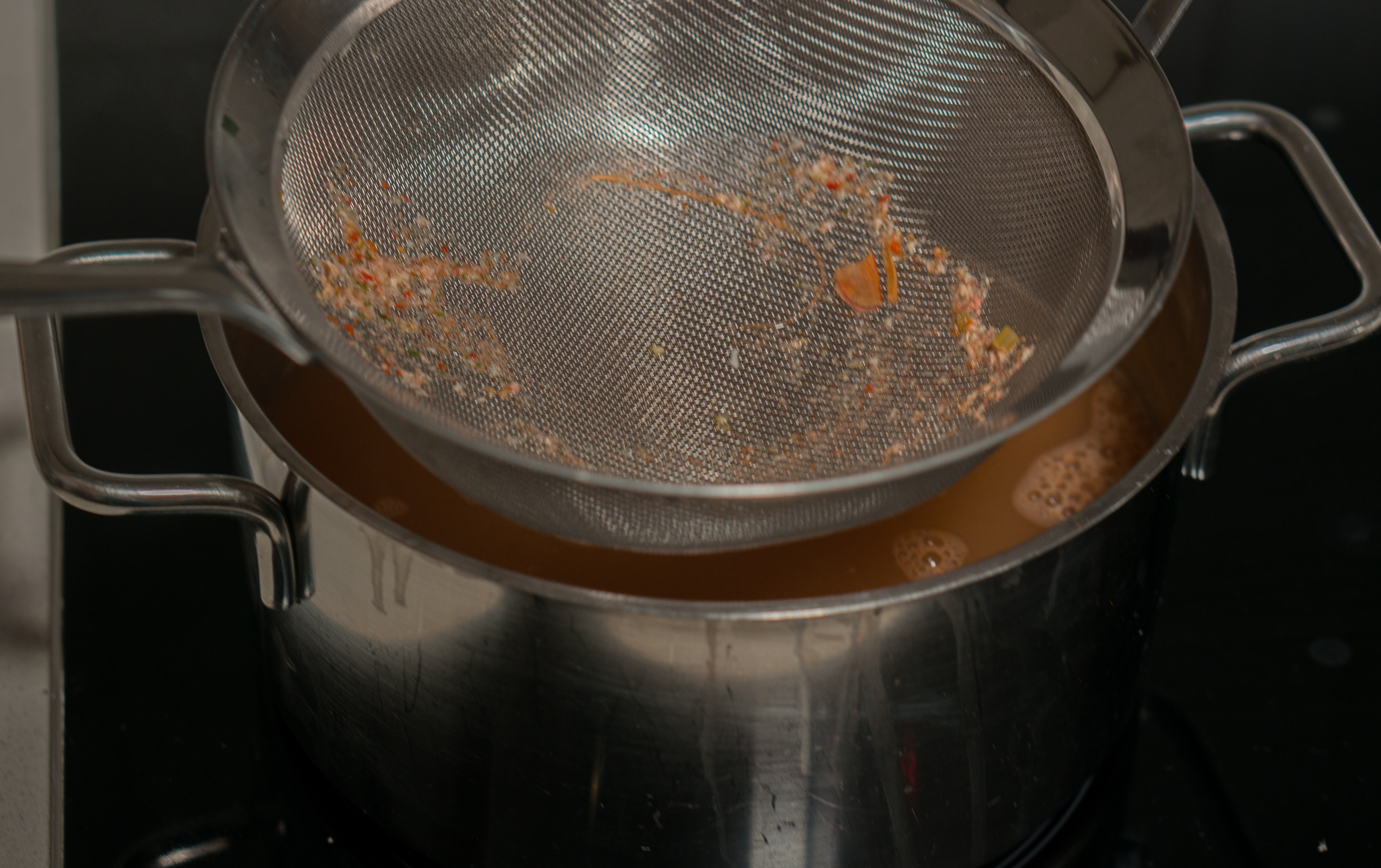 Pour the stock and all the solids into a conical sieve, and push on the solids to get as much liquid and flavor out as possible.