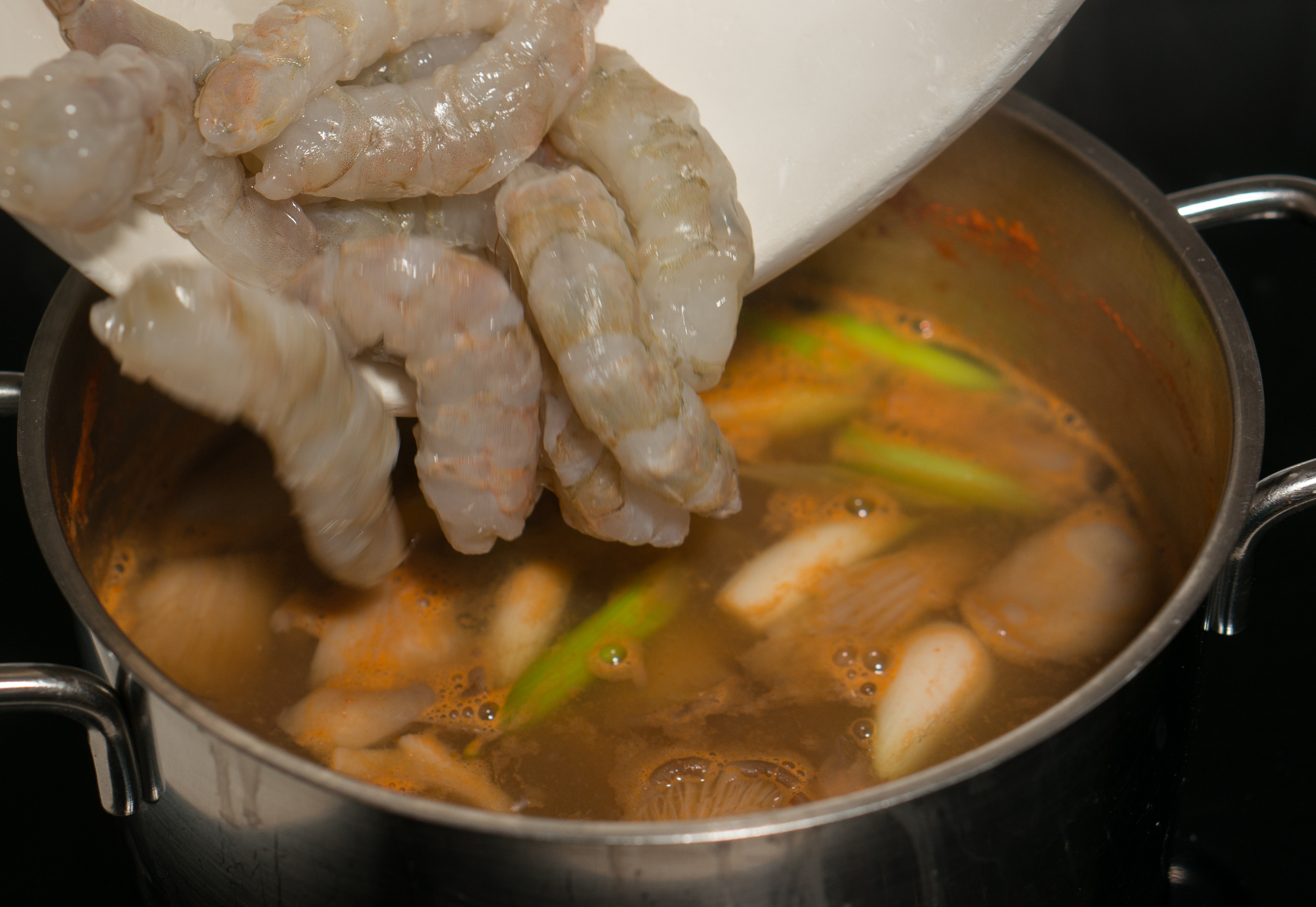 In the meantime, peel and devein the shrimp and add the shrimp heads and shells to the stock.