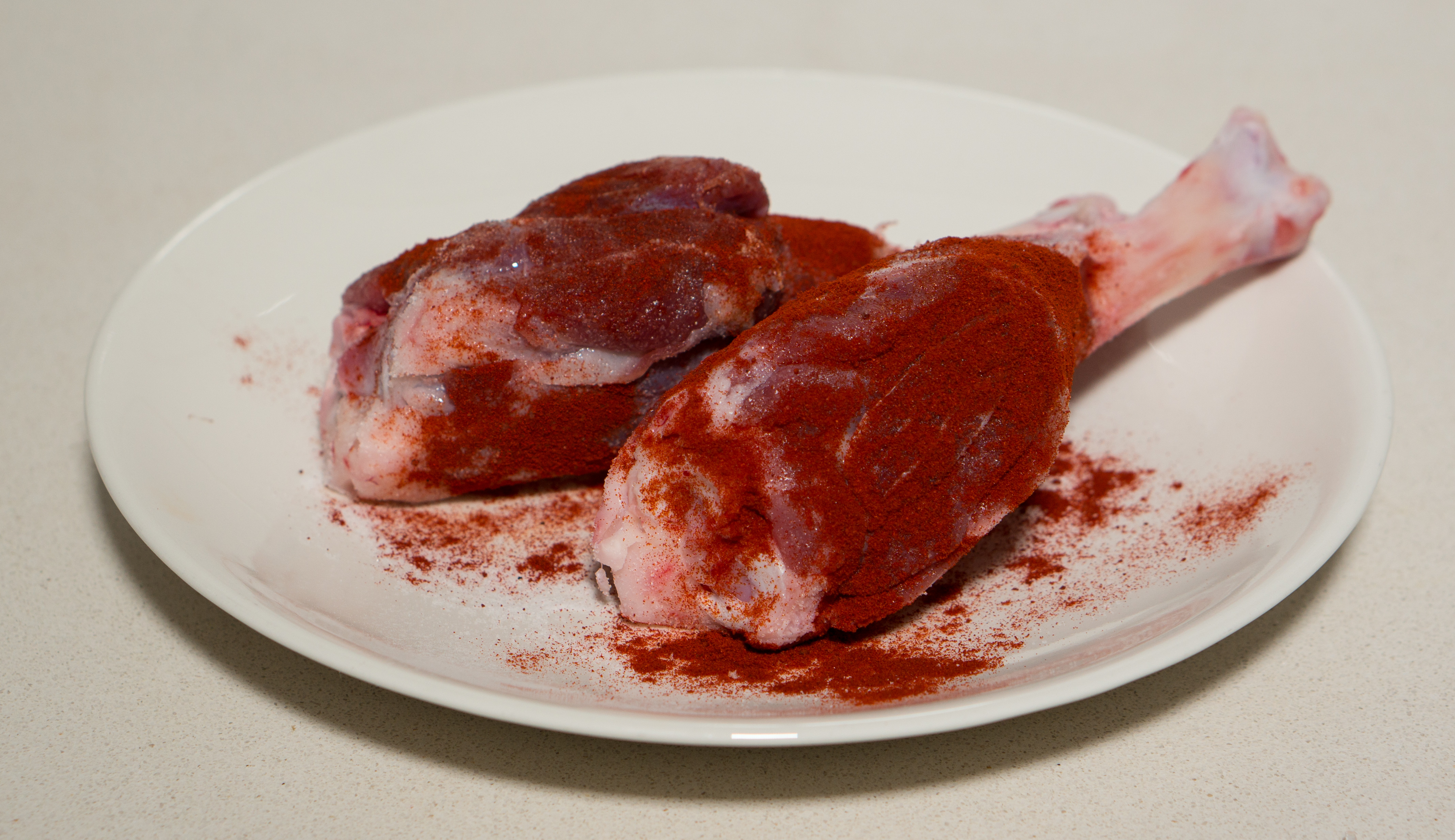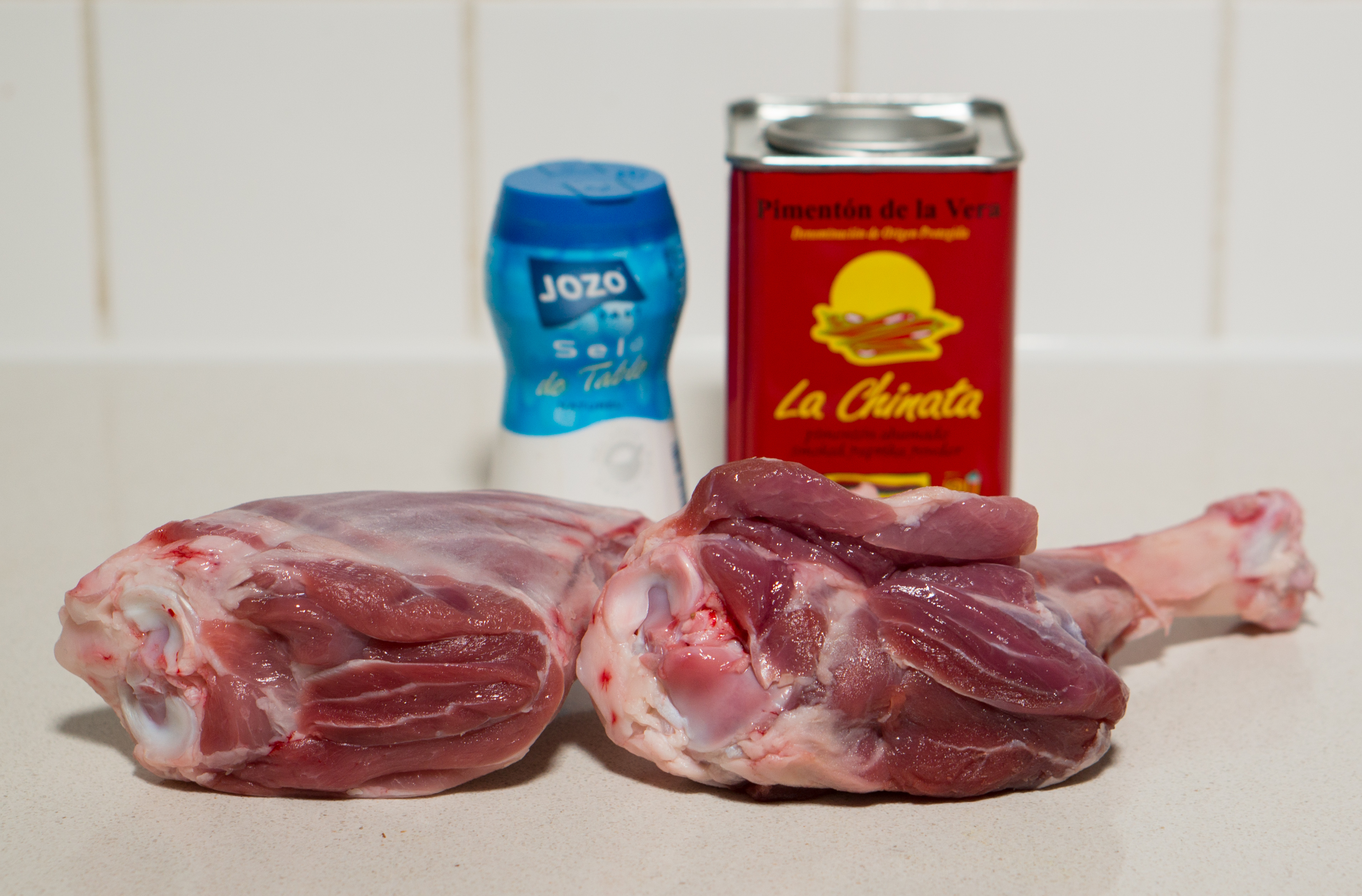 Two nights before, season the lamb shanks with salt and smoked paprika.