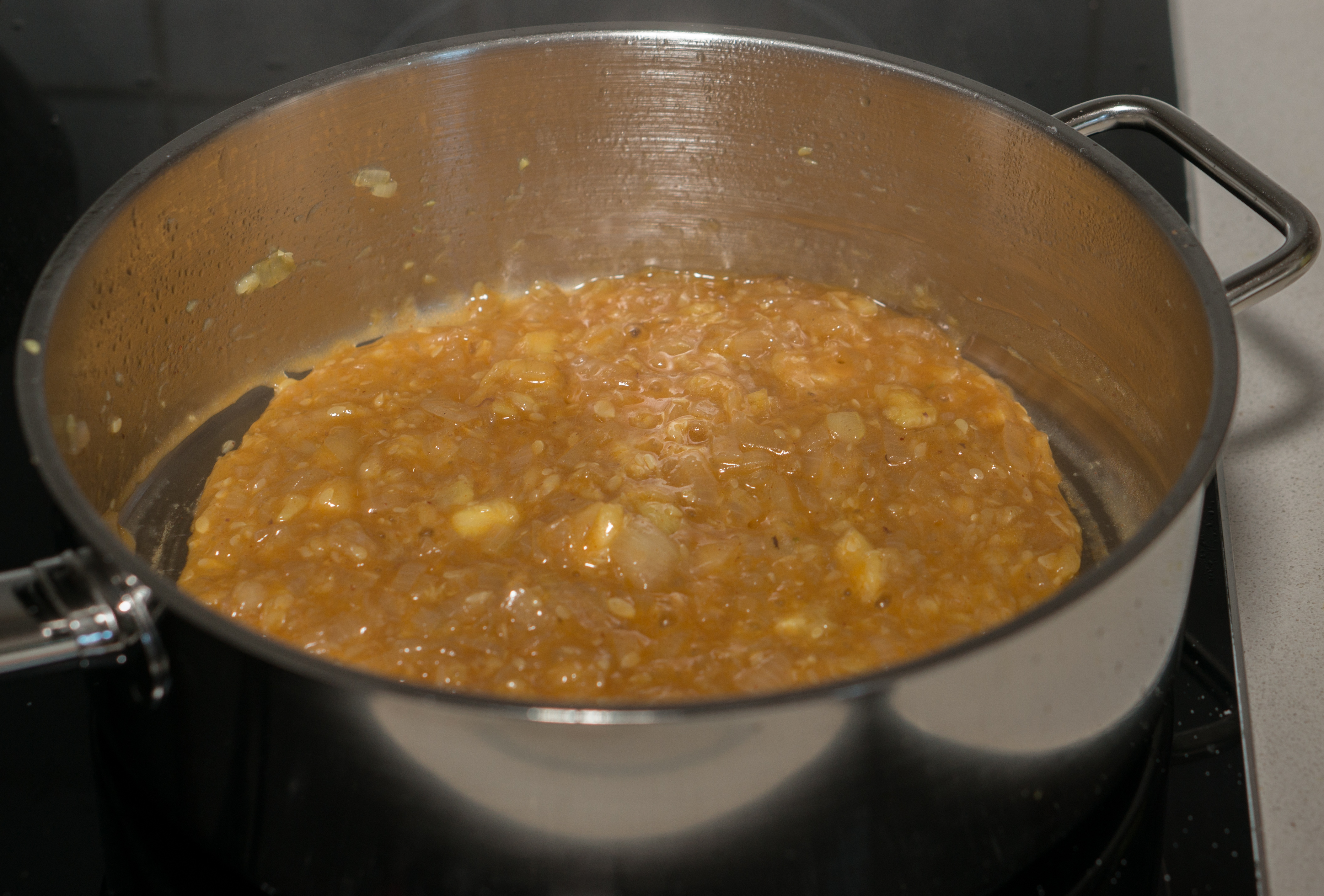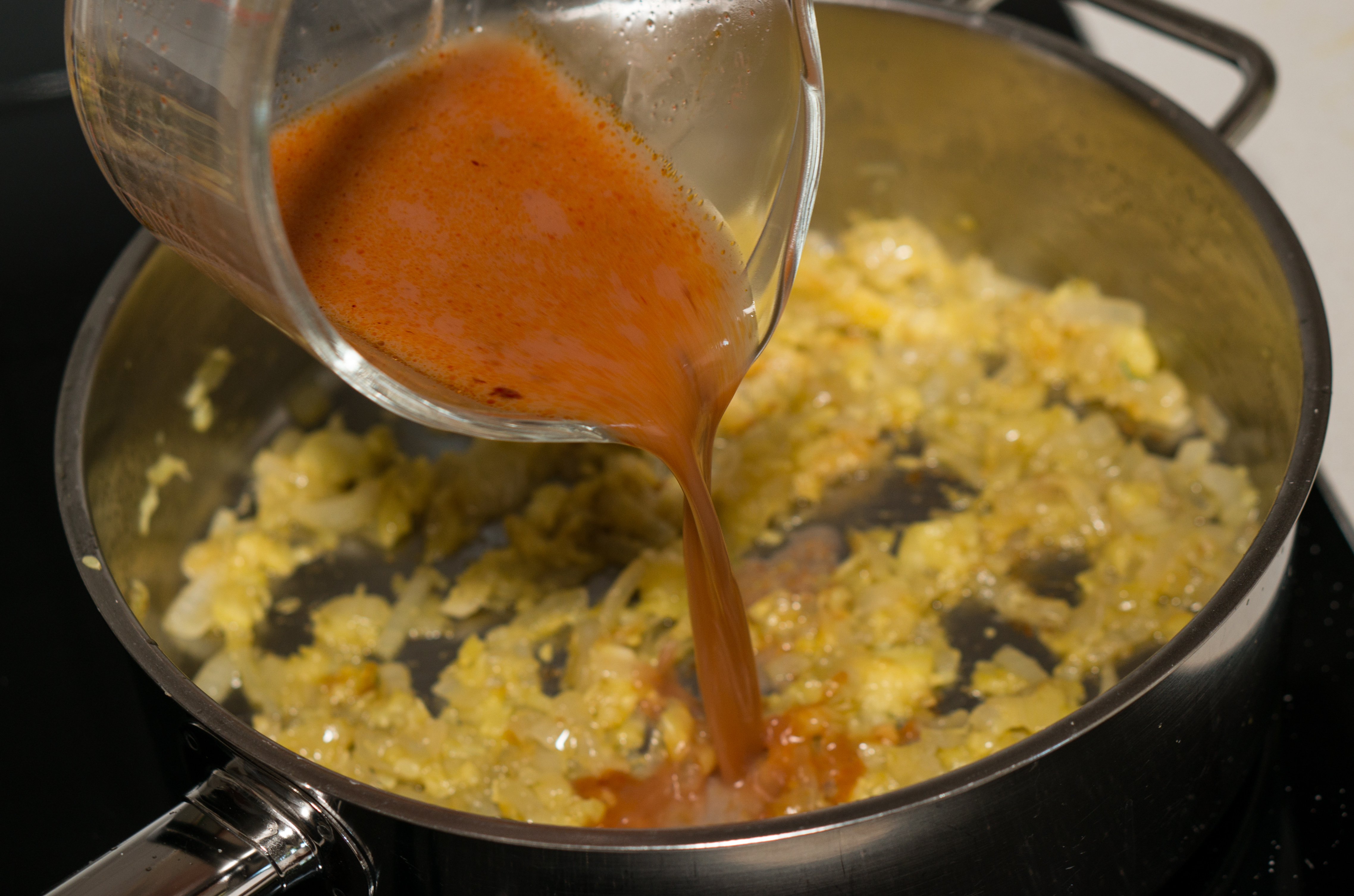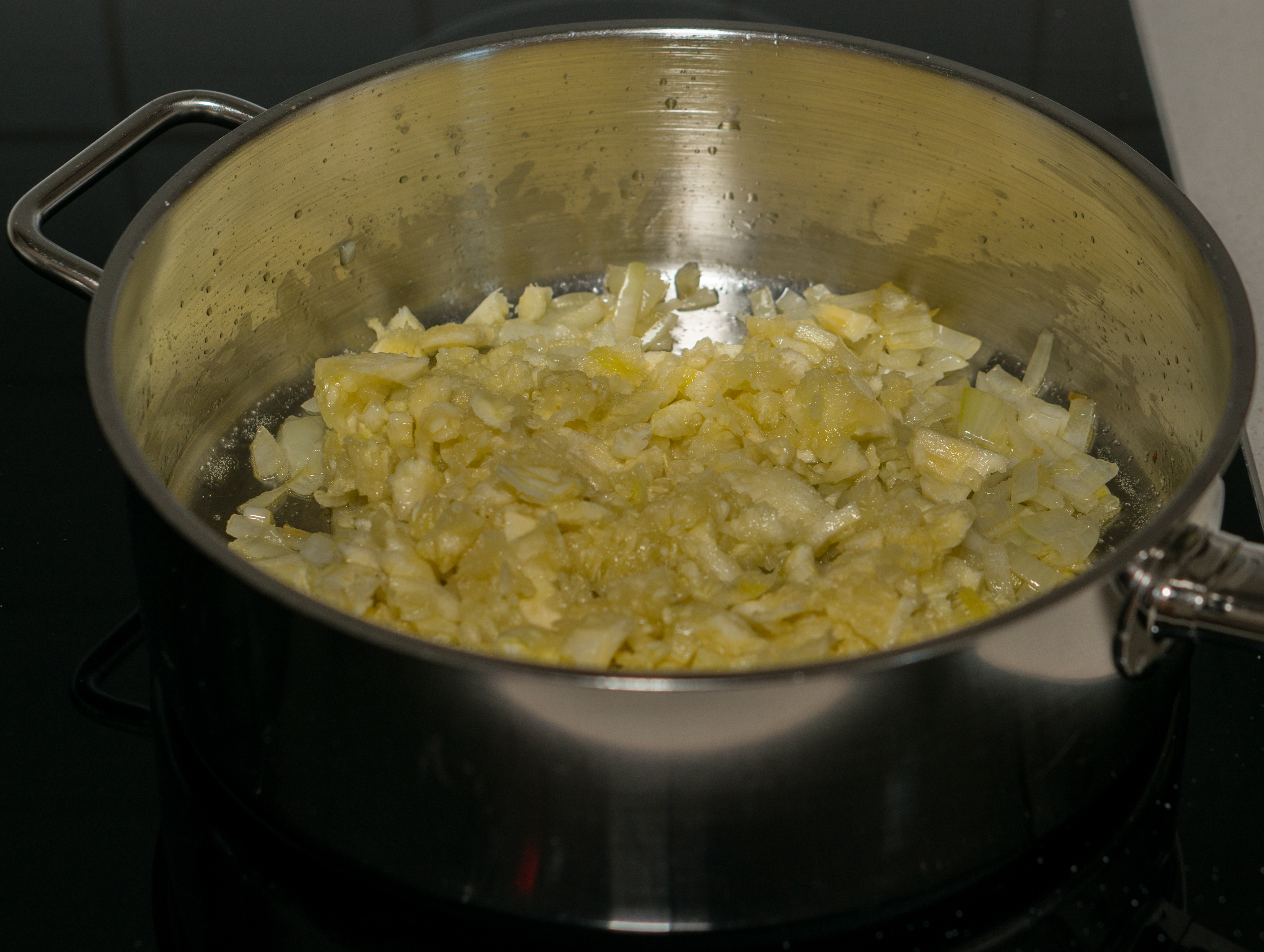 On the night you are going to serve the dish, heat two tablespoons of olive oil in a frying pan and add a chopped onion. Cook over low heat, stirring regularly.