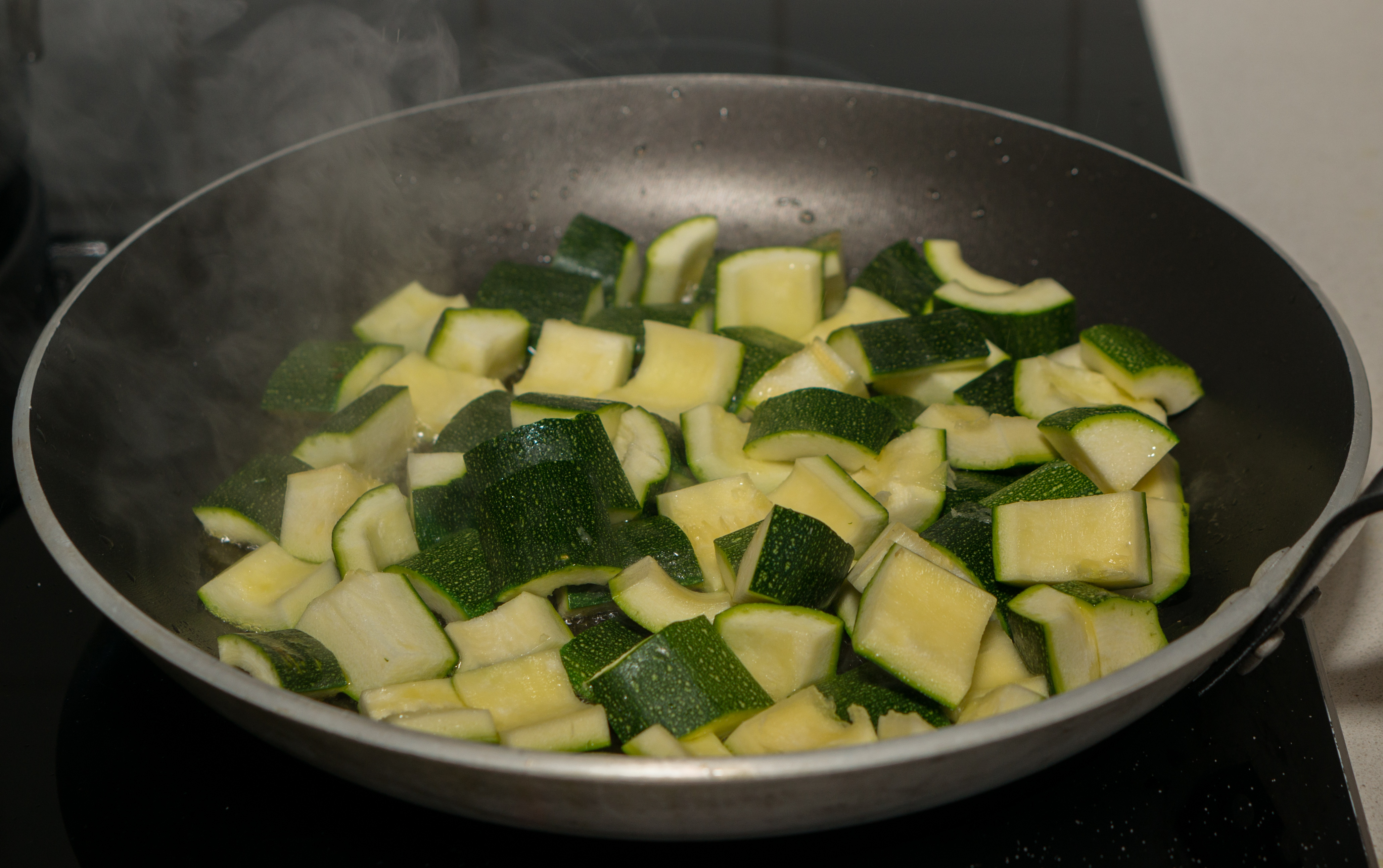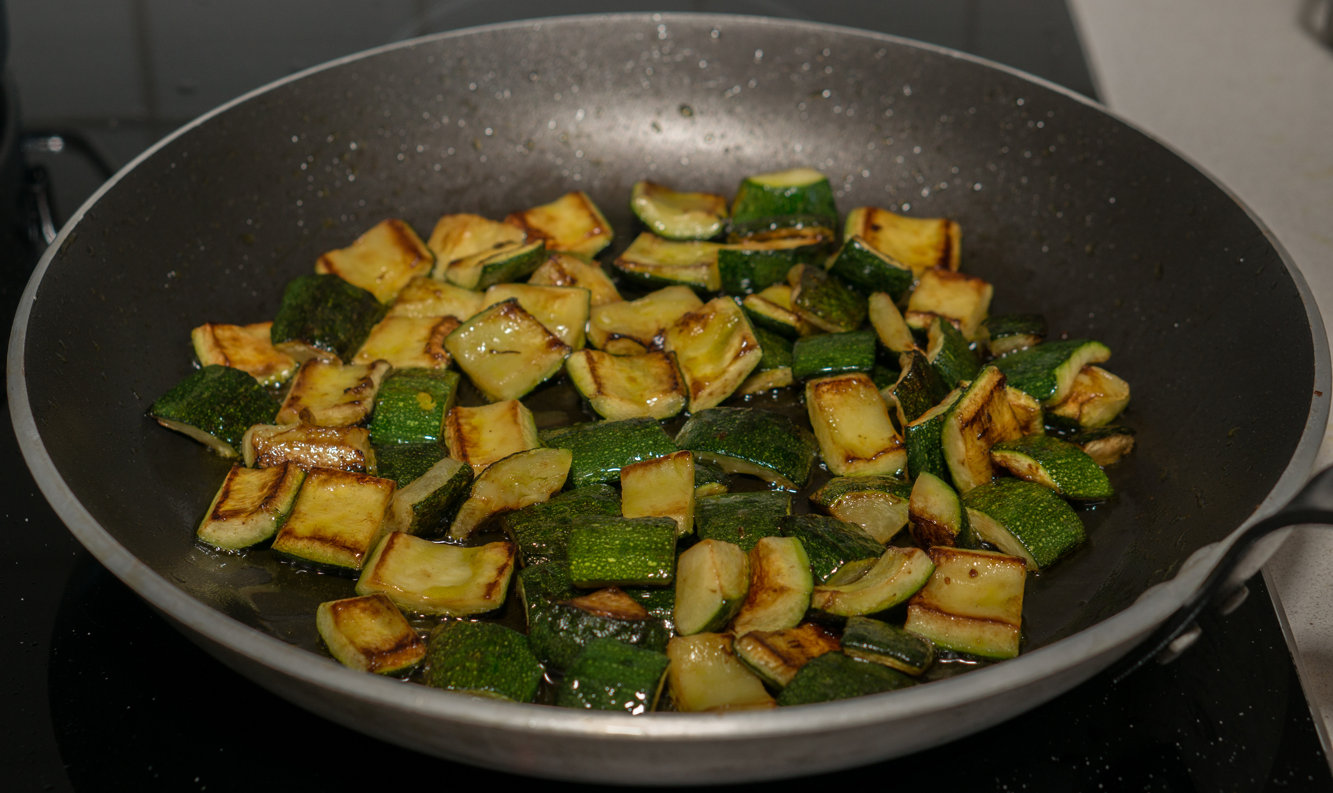 Sauté the zucchini until they are tender but firm to the bite, and nicely browned (but not charred!). Season with salt and freshly ground black pepper.