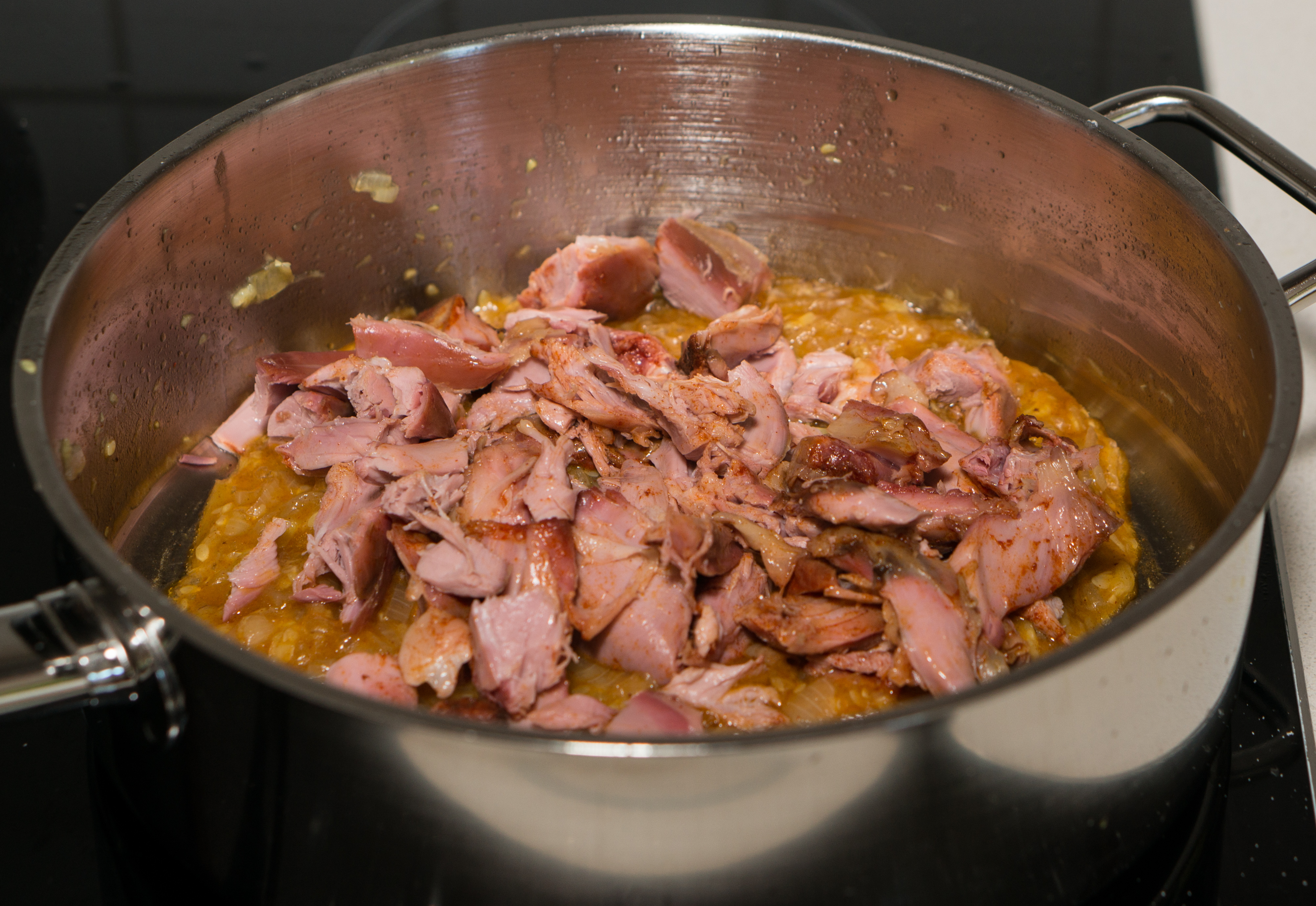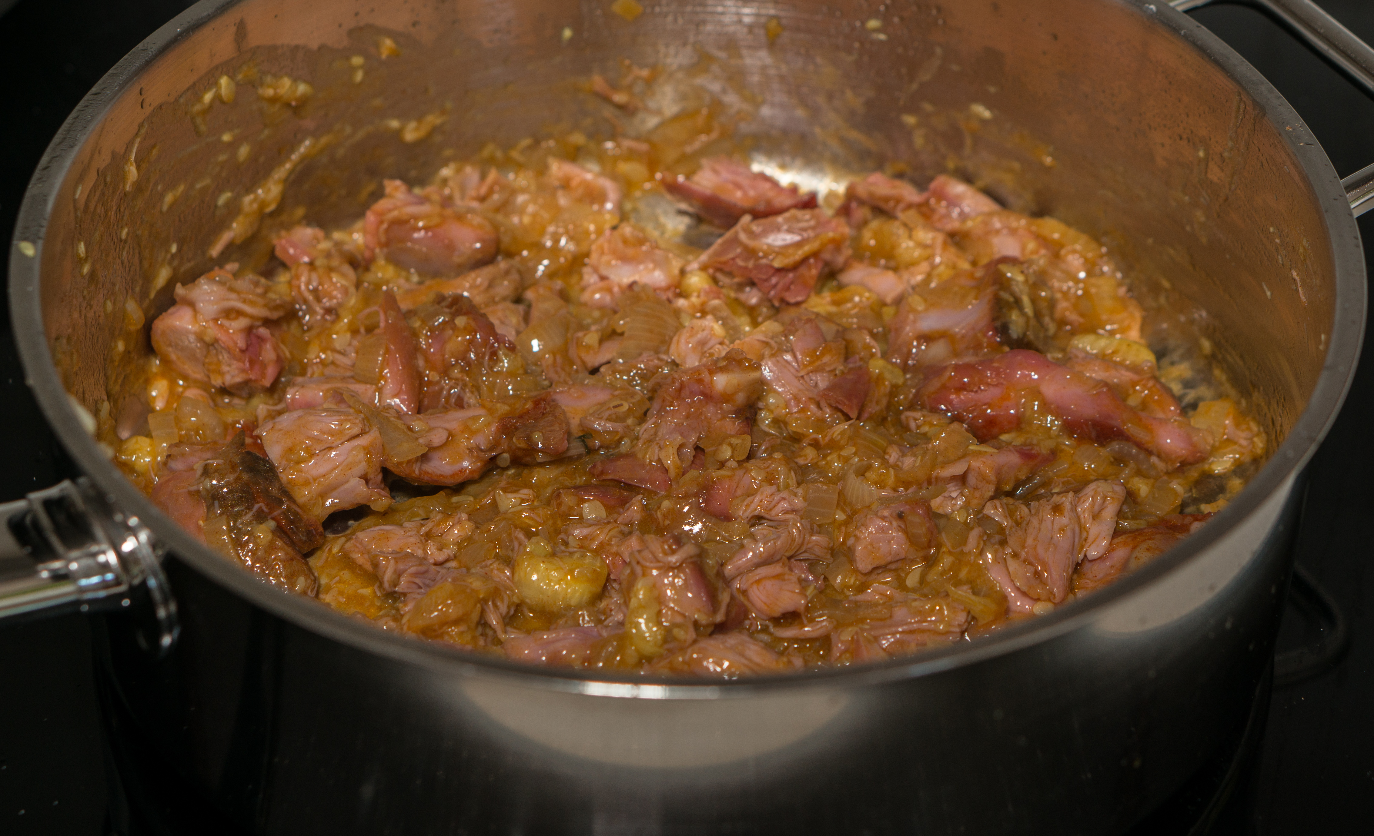 Lamb shank is one of my favorite cuts of meat, especially when cooked sous-vide. It is so flavorful, tender, and moist. And so I keep coming up with new ways to prepare it. In this case I thought it would be nice to pair it with smoked paprika and zucchini. I used the soft inner part of the zucchini for the sauce, and sautéed the rest. With a bit of fresh mint and mashed potatoes a delicious meal was put on the table. And it was very nice indeed. The lamb married very well with the smoked paprika, and the sautéed zucchini provided a nice crunchy contrast with the velvety lamb. We hardly ever eat the Dutch trio of “potatoes, veg and meat”, but in this case we did 😉 [If you don’t have sous-vide equipment, you could stew the lamb on the stovetop or in the oven. Just add the lamb to the onions with a bit of white wine or water, and cook over very low heat until the lamb is tender.]