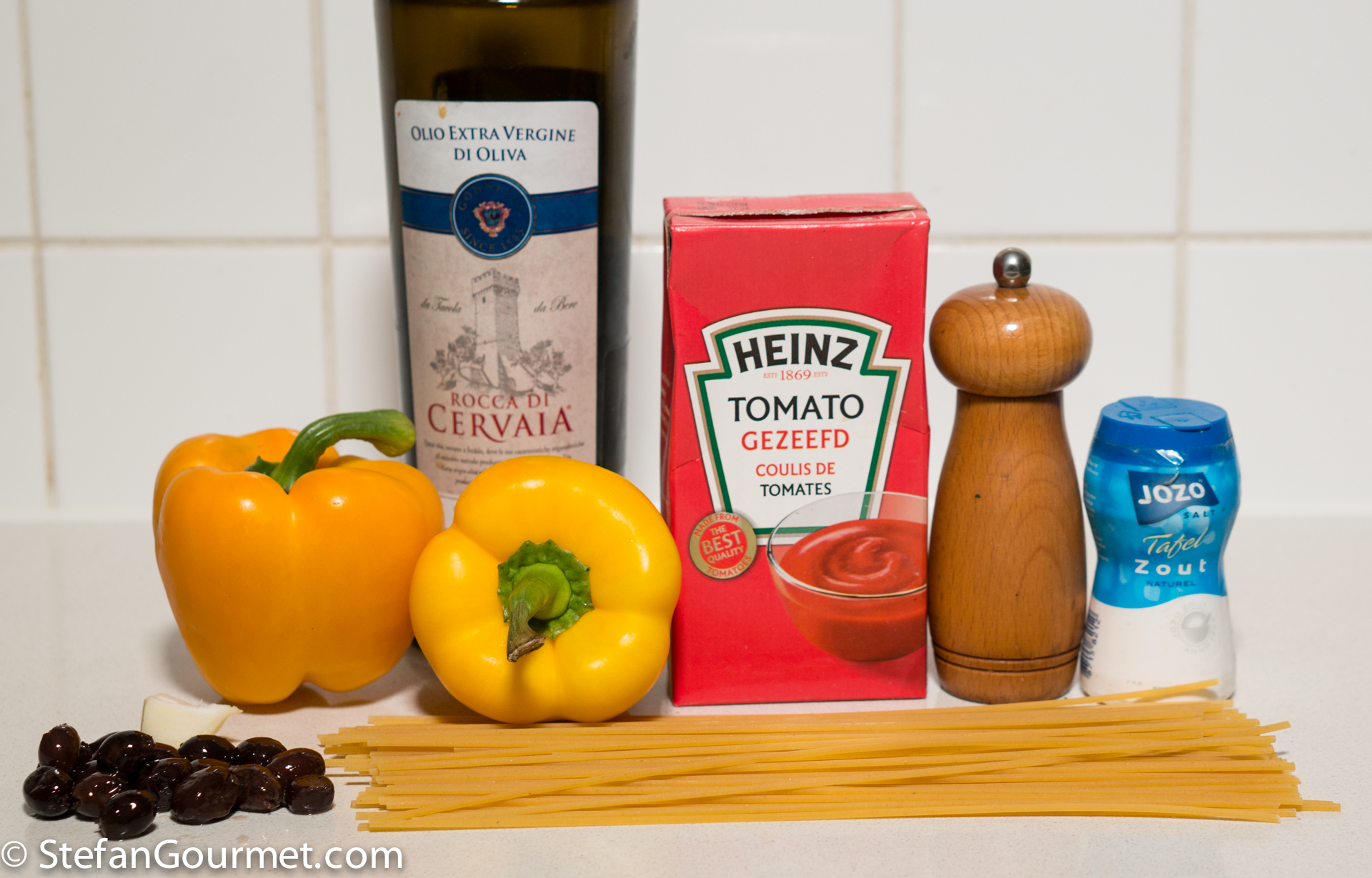You can of course select the pasta shape that will match your choice of sauce, but in today’s an yesterday’s post I have demonstrated that you can also adapt the sauce to the pasta shape. Both dishes use the same ingredients: bell peppers, olives, pasta, tomato puree, olive oil, garlic, salt, and pepper. With the same simple ingredients, you can make two pasta dishes that are both delicious but quite different. Yesterday’s dish with spaghetti tastes very differently from yesterday’s penne. This is in part due to the different mouthfeel, and in part due to the flavor added by roasting the bell peppers. Although both dishes are good, Kees and I both preferred the spaghetti version.