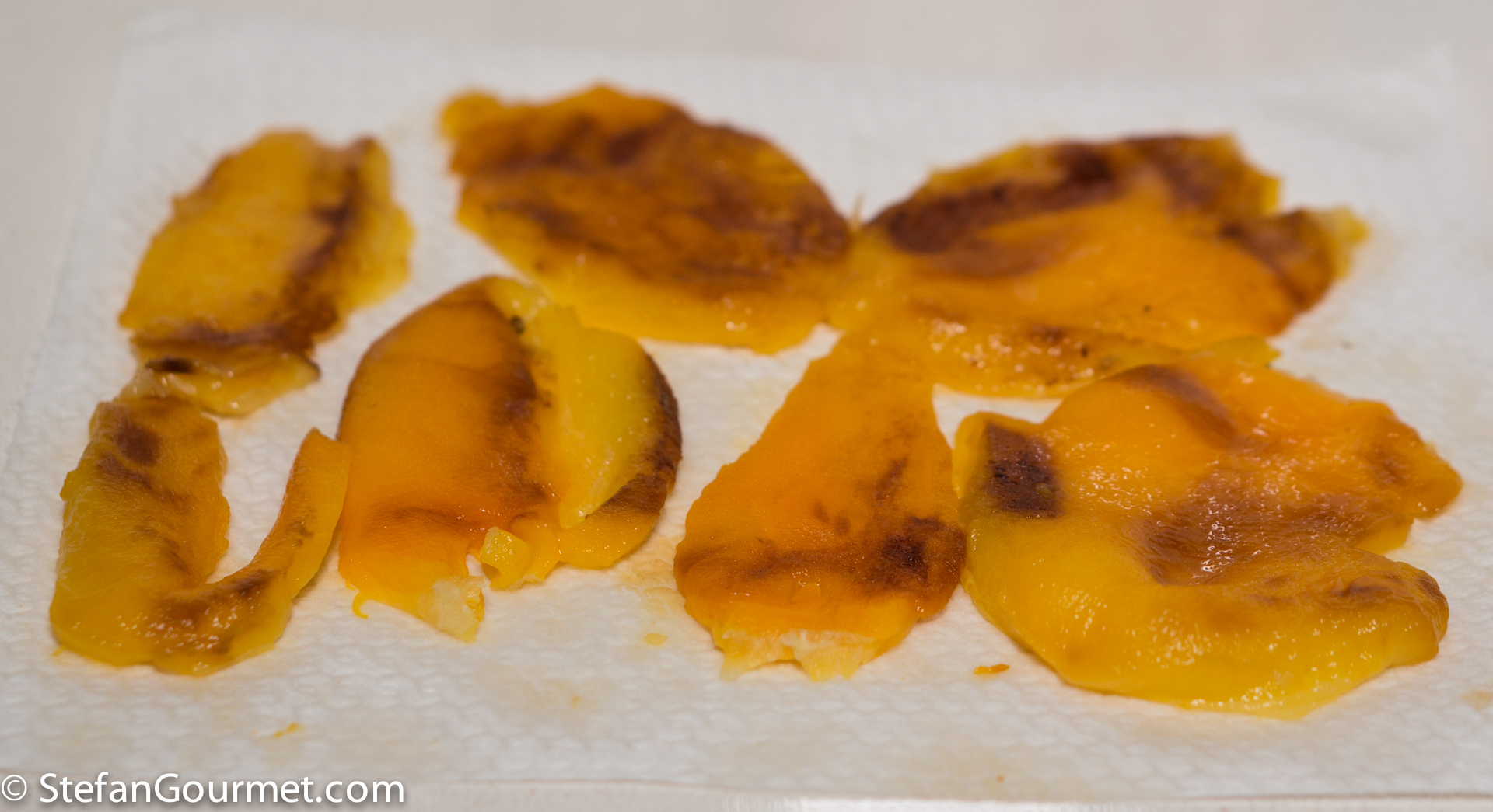 Once the bell peppers have cooled off inside the plastic bag, the skin should then come off easily.
