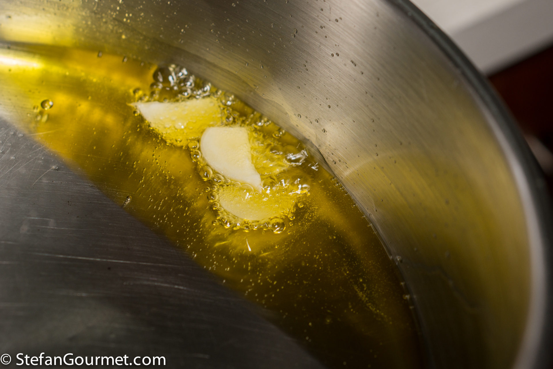 Heat 2 tablespoons of olive oil in a frying pan. Add a sliced clove of garlic and tilt the pan to ‘deep fry’ the garlic until it starts to color, then remove it.