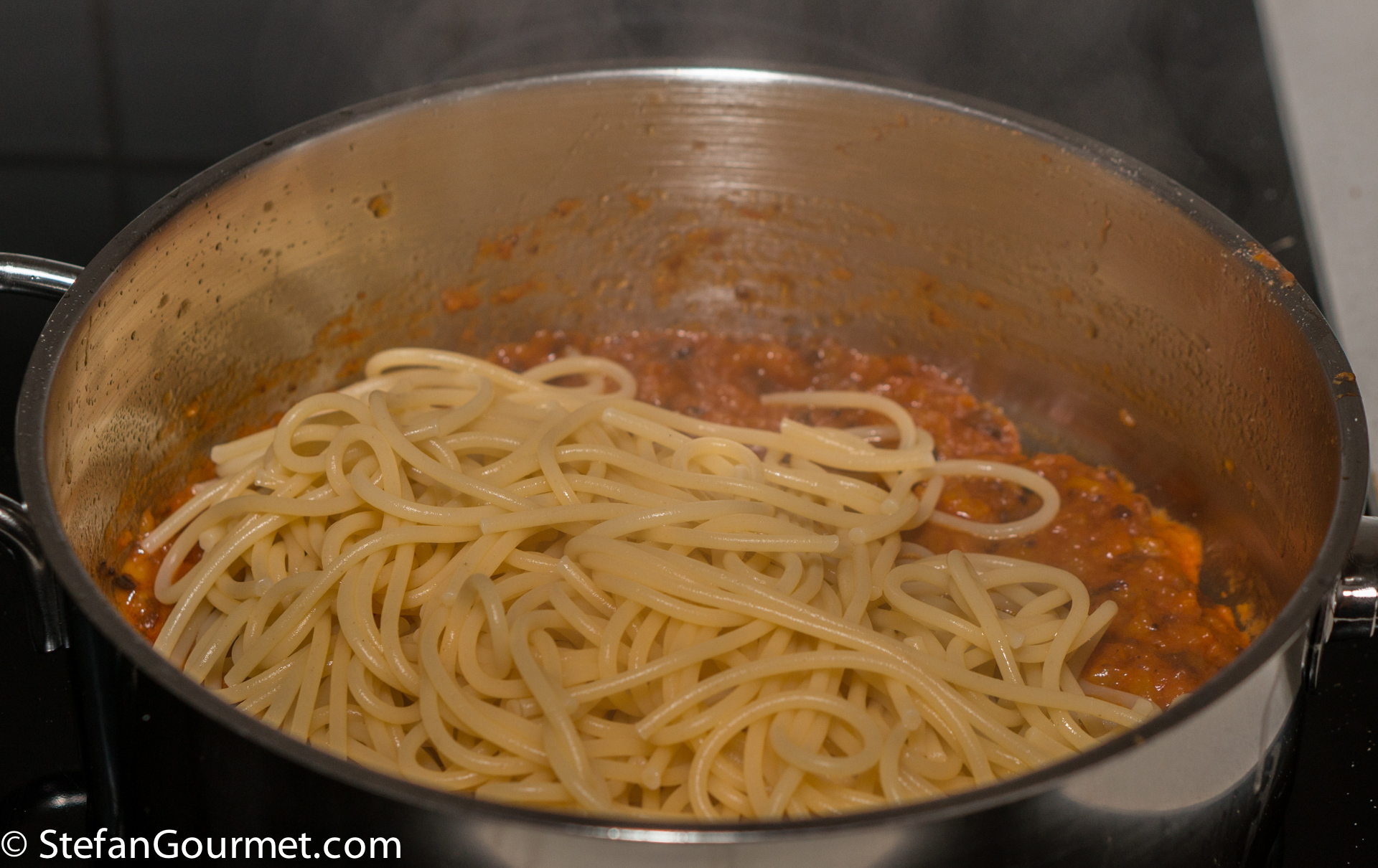 When the timer beeps, drain the spaghetti and add to the sauce.