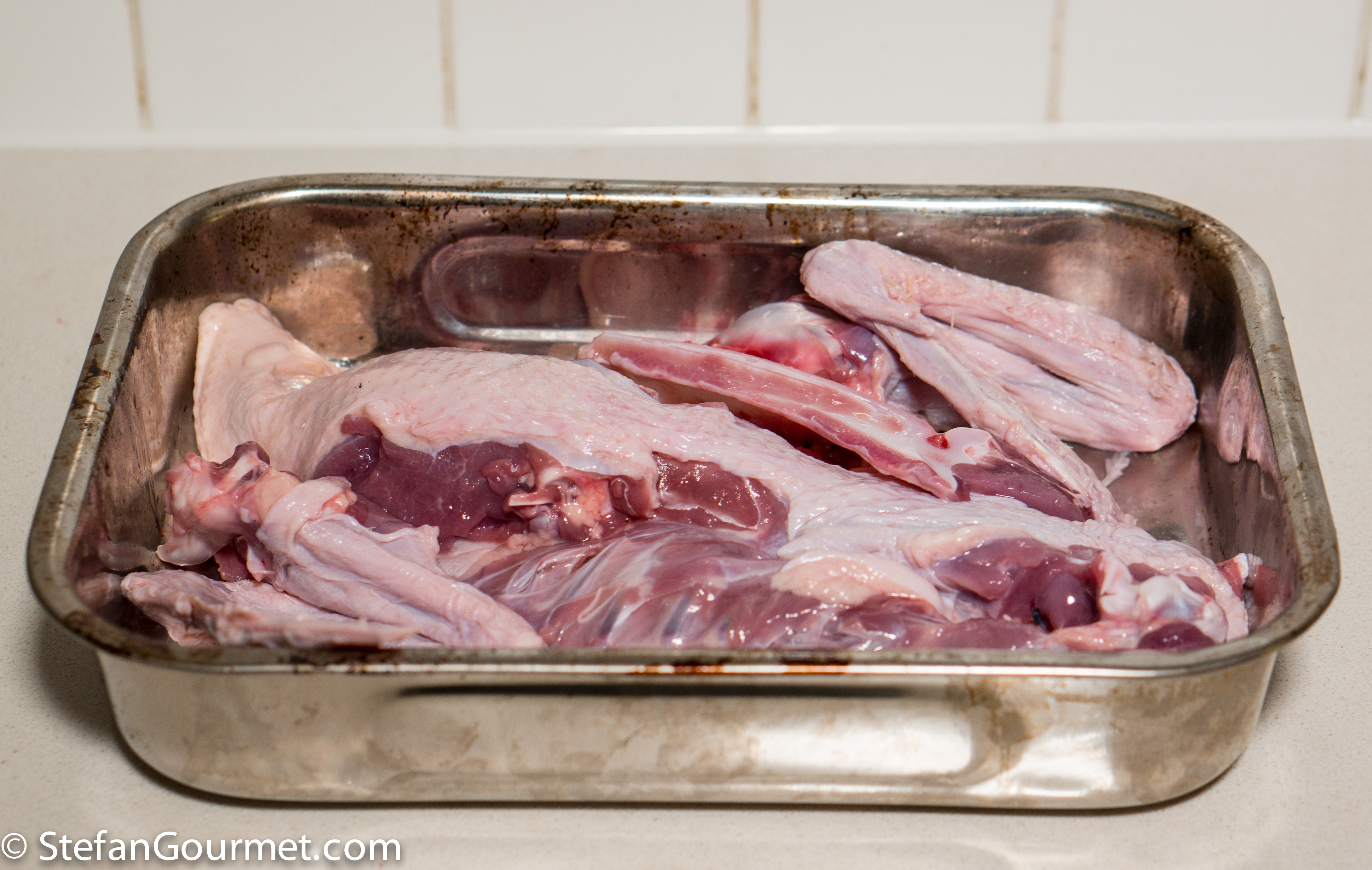 Preheat the oven to 190C/375F. Put the duck carcass (including the wings) in roasting tray.