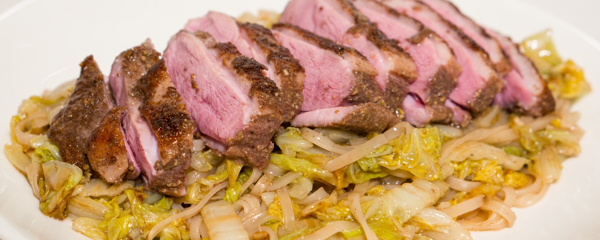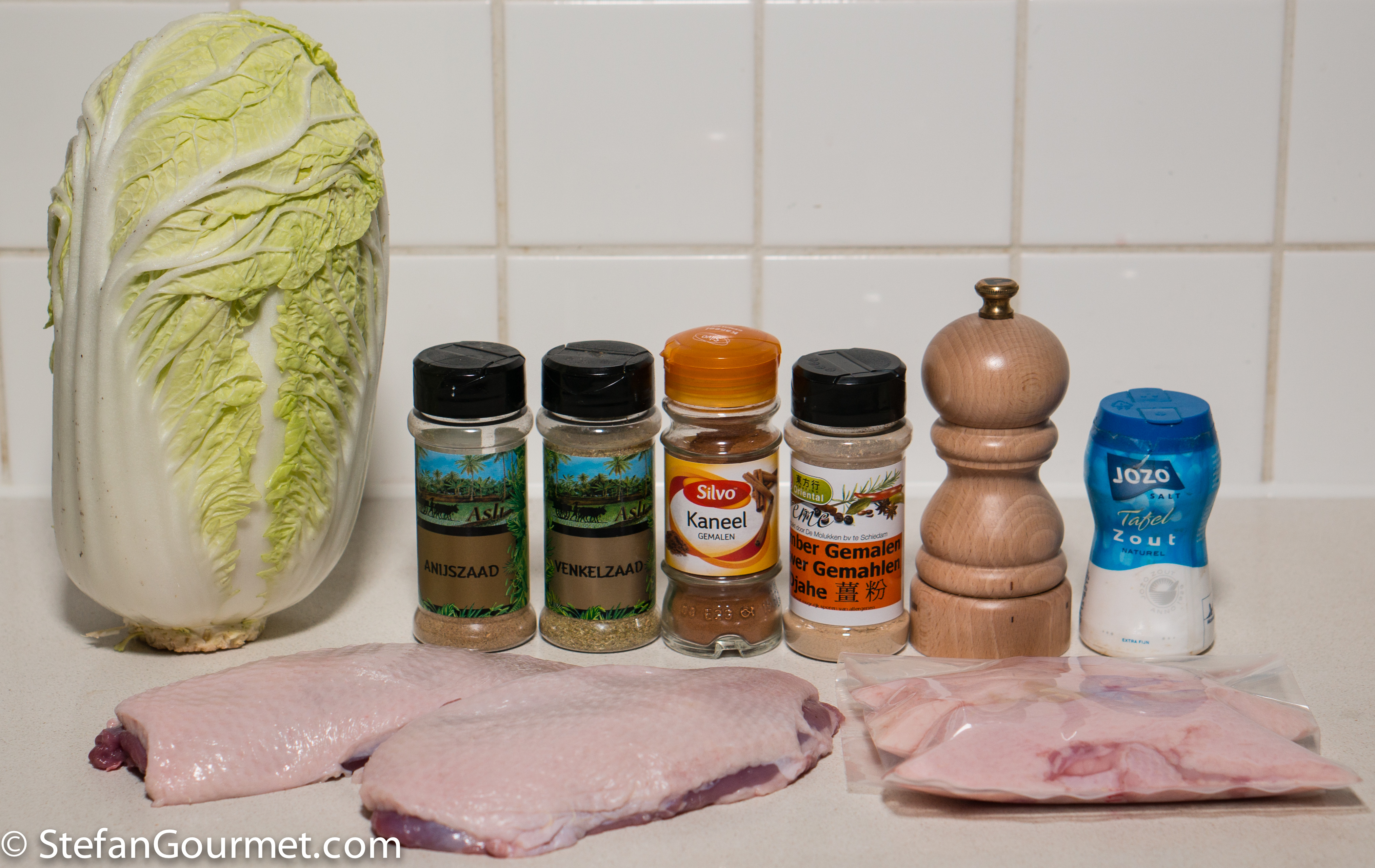 We’re on a wine discovery vacation in Spain, and so there have been a lot of posts about Spanish wine lately. Although I do intend to write more about wine than I used to, this will remain primarily a cooking blog. And so it is about time to post a recipe again. I prepared and photographed this Asian-inspired dish before we left. The combination of five-spice with duck and napa cabbage (Chinese cabbage) worked very well.