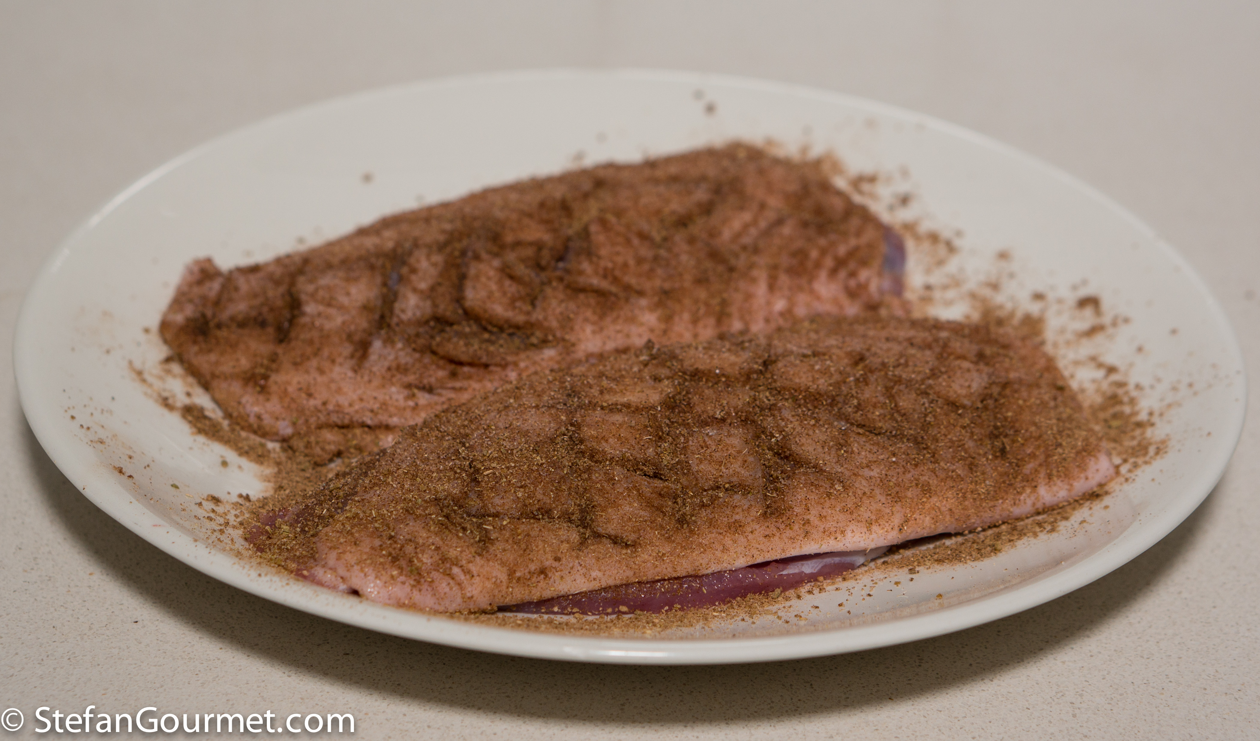 Score the skin of the duck breasts in a diamond pattern. Season the duck breasts with a teaspoon of five-spice and 1/4 teaspoon of salt per side (so for 2 duck breasts altogether 4 tsp of five-spice and 1 tsp of salt), and rub in the salt and spices.
