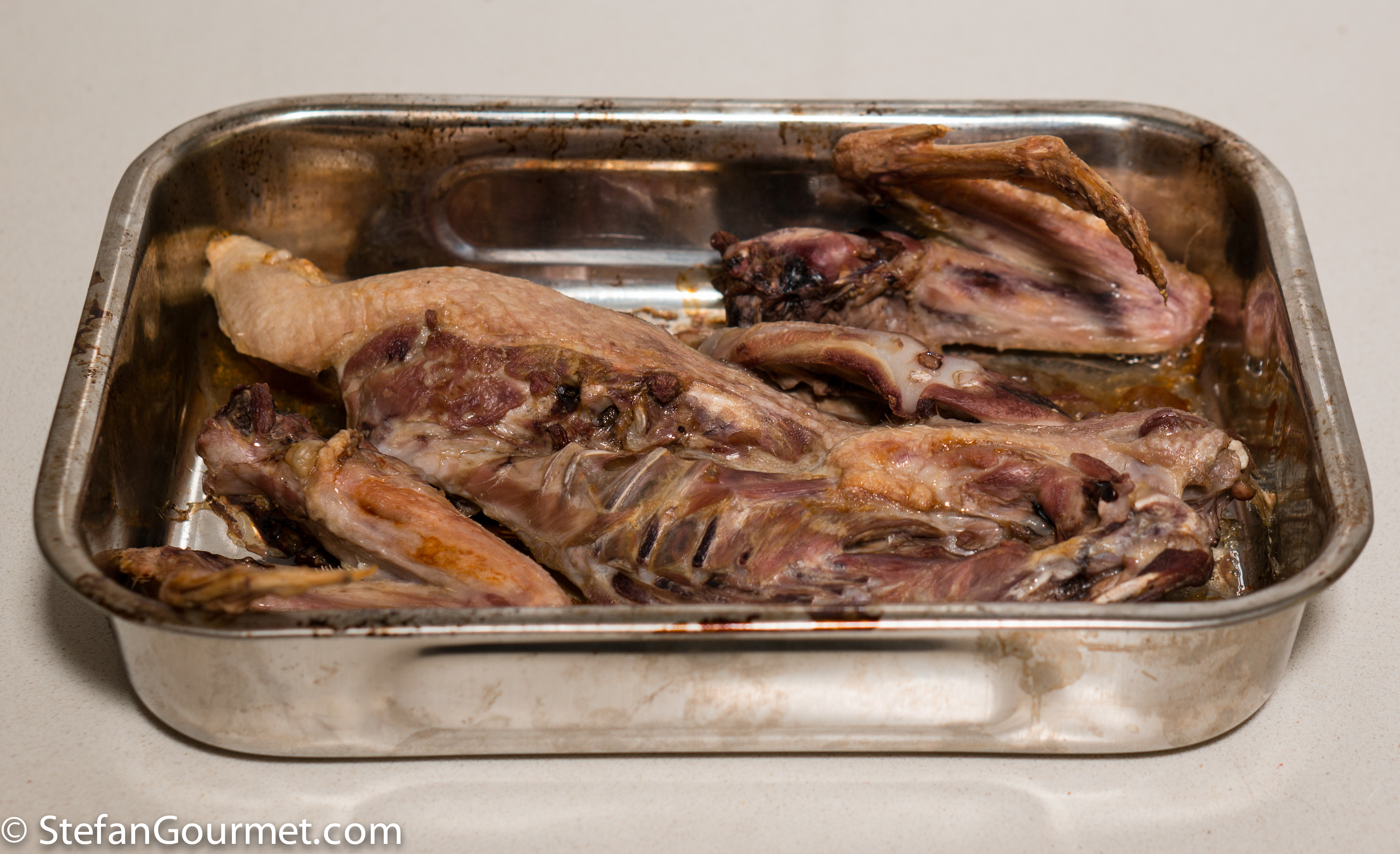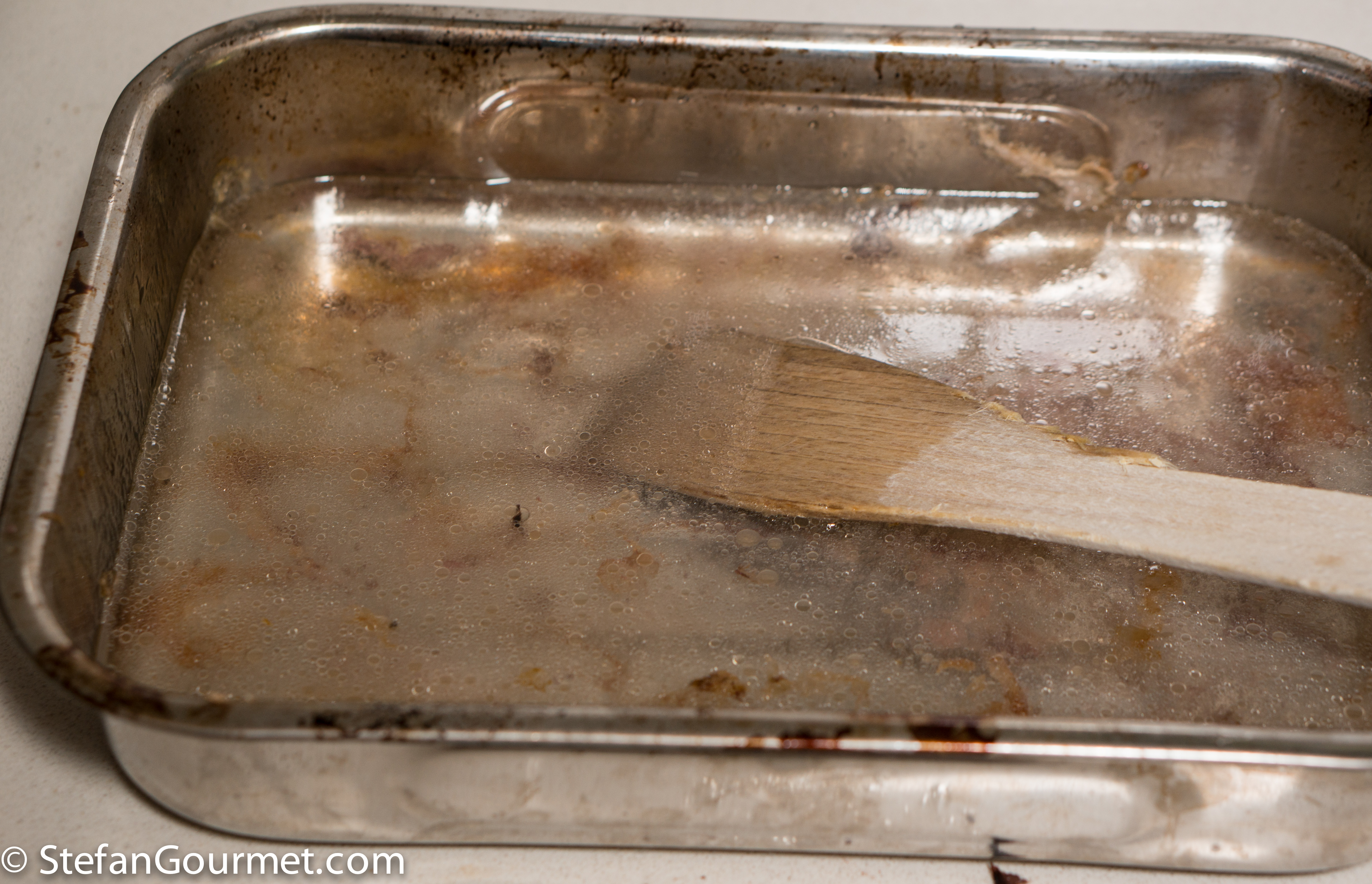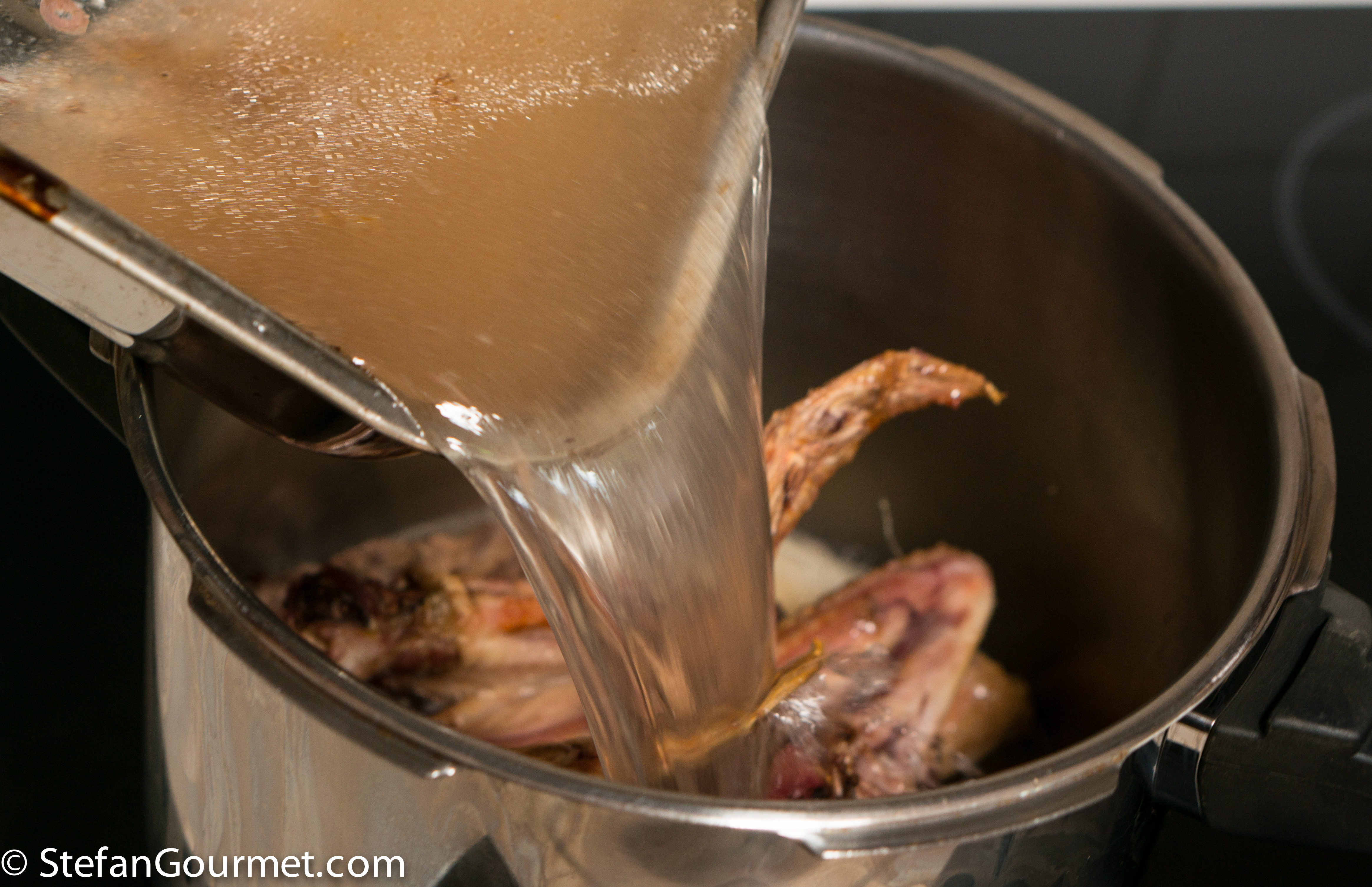 Transfer the roasted duck carcass to a pressure cooker or stock pot. Add a litre (4 cups) of water to the roasting tray, and use a wooden spatula to loosen any browned bits that are stuck to the roasting tray to include all the flavor in the stock.