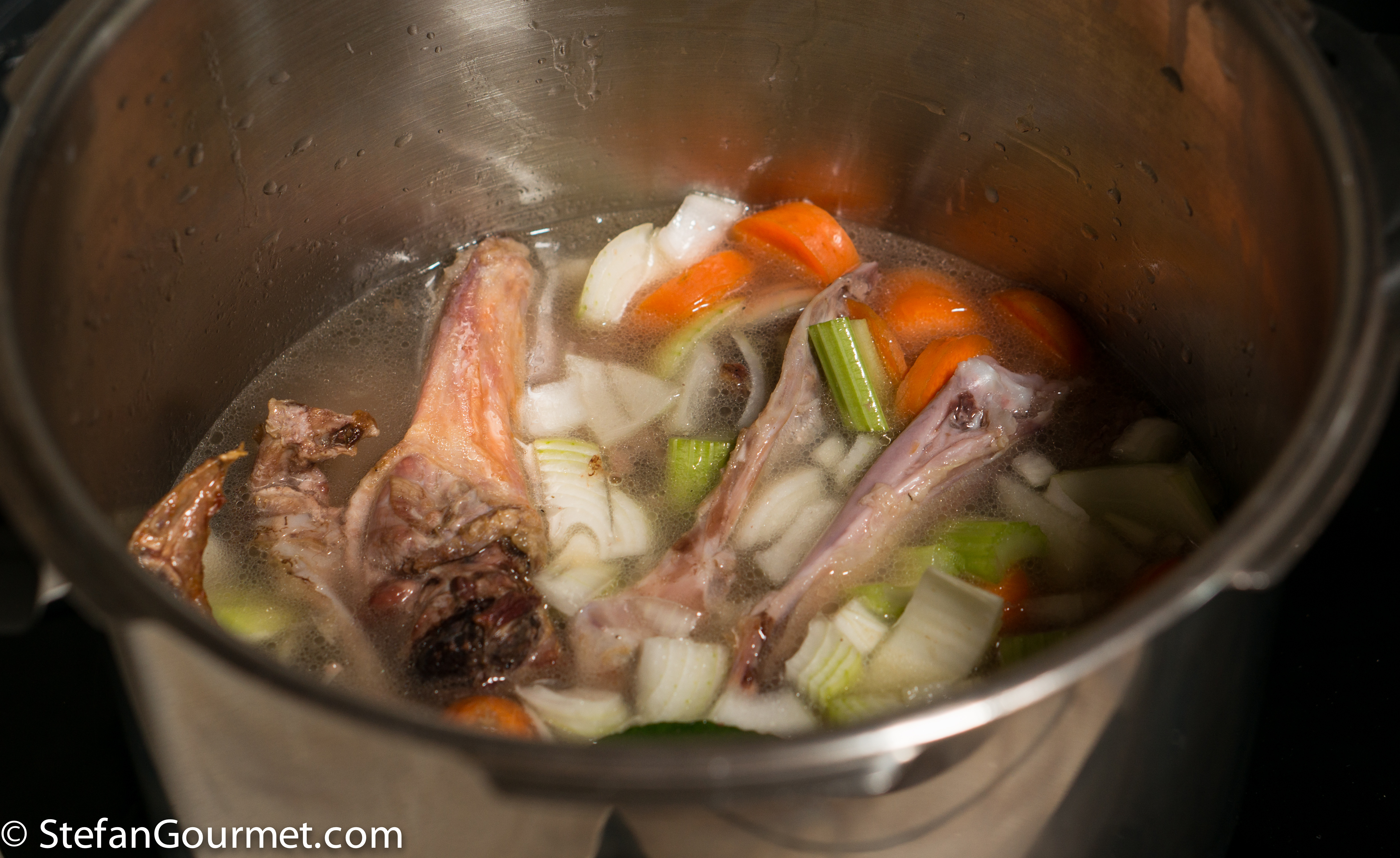 Pour the water from the roasting tray into the pressure cooker or stock pot. Add a chopped onion, a chopped carrot, a chopped stick of celery, and a bay leaf. Add more water if needed to barely cover.