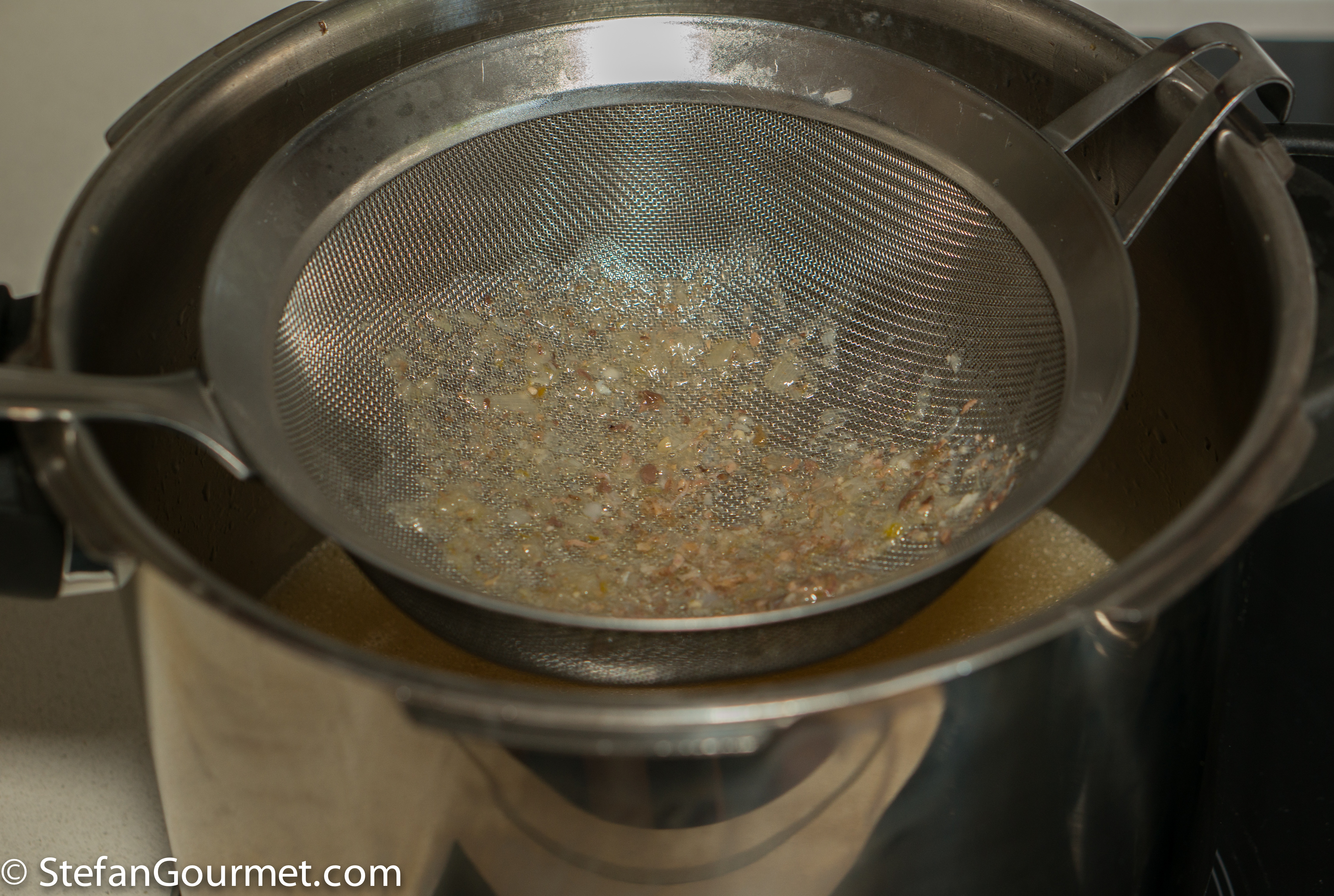 Strain the stock into a clean pan. First with a colander to get rid of the big pieces…