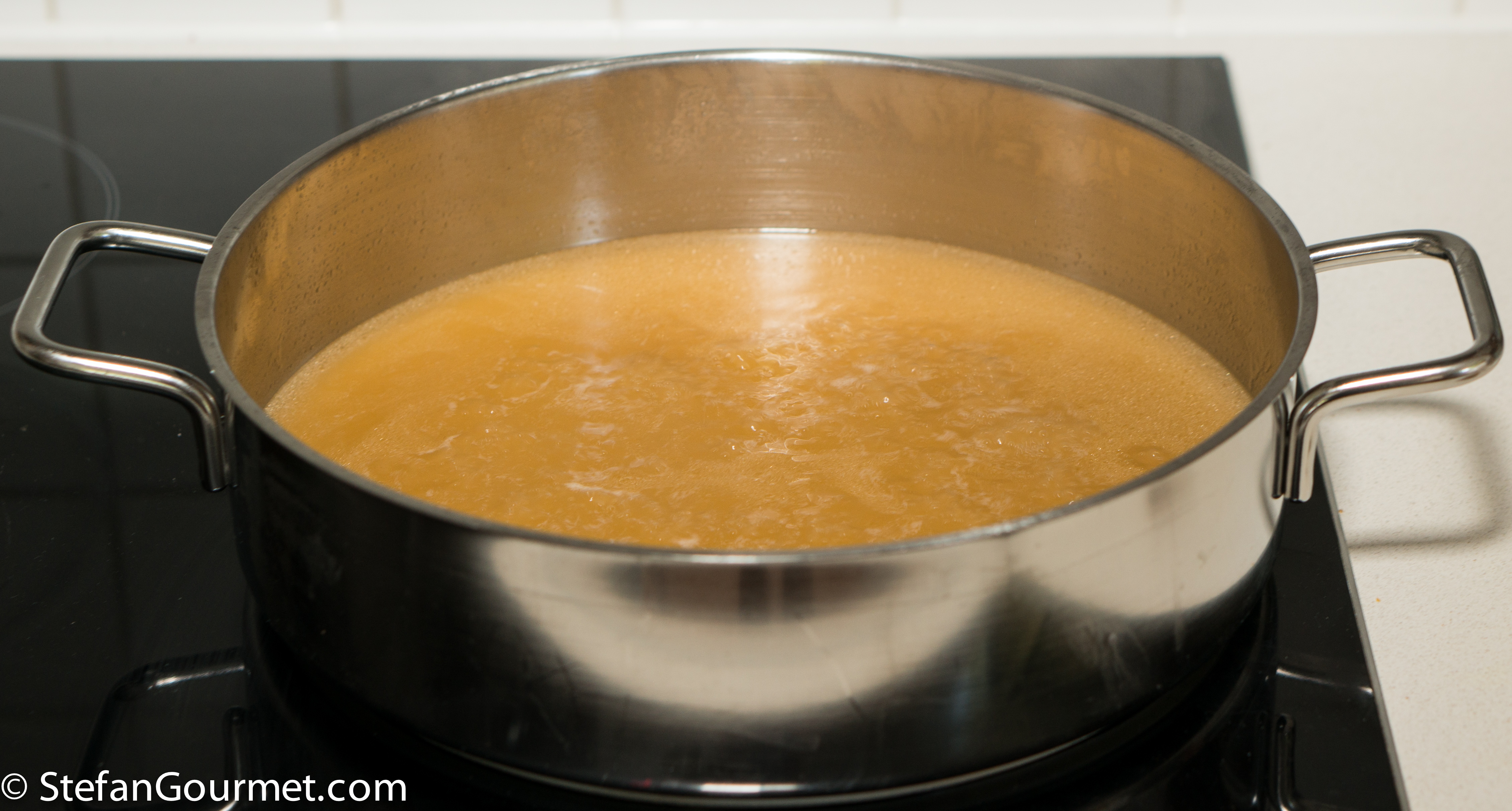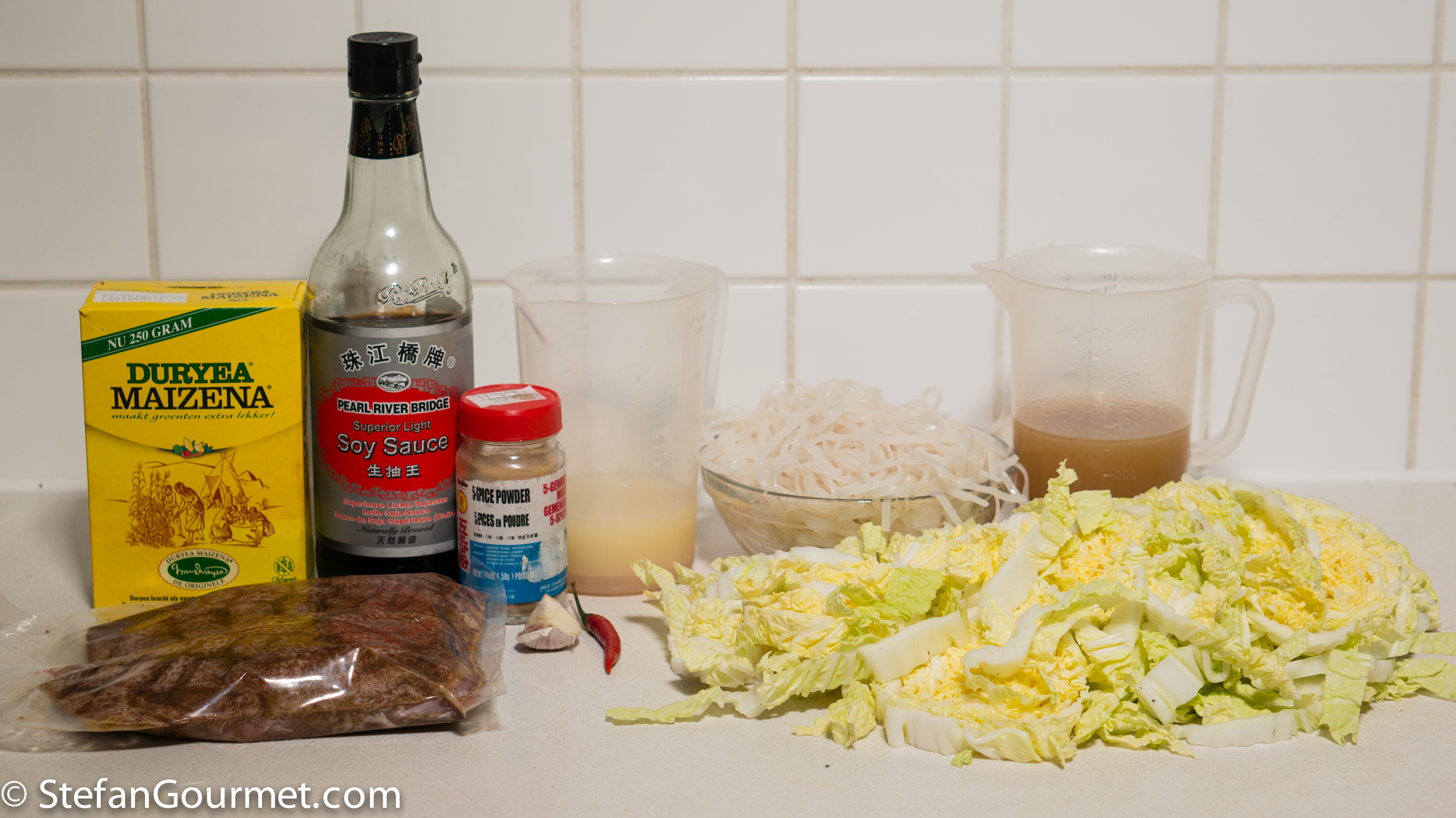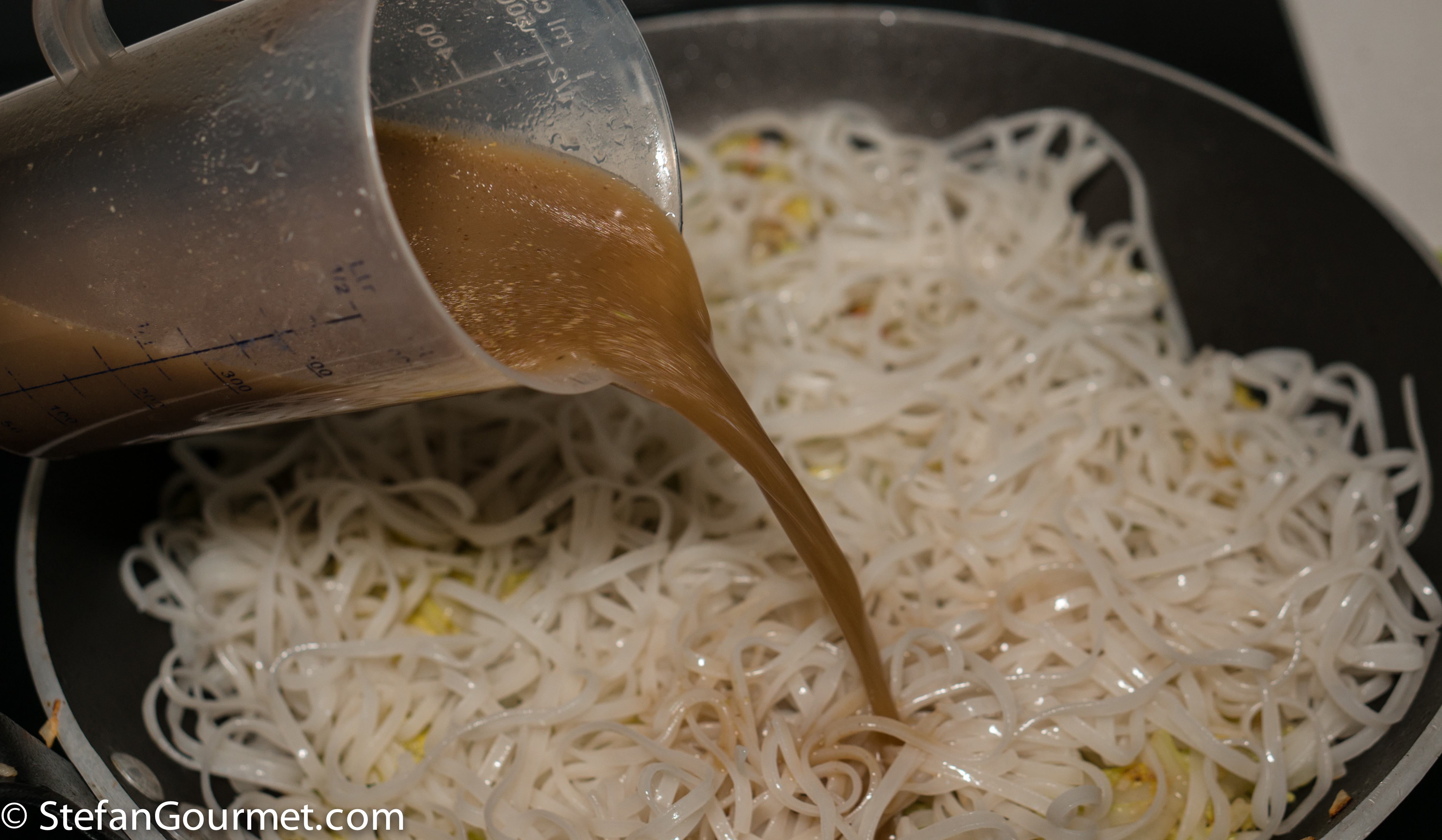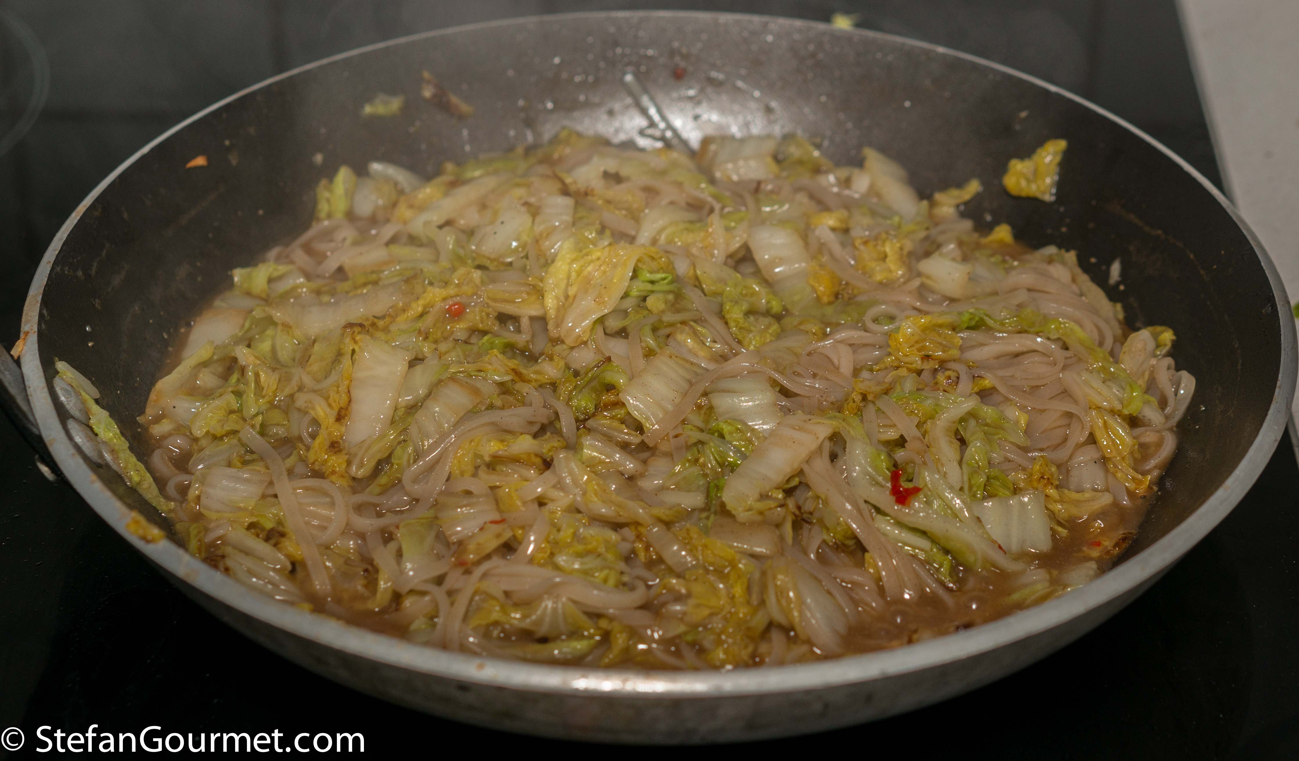 Mix 250 ml (1 cup) of concentrated duck stock with 1 Tbsp soy sauce, 2 tsp corn starch, and 2 tsp five-spice powder. Add this mixture to the cabbage, together with the parboiled noodles.
