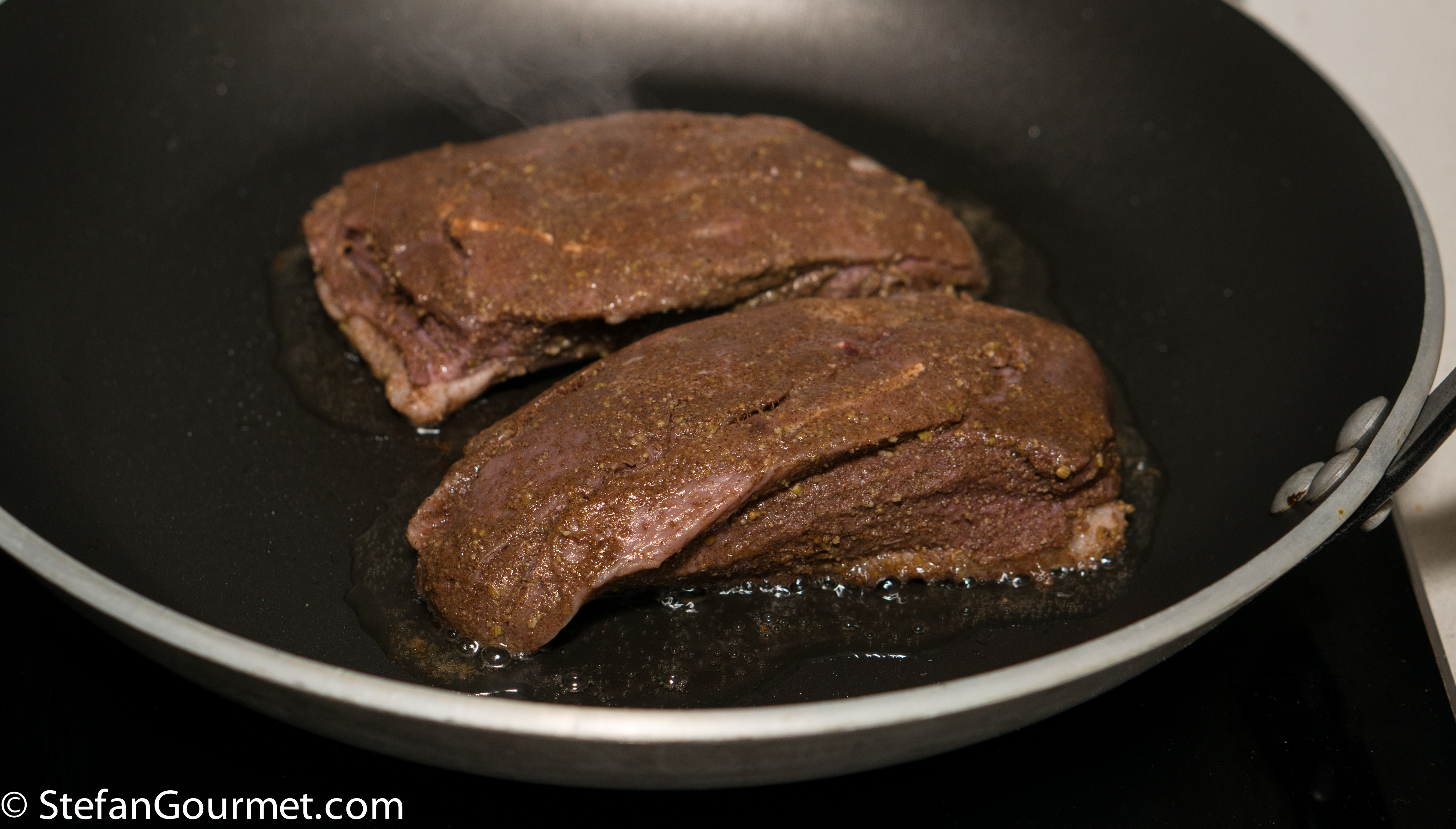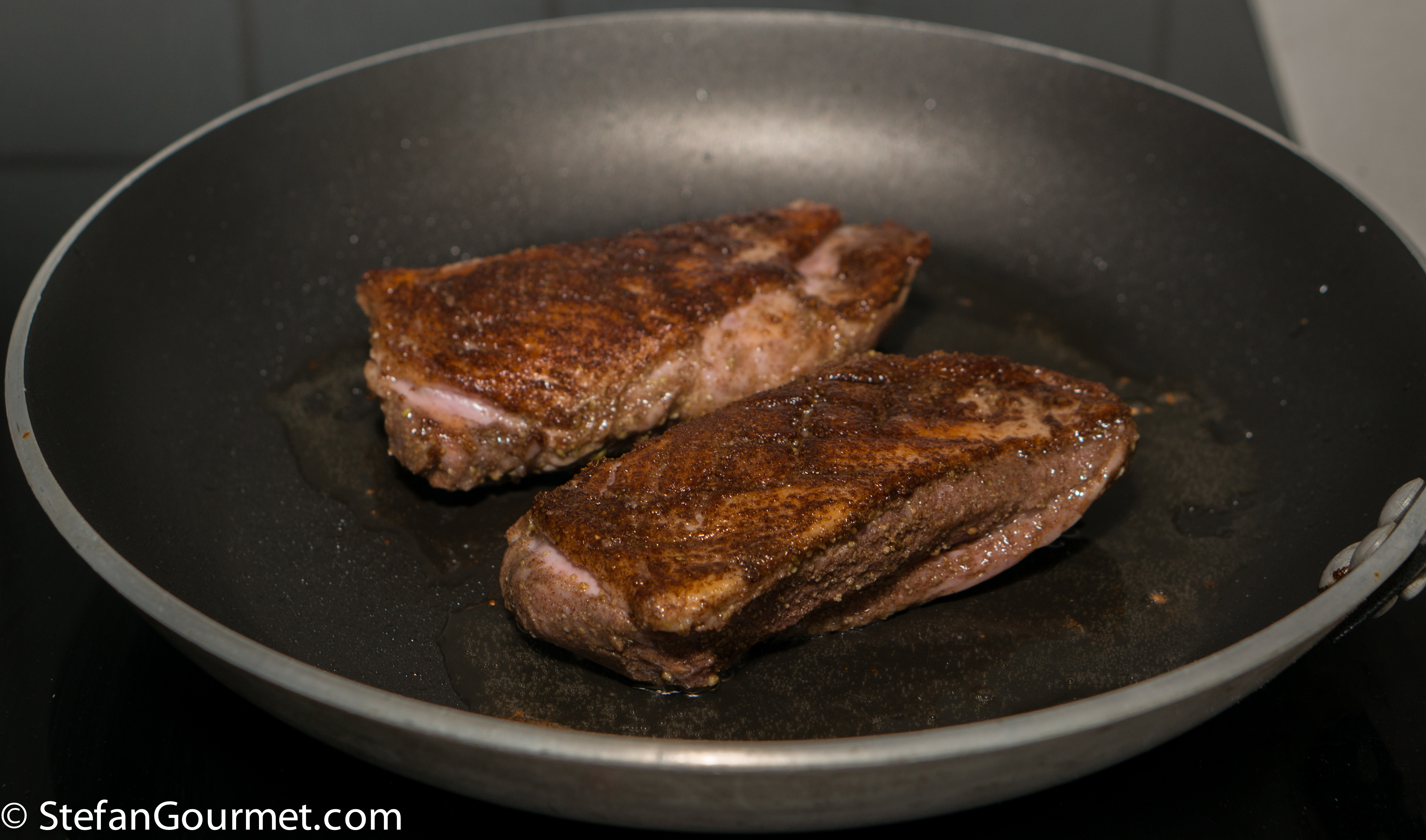 When the duck breasts have been cooked sous-vide, take them out of the bag and sear them in a dry frying pan, skin side down, over high heat until the skin is nicely browned (about 3 minutes).