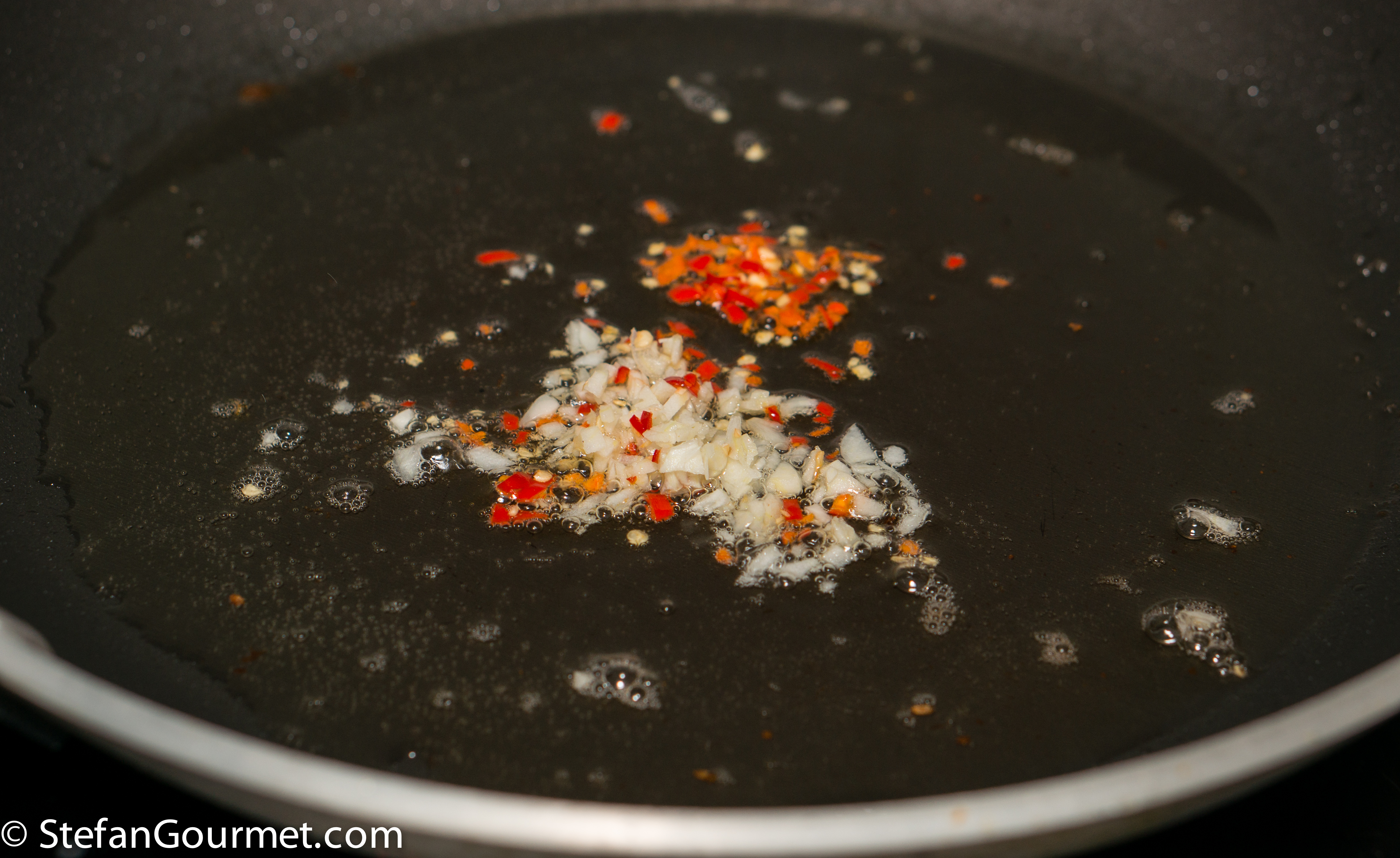 Add a minced red chilli, and a minced clove of garlic, and stir for 30 seconds.