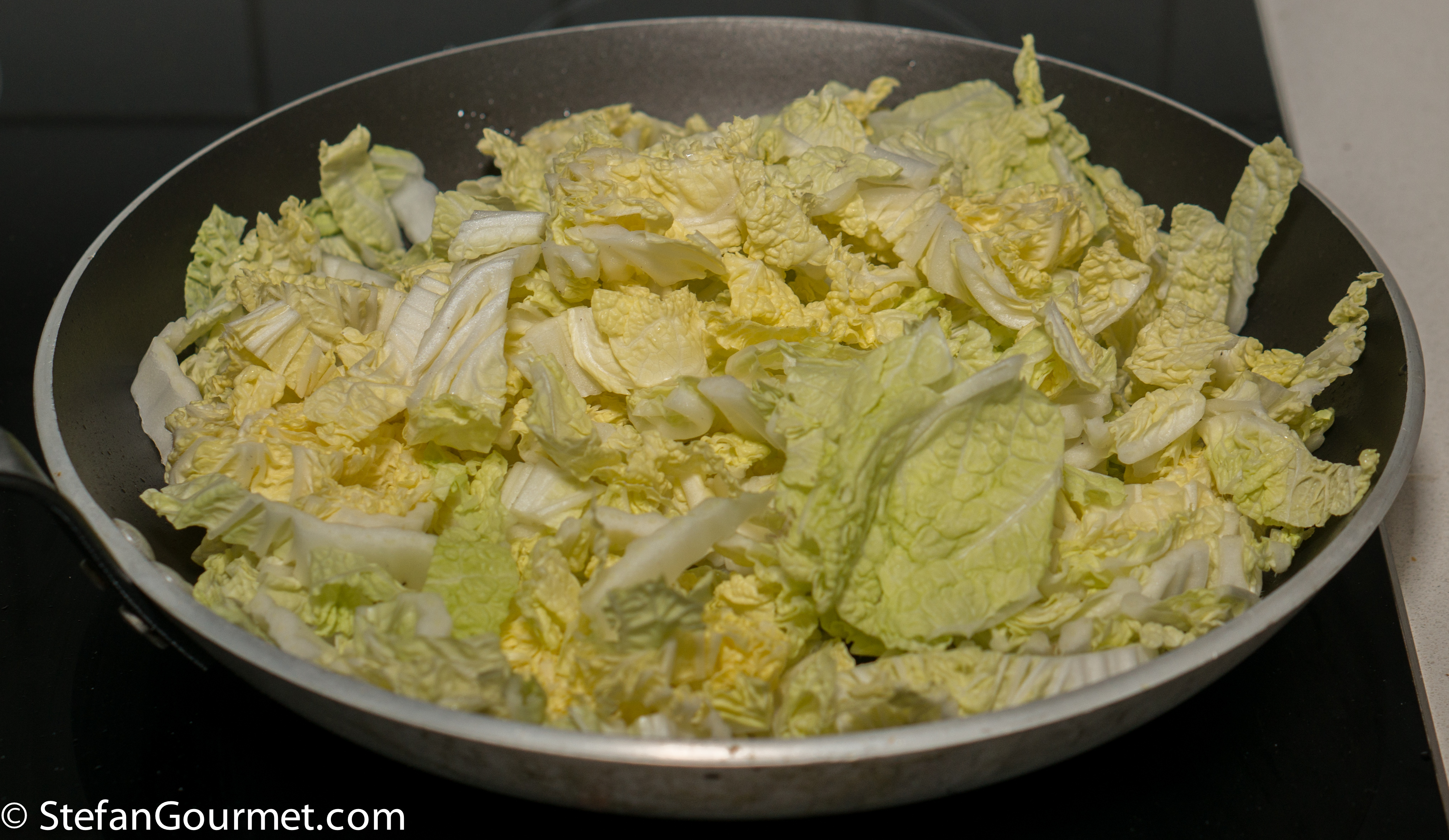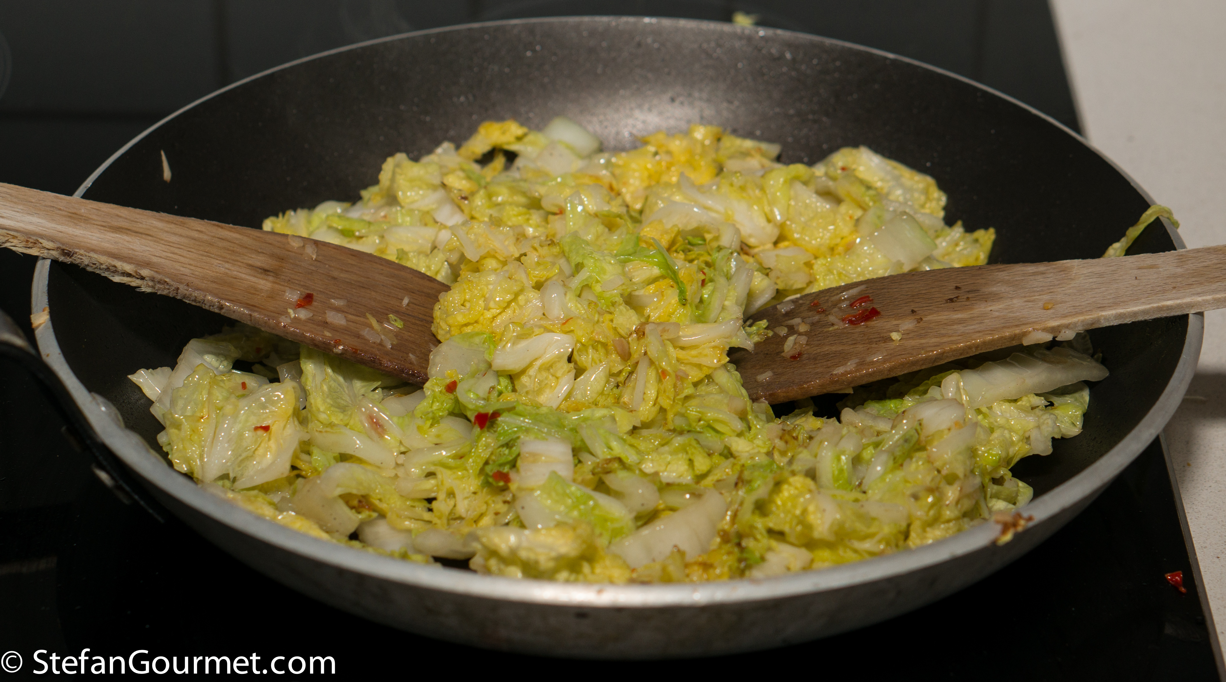 Stir-fry until the napa cabbage is tender but still firm to the bite.