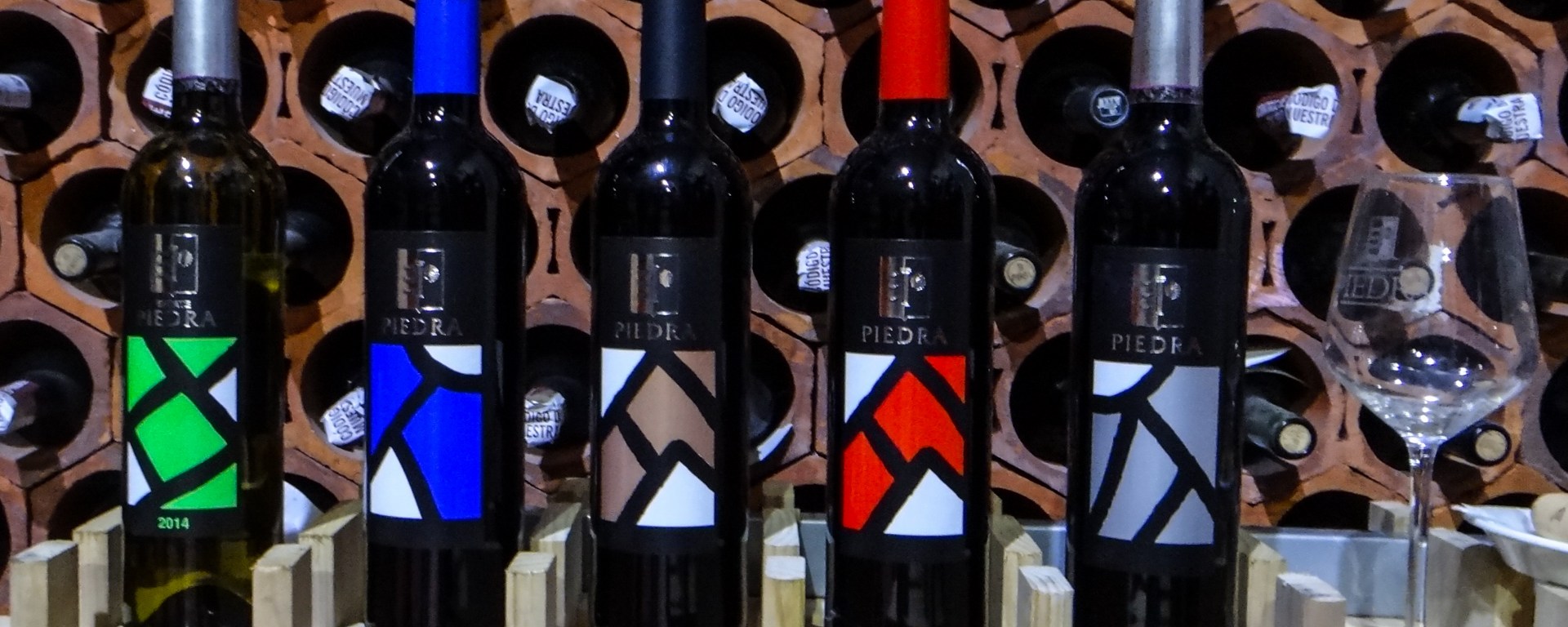 The labels of Piedra wines have a color to indicate the amount of oak aging (blue = joven = no oak, tan = roble = 6 months oak, red = crianza = 12 months oak, platinum = gran reserva = 18 months oak). What looks like an abstract design is actually a map of the vineyards. They also produce gran reservas, aged for two years in oak, but they have different labels and names (La Garona and Paredinas). The green label is a verdejo from the neighboring DO of Rueda. Unlike the usual verdejo, this is aged with the lees for four months, stirred twice per week, and then for about a year in bottle. This gives the wine more body and complexity. Here are my tasting notes.