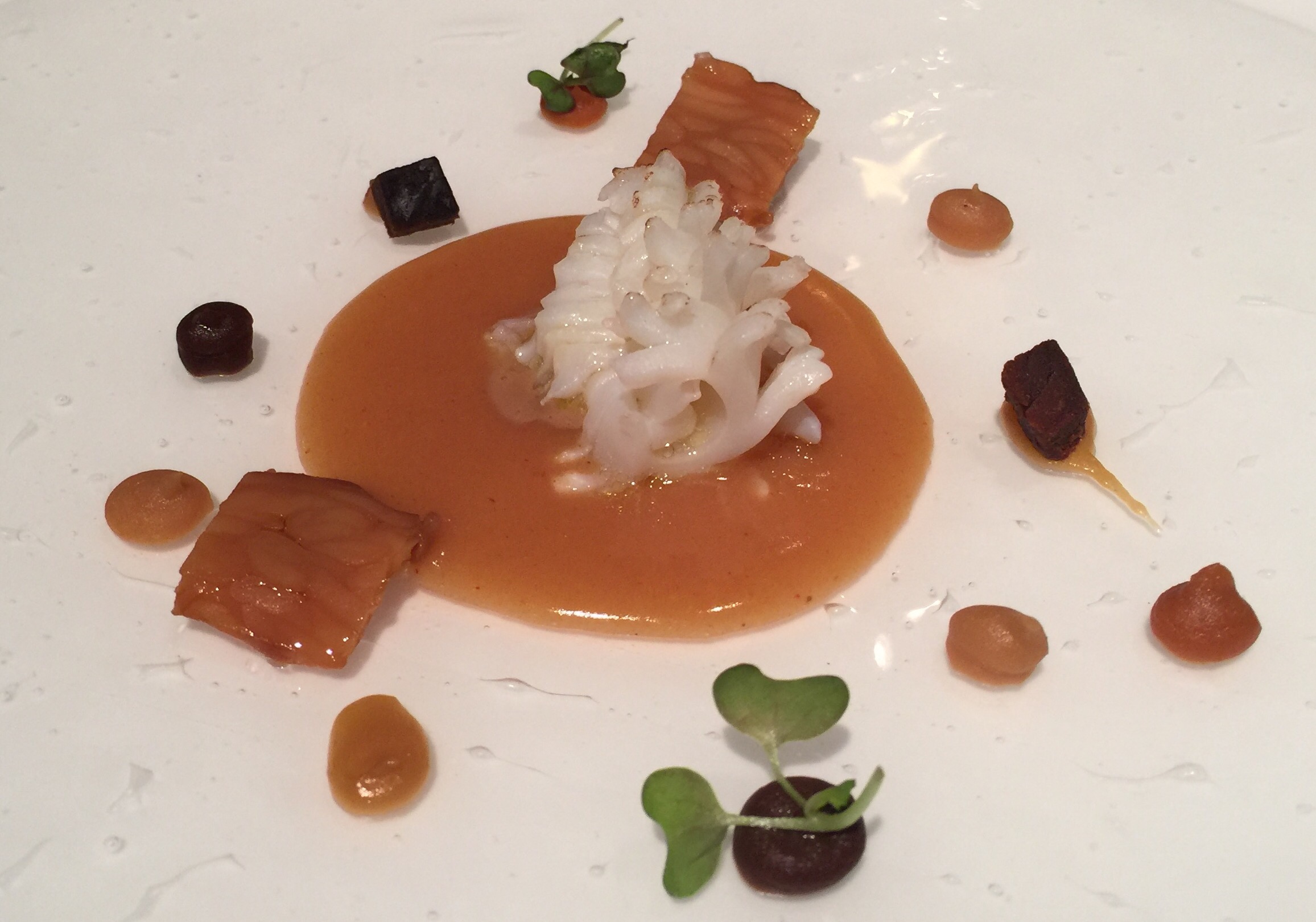 Red mullet with kombu, prickly pea foam, sea anemone, salicornia, and katsuobushi vinegar, paired with a 2014 Sancerre. The red mullet with kombu was divine and worked well with the Sancerre. The Sancerre became even more acidic than it already was from the fruity prickly pear, so the only wine pairing of the evening that was questionable. Still a nice dish, 8/10.