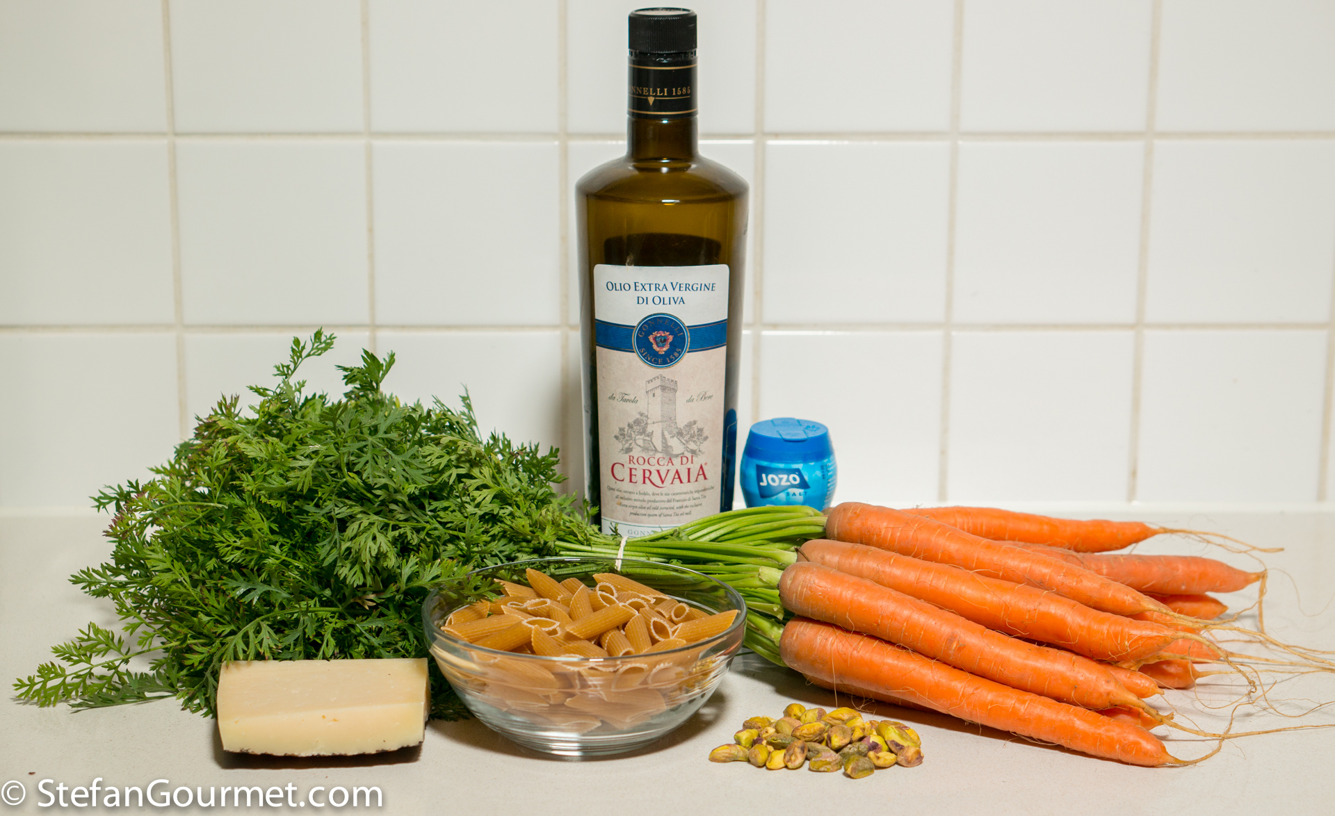 I like using everything and reducing waste. When you buy a bunch of carrots, they come with the greens, but usually those are discarded or used to feed the rabbits if you have them. I’ve already posted recipes to use parts that are usually discarded, such as asparagus ends, the greens from radishes, or shrimp heads and shells. Then I saw a post by Marina Baccos about spaghetti with pesto made from carrot tops: Spaghetti con Pesto alle Foglie di Carota. So far I had always discarded carrot greens, mainly because I worry about pesticides that are used on the greens. But thanks to Marina’s post, I decided to get a bunch of organic carrots to make a vegetarian pasta dish. The carrot greens have a very ‘green’ flavor. I included the carrots themselves, which turned out to be a great idea, as the sweetness of the roasted carrots worked very well with the ‘green’ flavor of the pesto. To make it even more nutritious, I used wholewheat penne pasta. In my experience, the texture of wholewheat spaghetti isn’t very good, but wholewheat short pasta is pretty good. Marina, ti ringrazio per l’ispirazione! Here’s what I did…