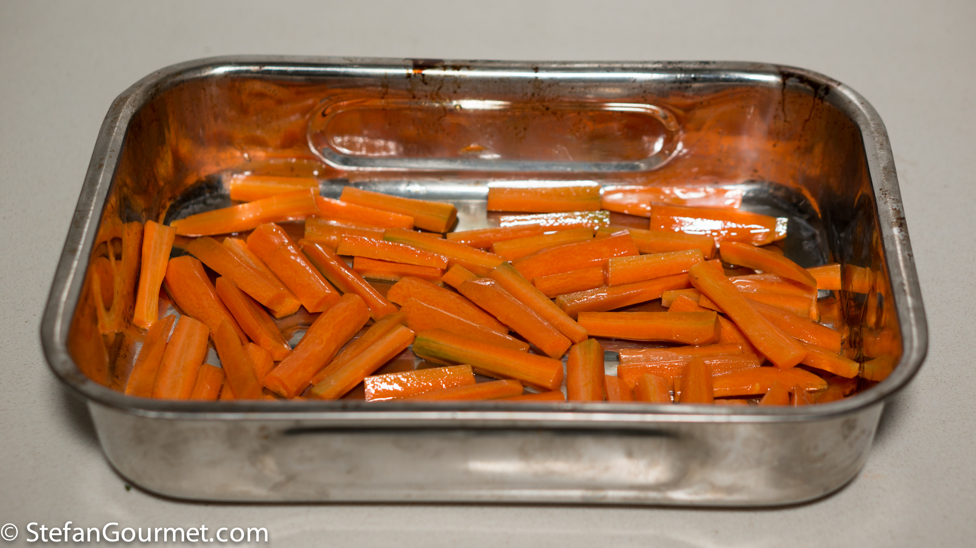 Roast the carrots at 225C/440F until they are tender and starting to catch, about 30-45 minutes. Stir them every 15 minutes or so.