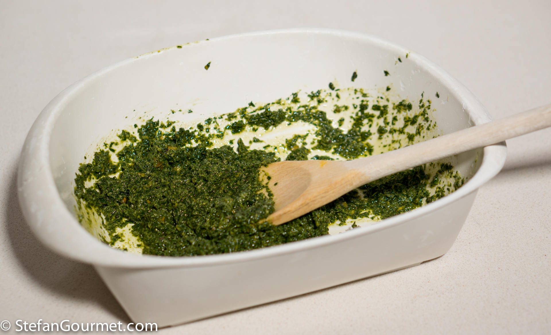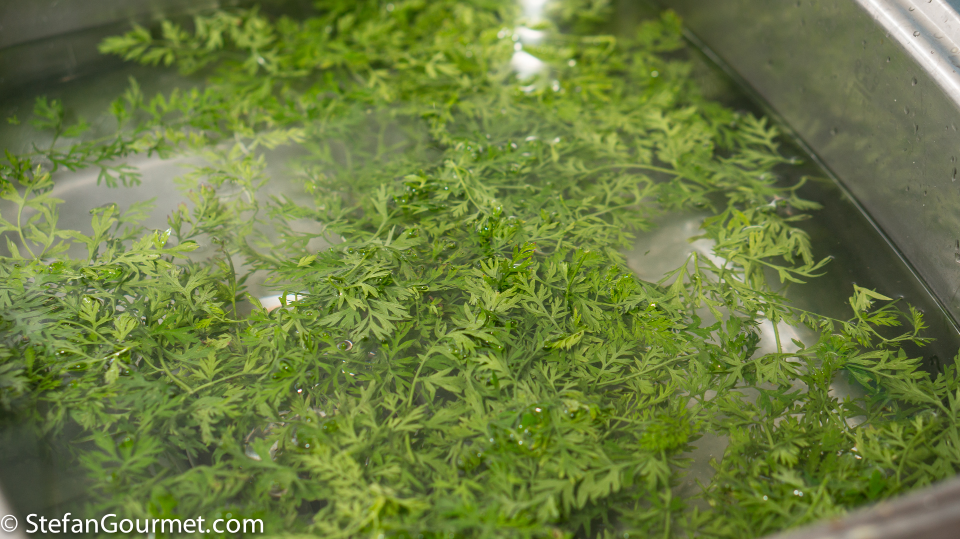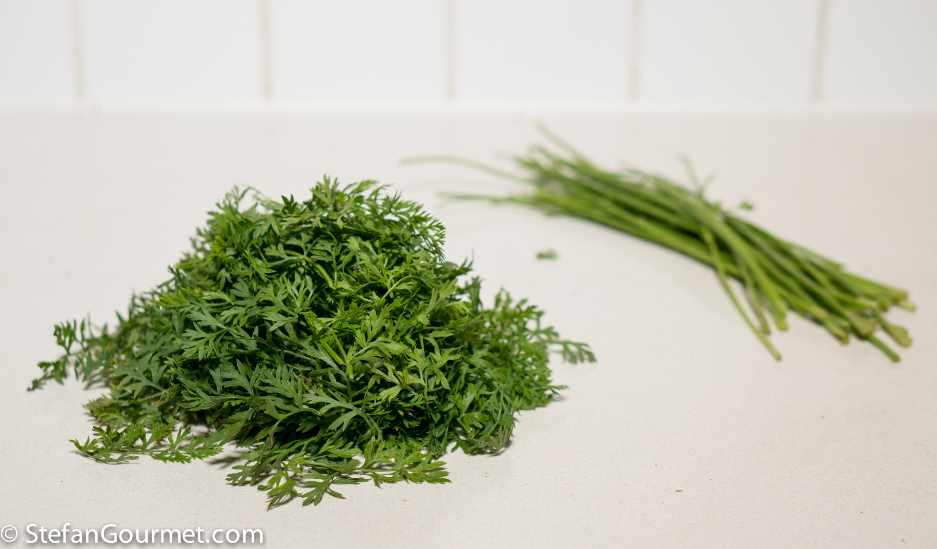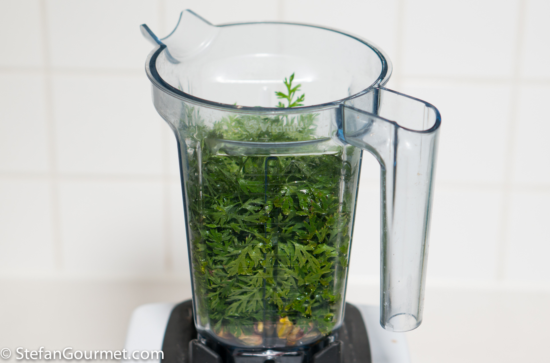 Meanwhile, select the best looking carrot greens and separate the tender leaves from the tough stalks. You will need about 50-60 grams (2 oz) of the leaves.