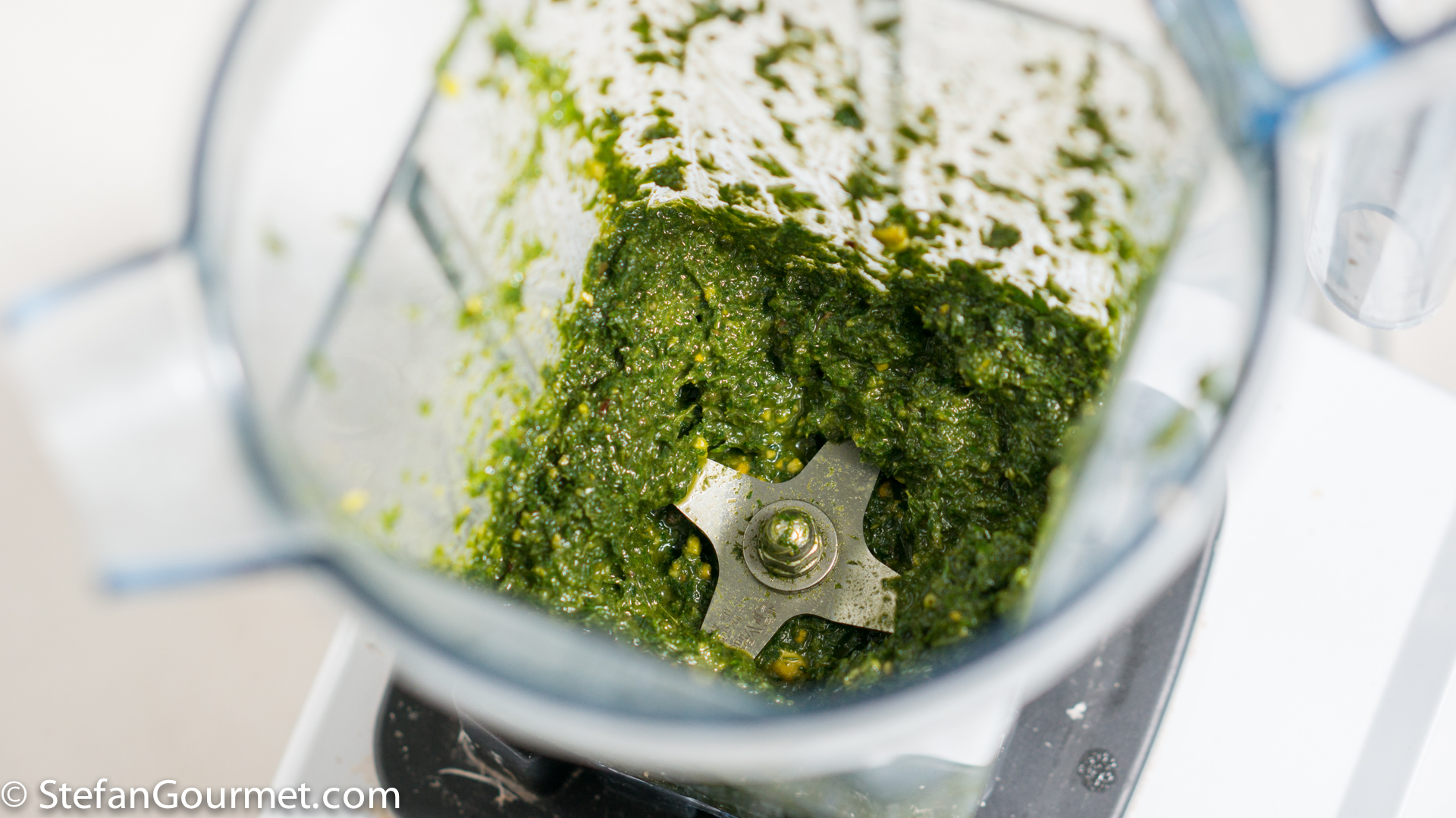 Put the carrot greens in the blender together with 20 grams of pistachios, salt, and about 60 ml (1/4 cup) good quality extra virgin olive oil.