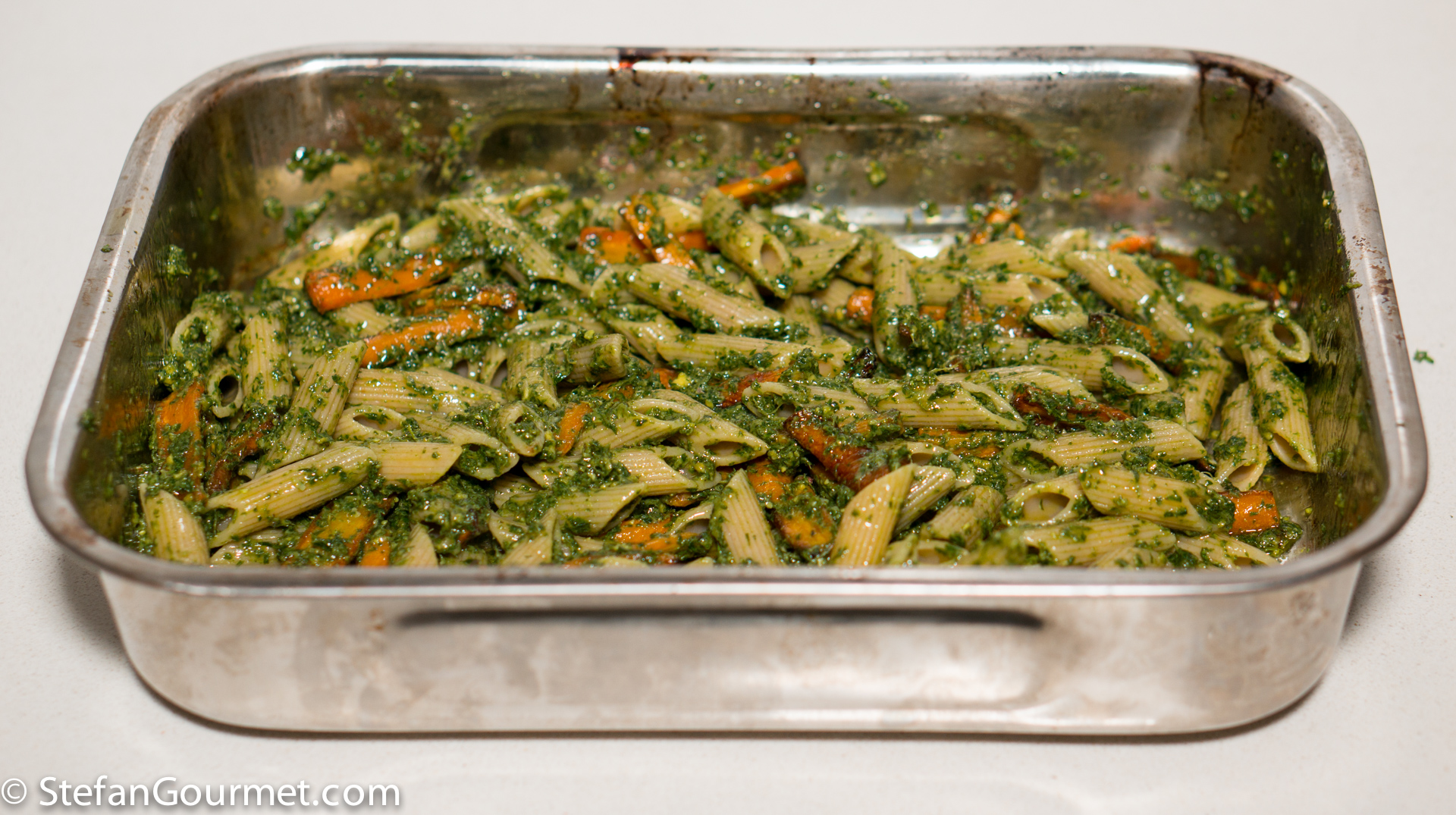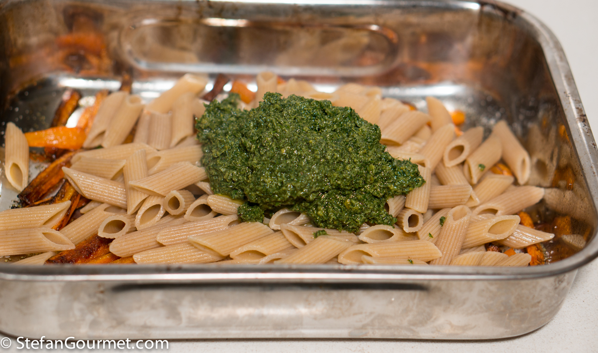 When the pasta is done, drain and add to the carrots in the roasting tray together with the pesto.