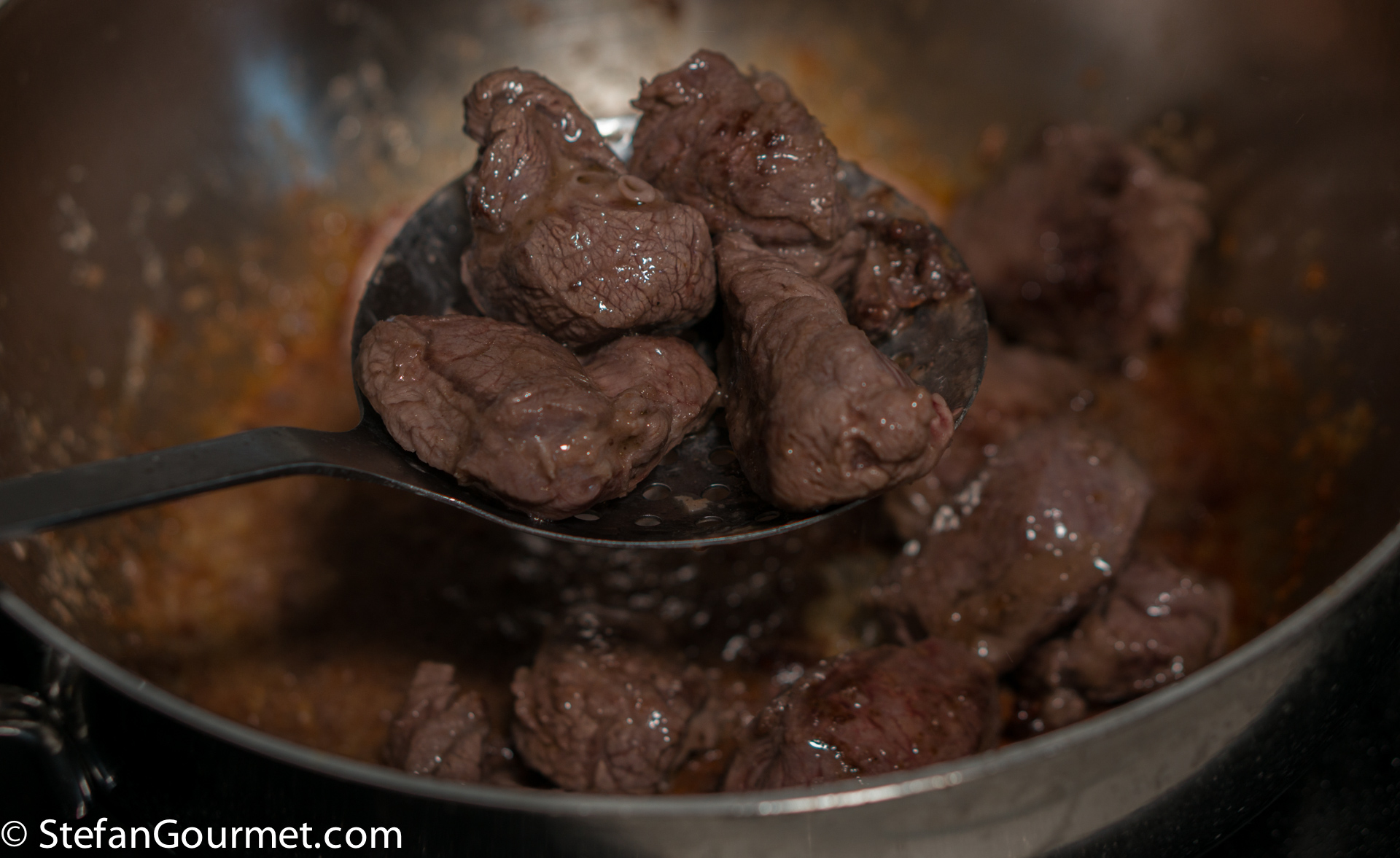 Take the venison out with a slotted spoon as soon as it is nicely browned on all sides…