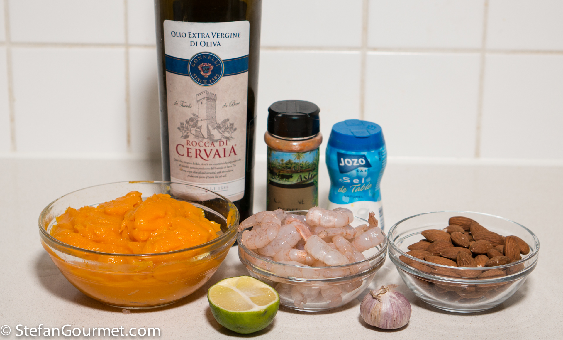 I always like it when I get requests for a dinner party, because it makes it easier to choose what to make. In this case, the request was something with shrimp and garlic. Because of the season I looked for autumn flavors that would work well with shrimp and garlic. As shrimp are earthy and sweet, pumpkin seemed a good choice. Especially since I still had some pumpkin puree in my refrigerator leftover from making bacon-wrapped scallops with pumpkin. To add some crunch that would work well with both shrimp and pumpkin and stay within the autumn theme, I decided to include almonds. And finally just a bit of lime and chilli pepper to add some excitement. The dish turned out well, it was delicious and well appreciated. Here’s what I did…