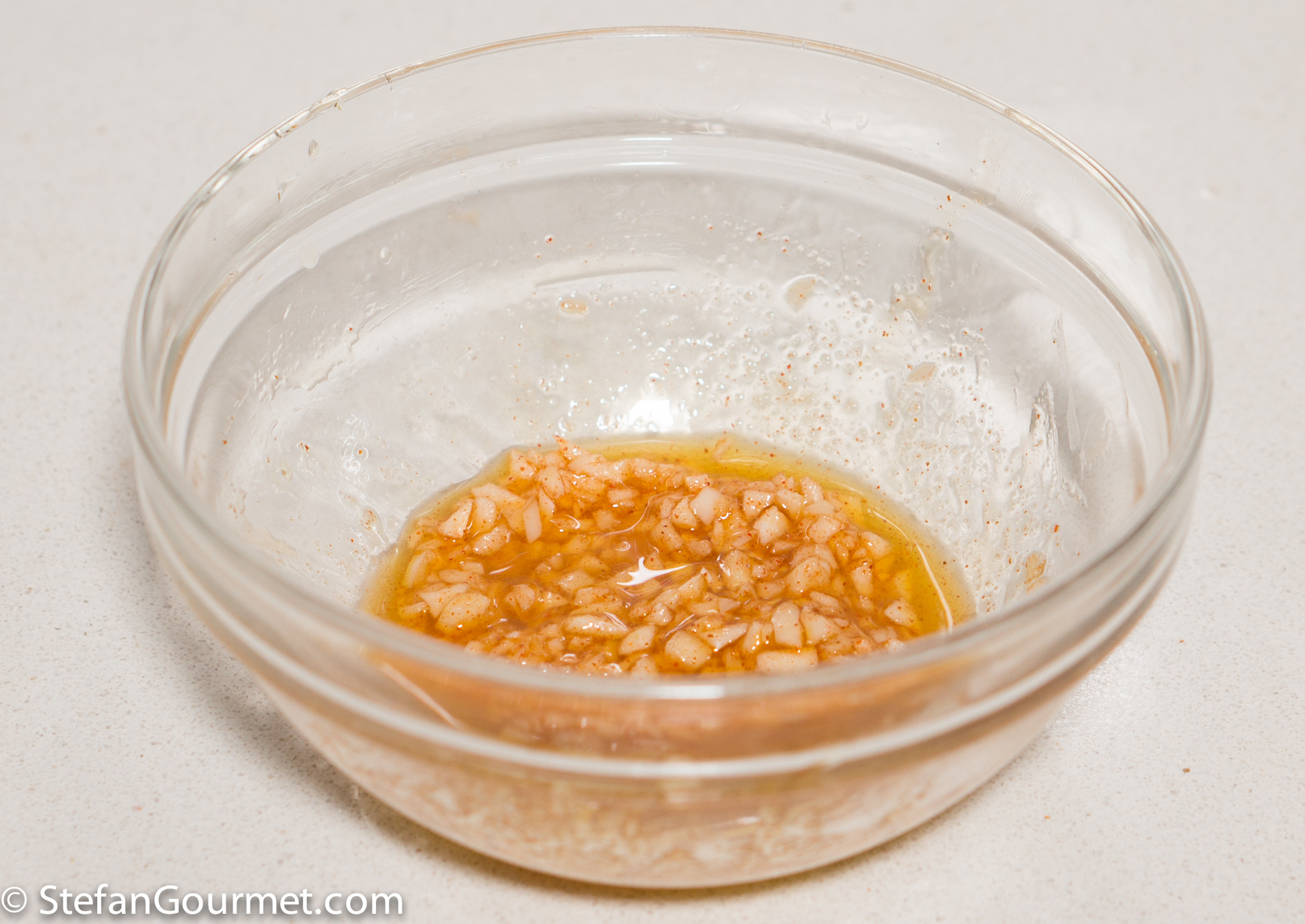 Combine a tablespoon of olive oil with 1/2 tsp salt, 1/4 tsp cayenne pepper, and 2 minced garlic cloves. Stir to mix.