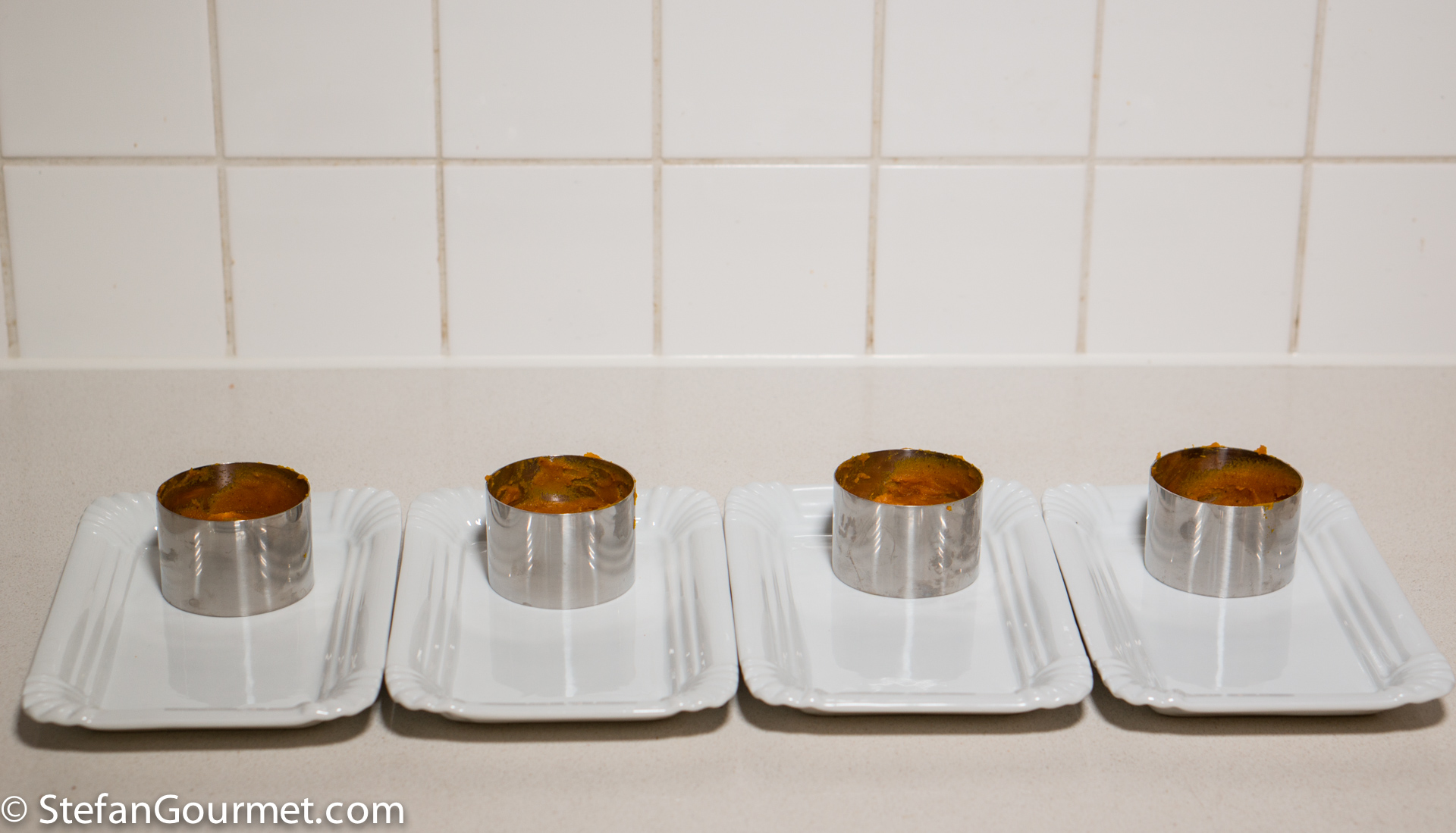 Use 5 cm (2″) ring molds to arrange the pumpkin puree on individual plates.