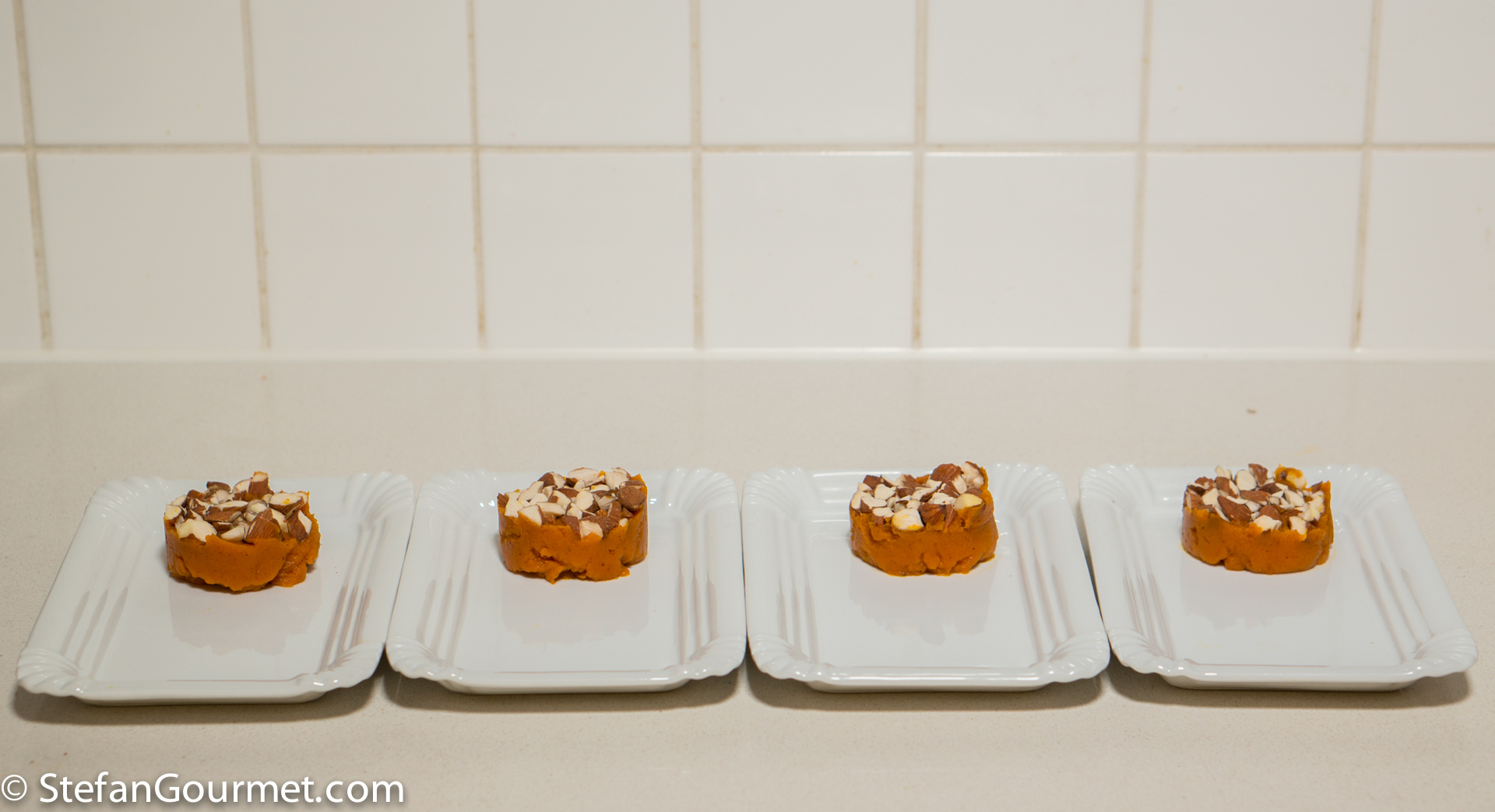 Arrange the almonds on top, then remove the ring moulds and bake for 5 to 10 minutes in the oven at 180C/350F to warm the pumpkin puree through and toast the almonds.