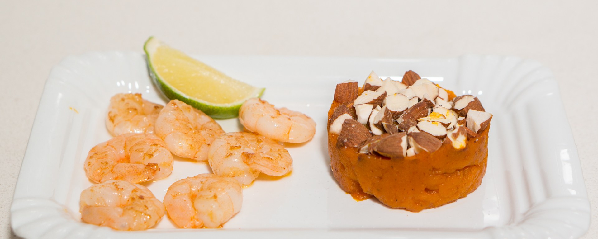 Take the plates with the pumpkin and almond out of the oven, arrange the sautéed shrimp alongside, and drizzle some freshly squeezed lime juice on the shrimp. Garnish with a wedge of lime.