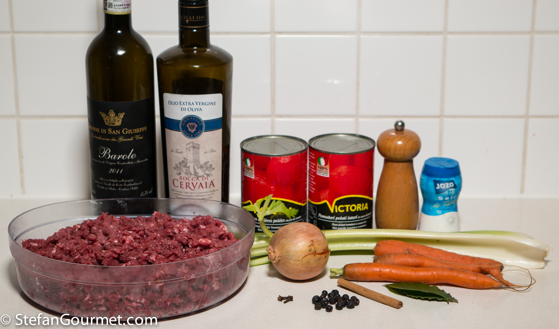 Ragù is the Italian word for a meat sauce with or without tomato (in the latter case it is called bianco, white). It is not a tomato sauce with meat, but a meat sauce that may include tomatoes. Italian game stews and pasta sauces are generally quite similar: the ‘holy trinity’ of onions, carrots, and celery is used of course, and what sets them apart from regular stews and ragù is the use of spices, especially juniper berries. As venison is very lean meat, you may like to enrich the sauce with some cream before serving. It rounds out both flavor and texture of the sauce.