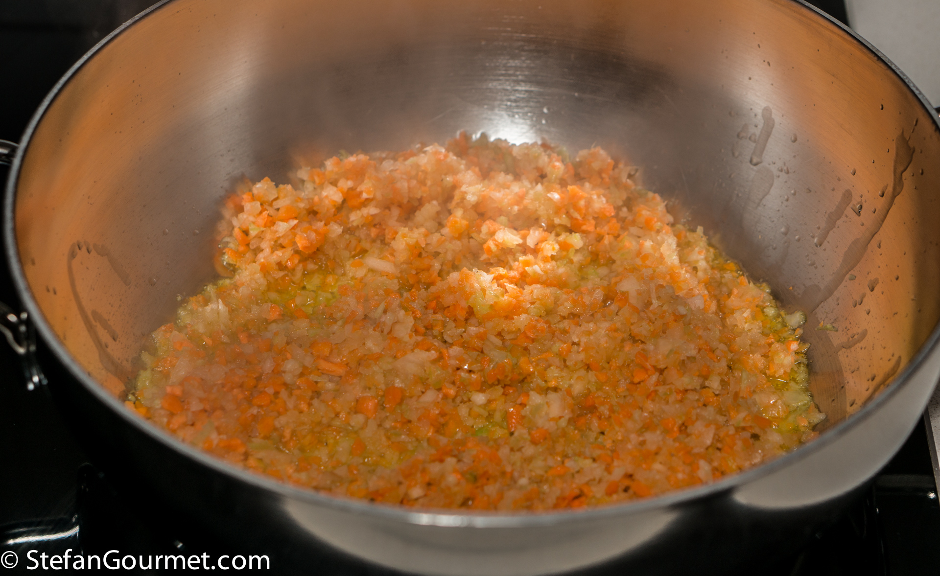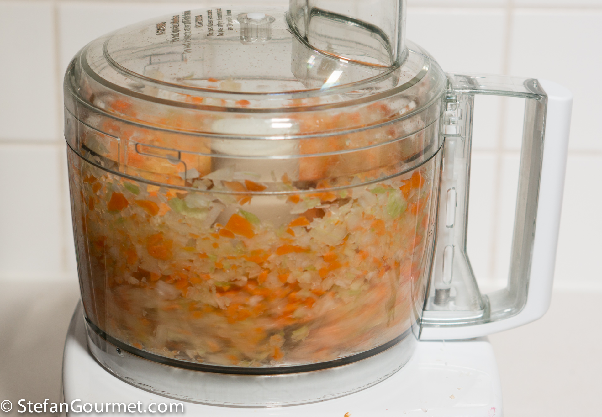 Mince the onion, carrot, and celery. The food processor can do this much more quickly than we can (or you have outstanding knife skills and a very bad food processor).