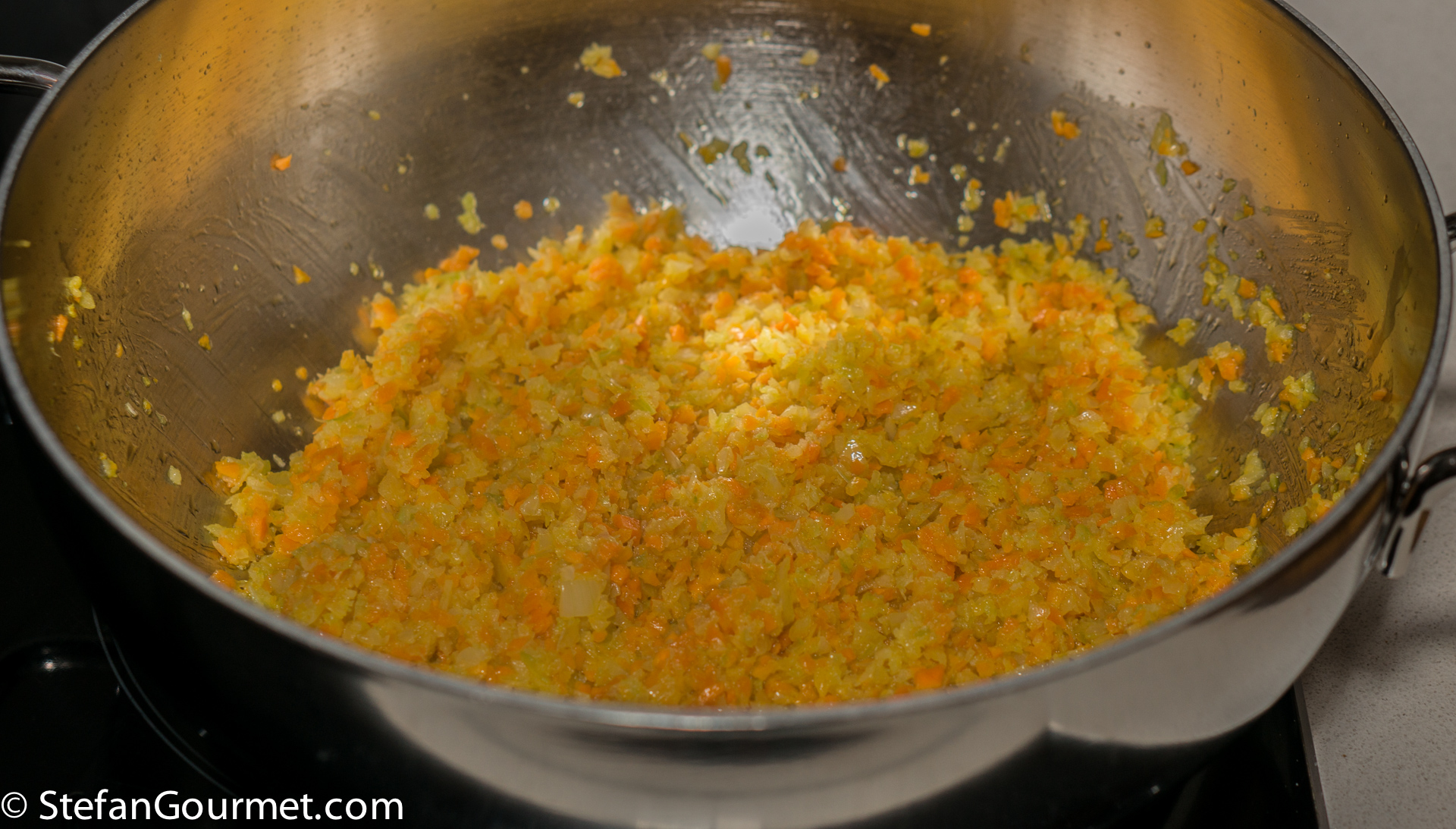Heat 4 tablespoons of olive oil in a casserole (Dutch oven) and add the minced trinity. Season with salt.