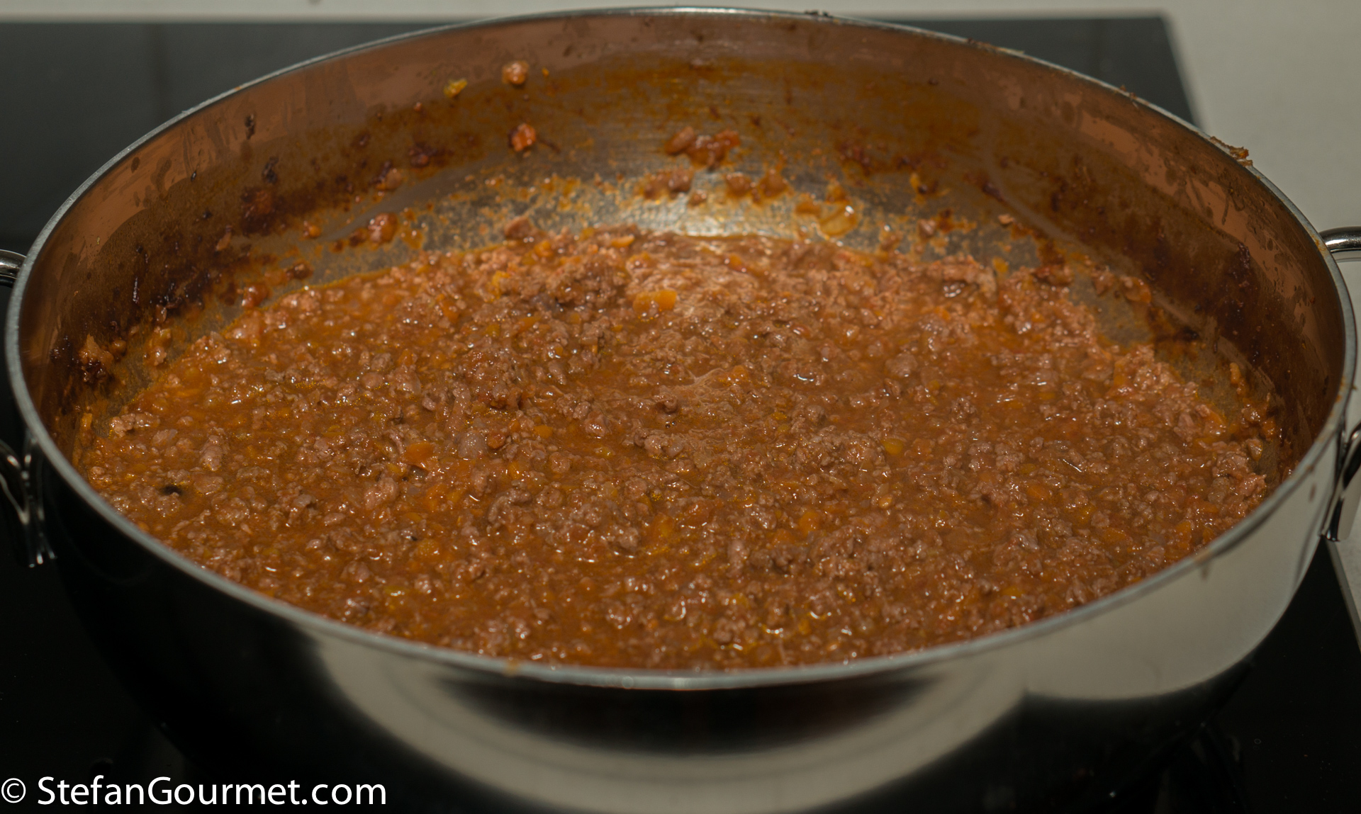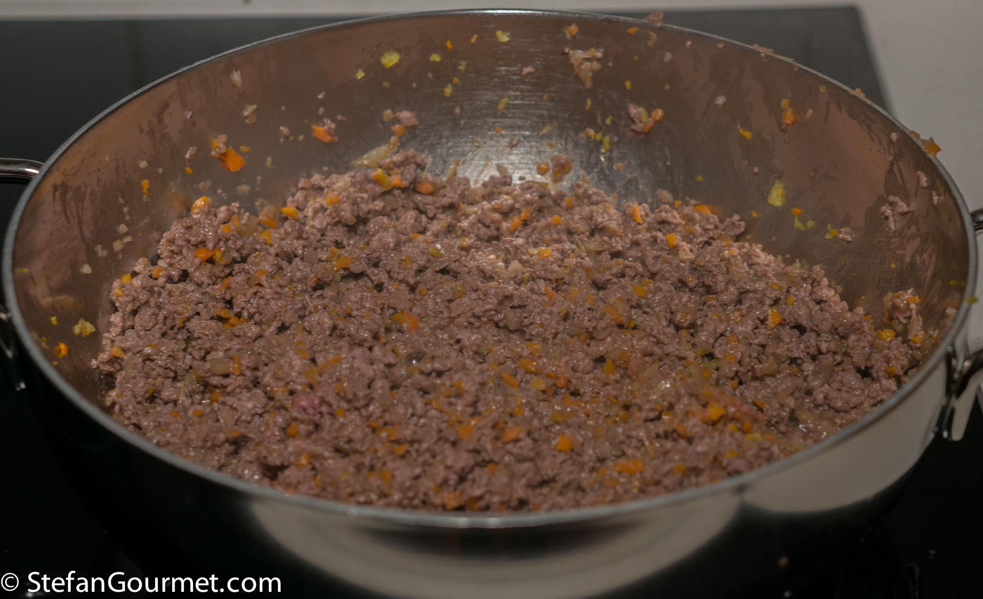 (I do not brown the meat because although it does produce some nice flavors, it makes the texture of the meat gritty. The nice flavors will come during the long cooking time anyway.)