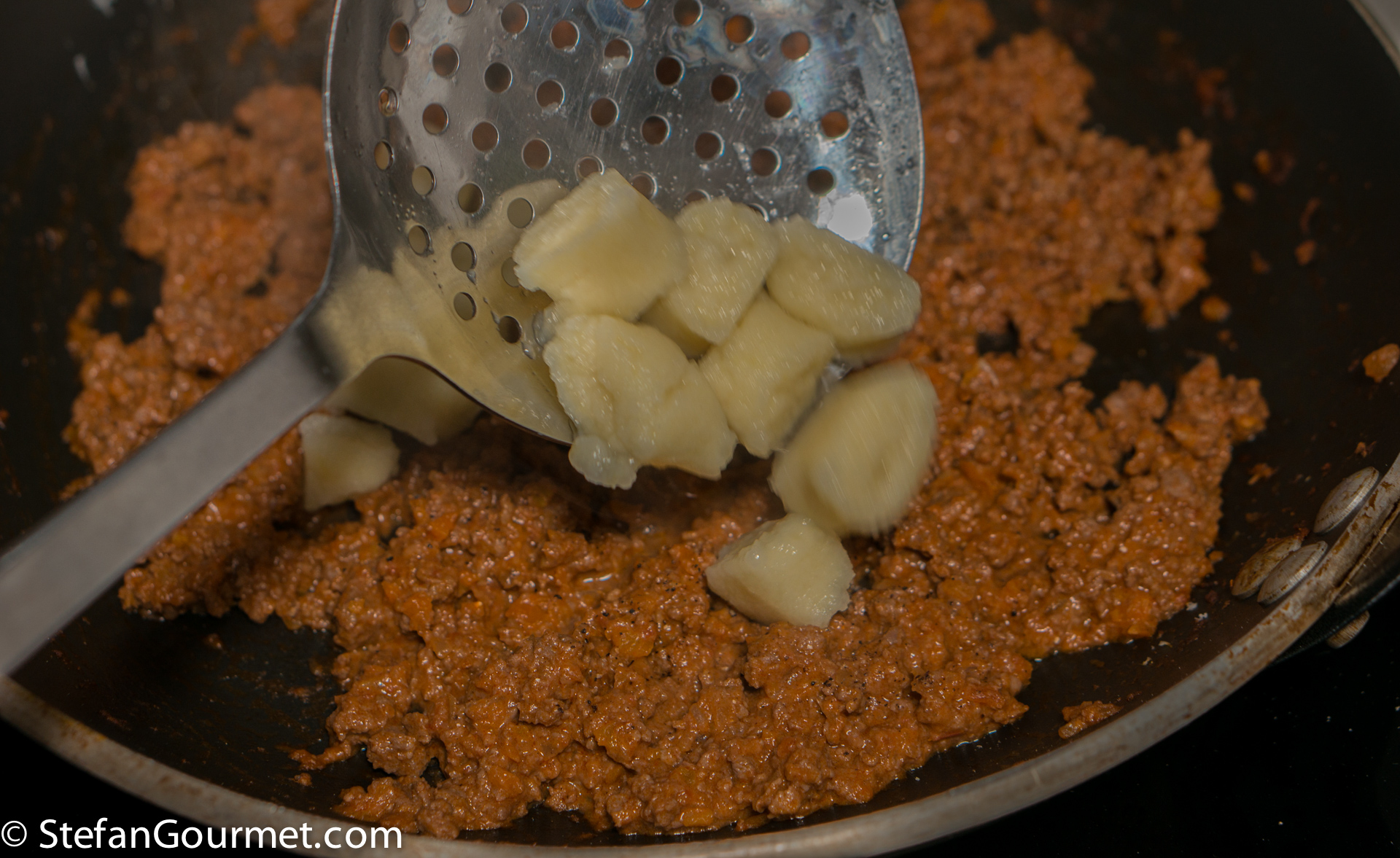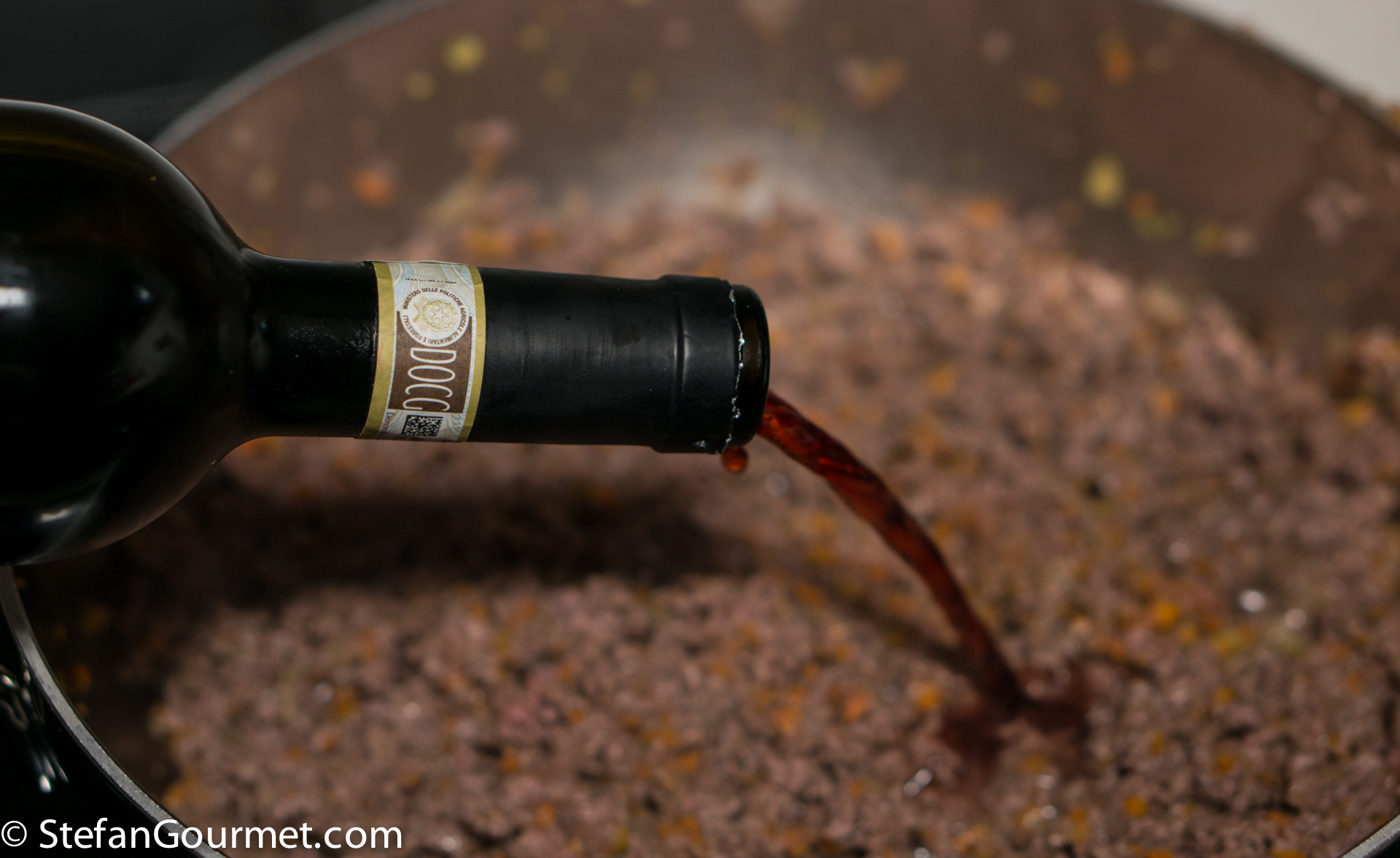 Add about a third of a bottle of good red wine. (Never use bad wine for cooking. There is no need to use a very expensive wine, but it should be good as you will definitely taste it if you use bad wine.) Cook for a couple of minutes, stirring.