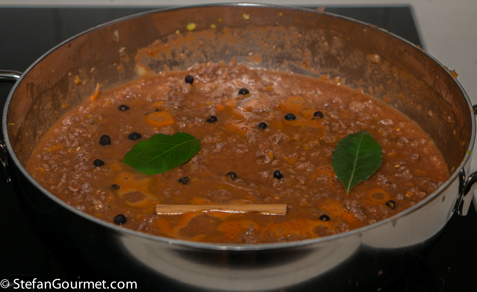 Remove the juniper berries, cinnamon, cloves, and bay leaves. At this point the ragù can be frozen (in portions) for later use.