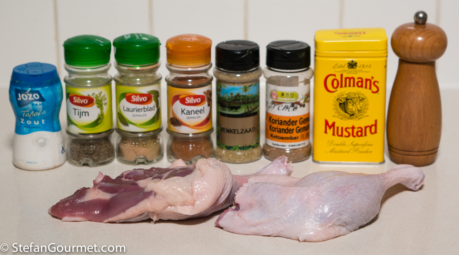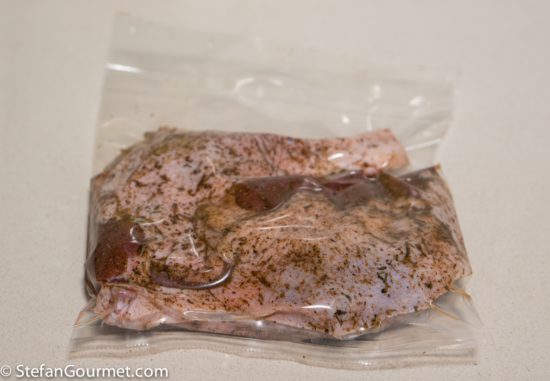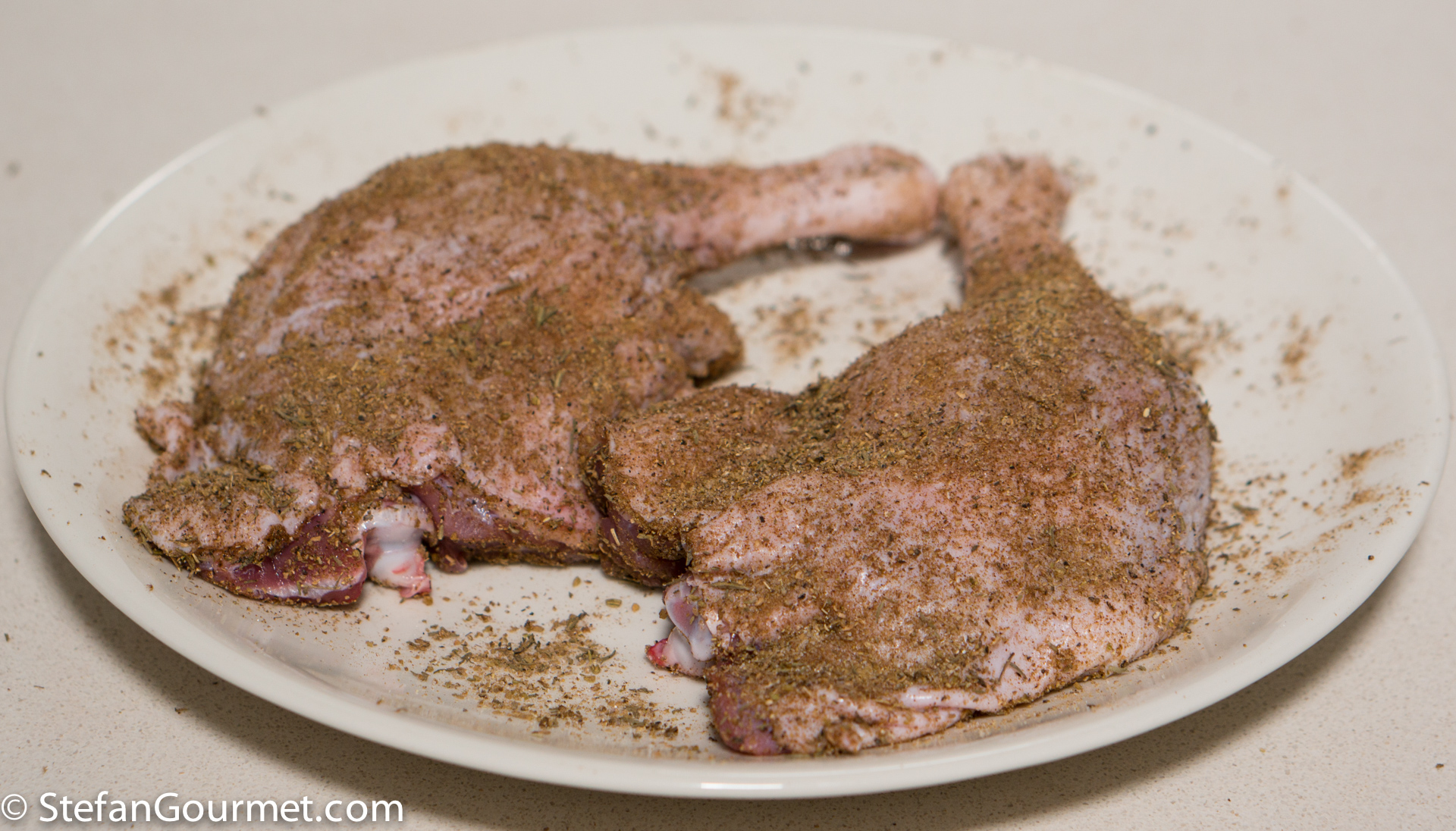 It is wonderful how much culinary inspiration I get from other bloggers and my followers. Today’s recipe was inspired by Cecil Brewer, a follower who e-mails me his ideas and recipes. Cecil uses a slightly different technique because he uses a brine instead of a dry rub and he smokes the duck legs much longer at a lower temperature (which I can’t do with my tabletop smoker), but the spices and the idea of combining smoking and sous-vide to prepare duck legs were the main factors of this recipe. And so it was definitely inspired by him. I really like the combination of smoking and sous-vide, because the smoky flavor penetrates deeply into the meat during the sous-vide cooking. The flavor of this duck leg is simply divine. The texture is like confit, but less greasy. Thanks for the inspiration, Cecil. Here’s what I did…
