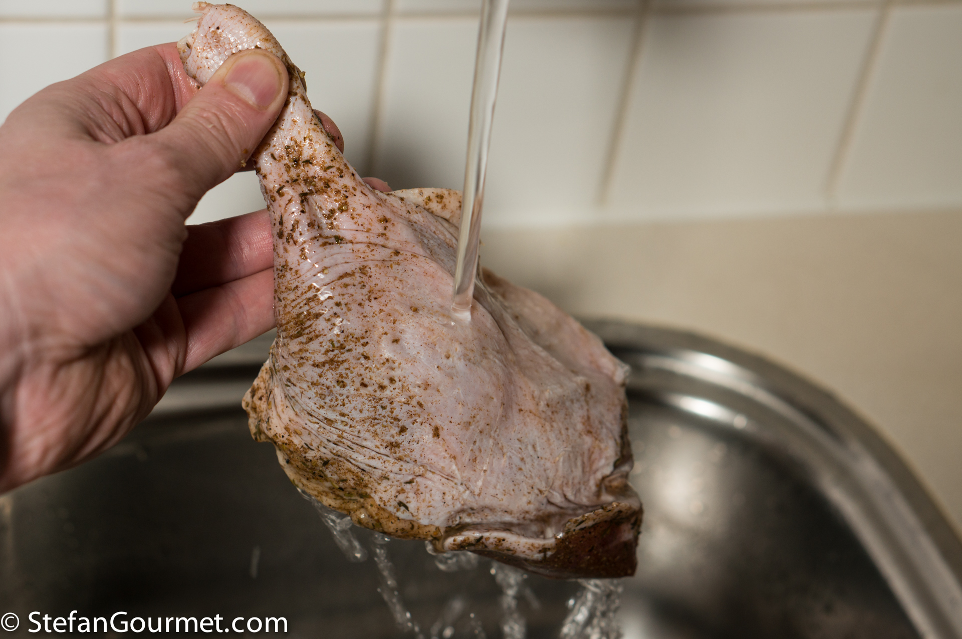 After those 48 hours, take the duck legs out of the bag and rinse them well under cold running water to remove any remaining salt and spices.