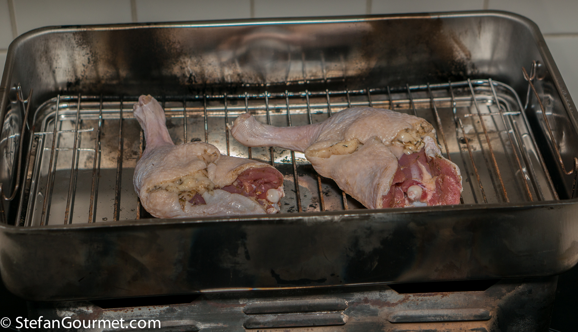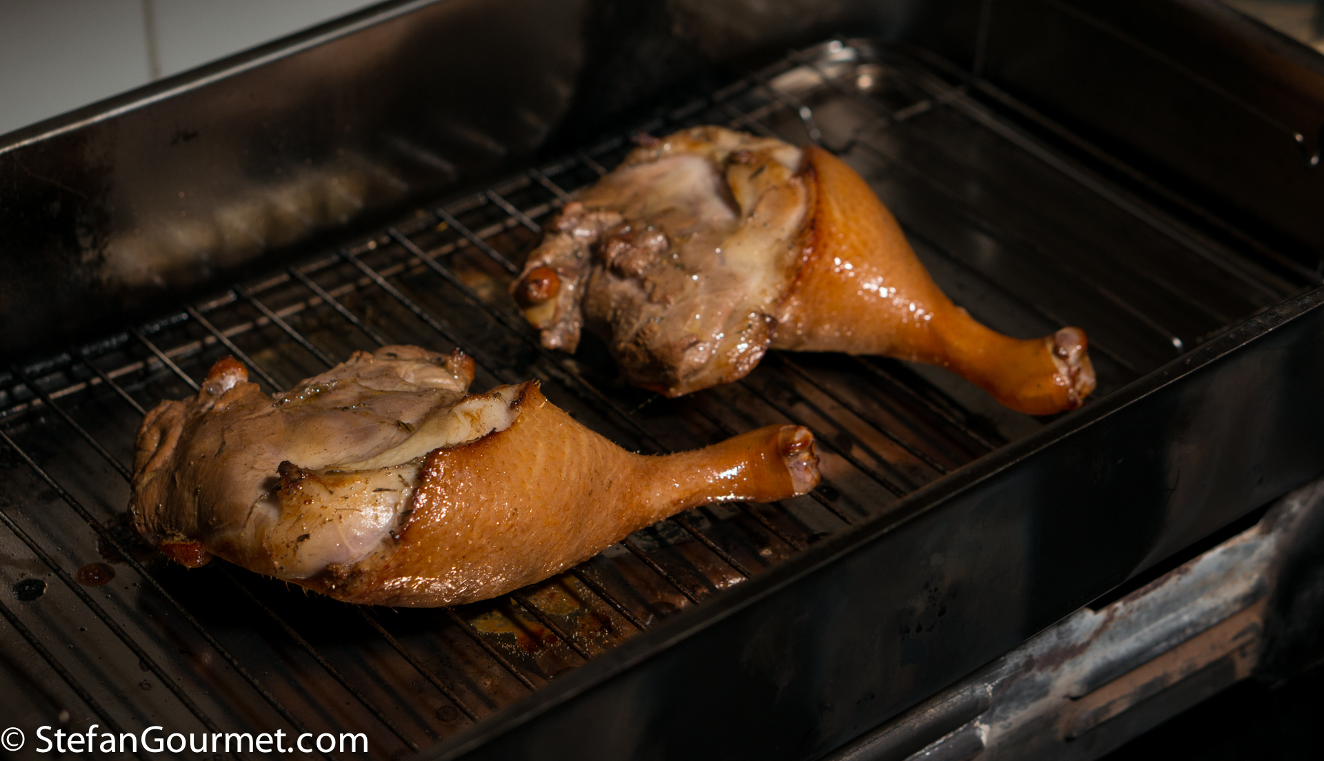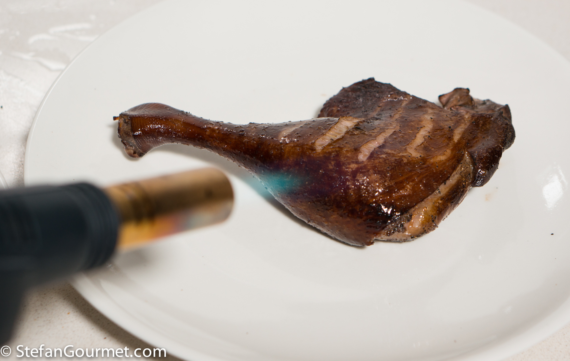 This is not enough to cook the duck legs, but it is enough to smoke the outside.