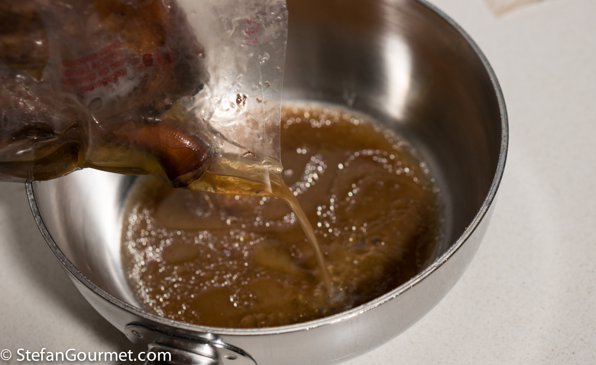 Pour the juices from the bag into a saucepan…
