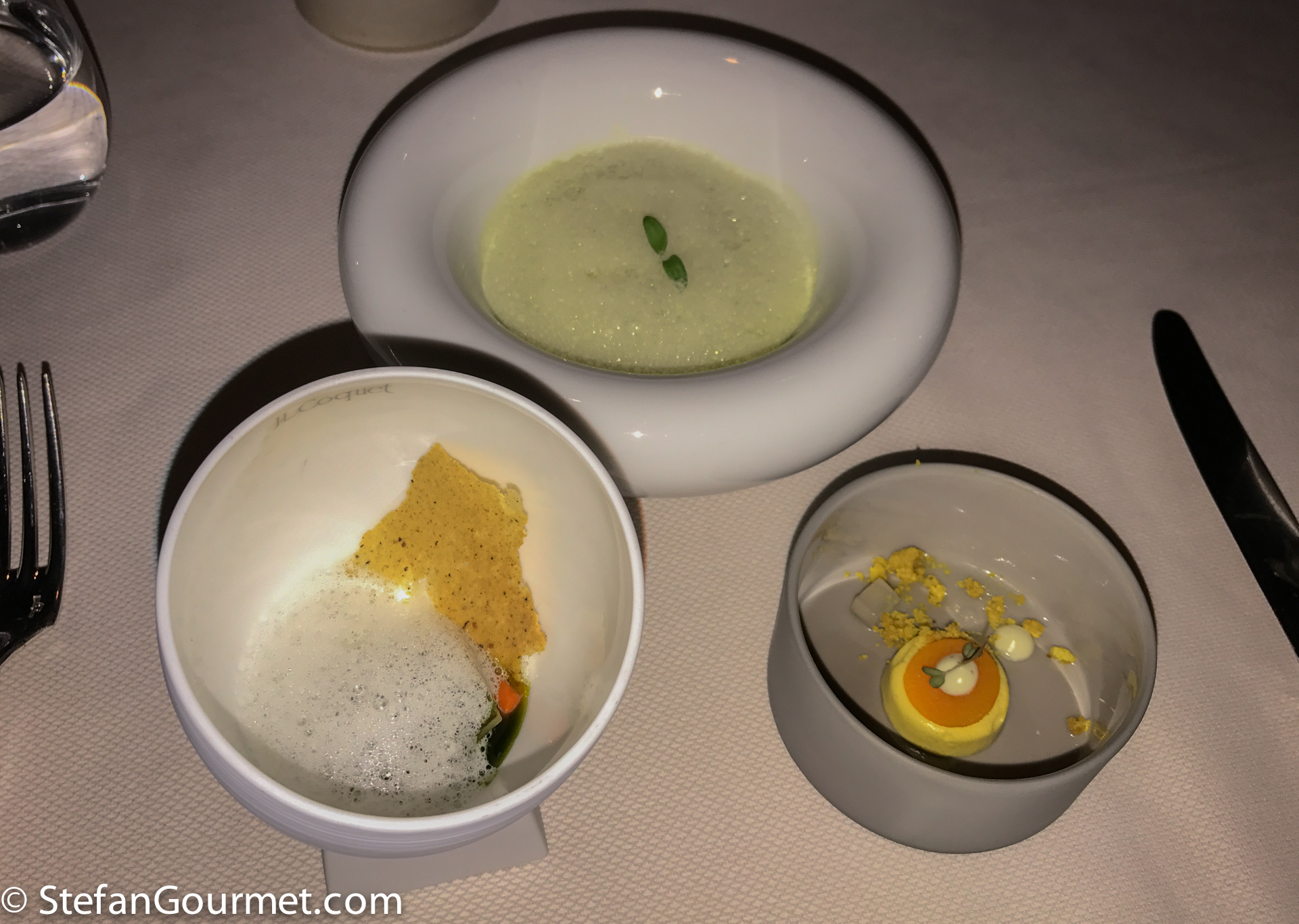 My favorite was the lukewarm oyster with Thai green curry. The eggplant with tomato and curry spices was also very nice. A very nice set of amuse bouche that worked well with the champagne, 9/10.