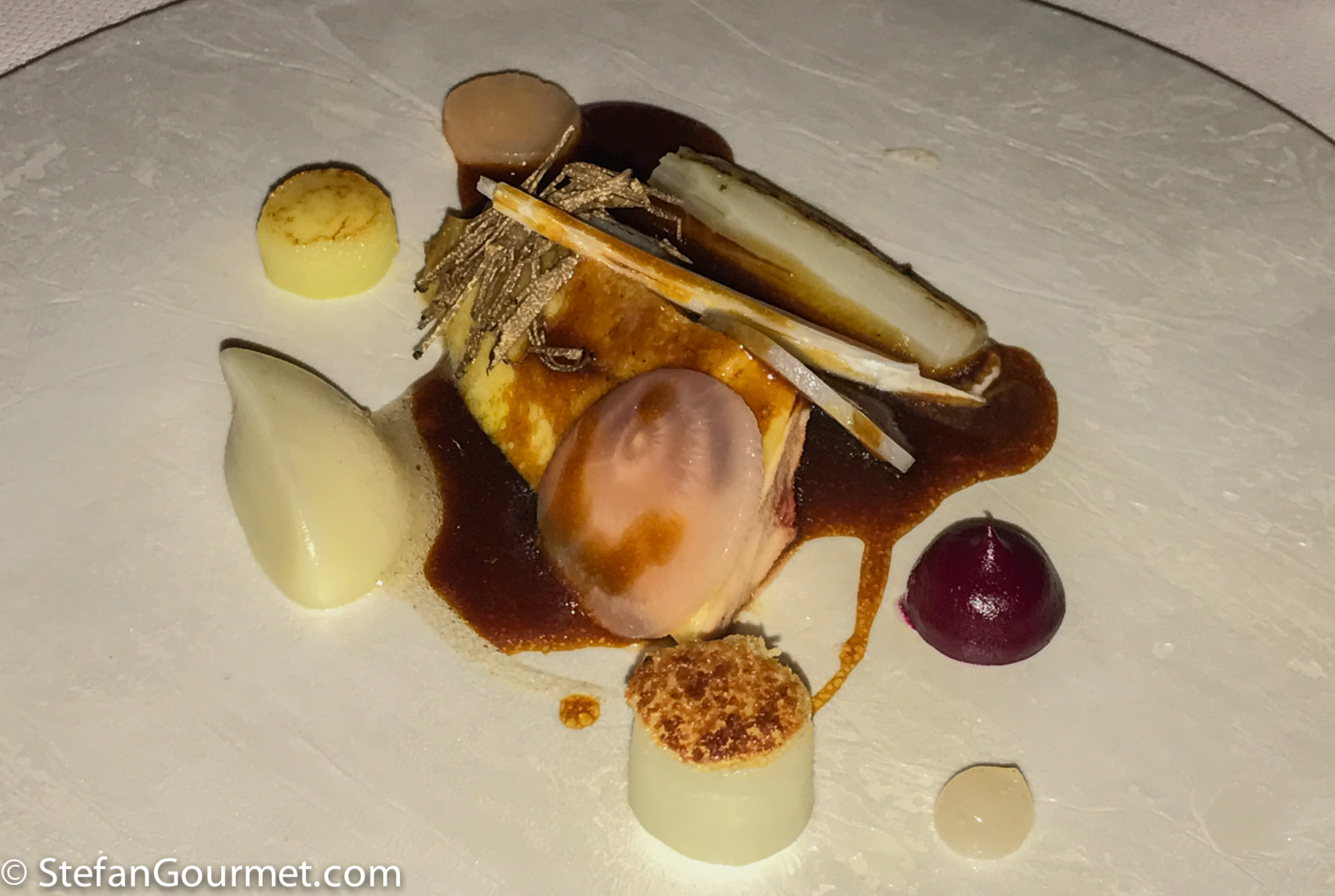 Pheasant with its own jus, truffle, roasted endives, and different textures of sunchokes. The pheasant breast was cooked perfectly (sous-vide) and the jus was very good. 10/10