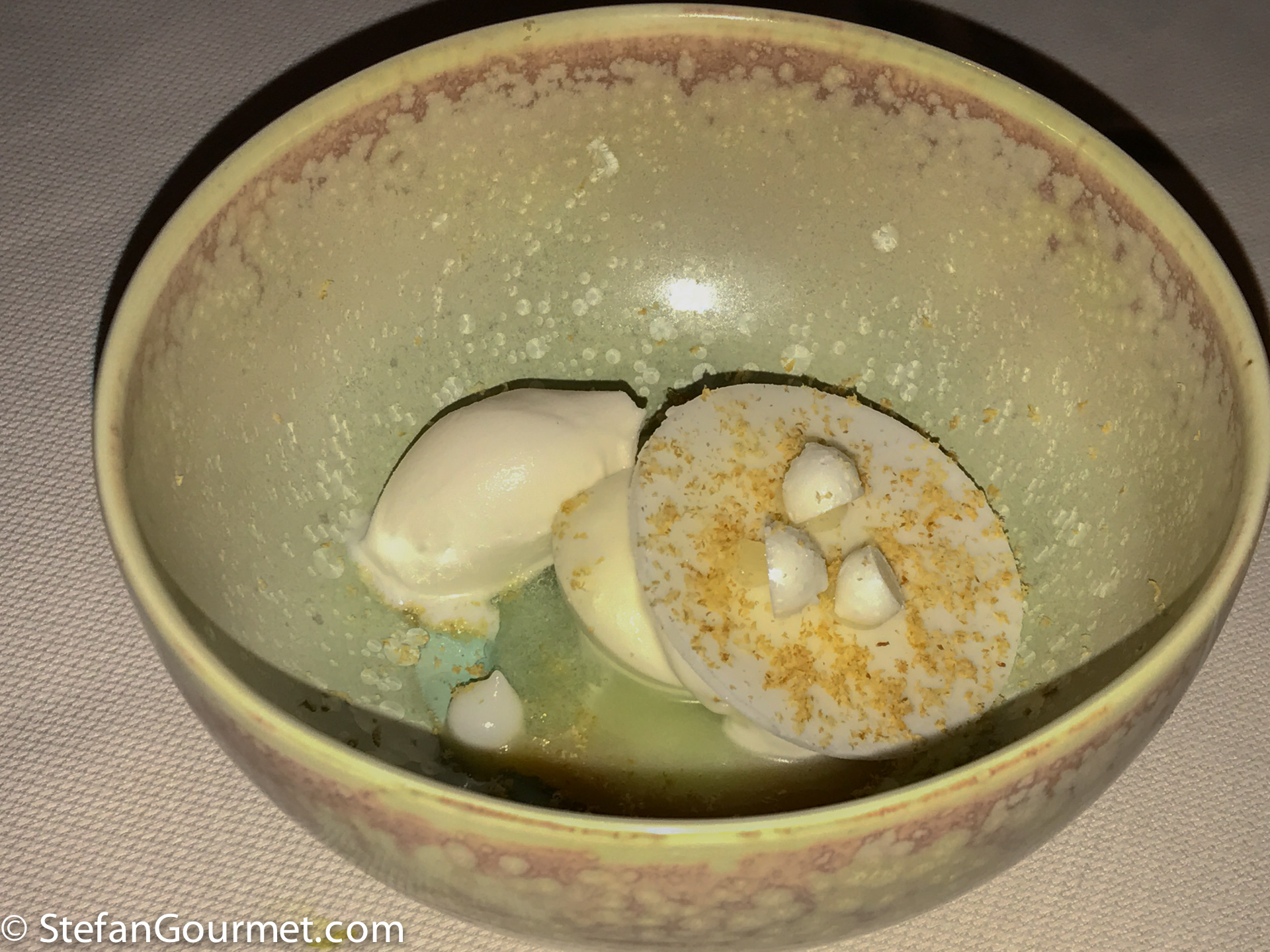 The menu started with North Sea crab with butternut squash, cream of kaffir lime leaf, lemongrass, and Buddha hand. The crab had a very nice tender texture and combined well with the different Asian fresh flavors. 9/10 The dish was paired with a Weissburgunder (Pinot Blanc) from Rheinhessen, Germany. The pairing was spectacular, as the different things on the plate all highlighted different aspects of the wine.